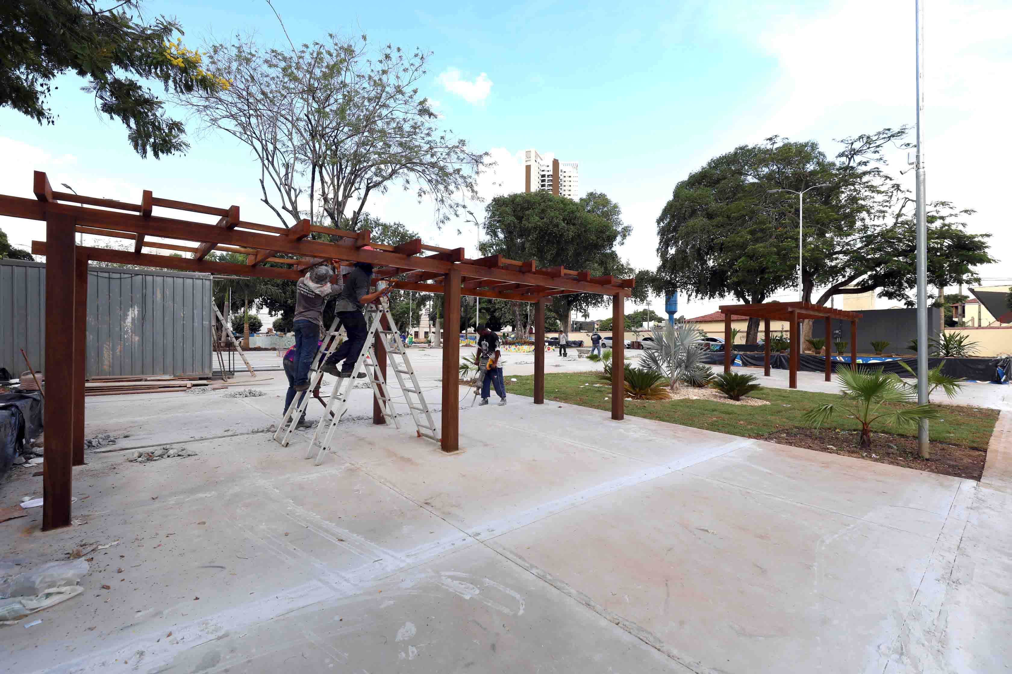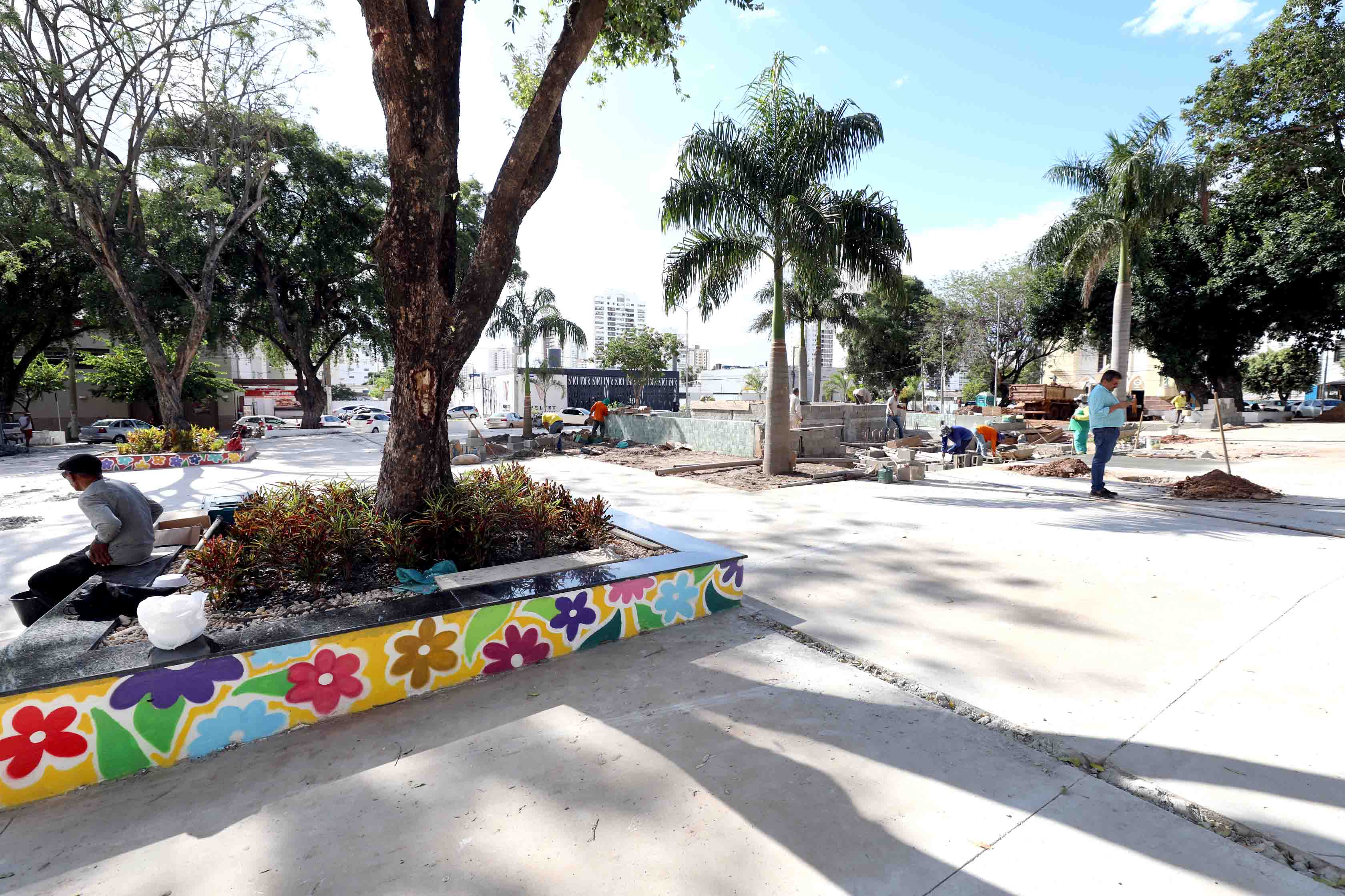 O trabalho no espaço de lazer abrange atividades como construção de um novo piso, criação de vagas de estacionamento, instalação de iluminação de LED, jardinagem, colocação de bancos e lixeiras. Além disso, está em construção no centro da praça uma fonte luminosa que embelezará ainda mais o equipamento público.