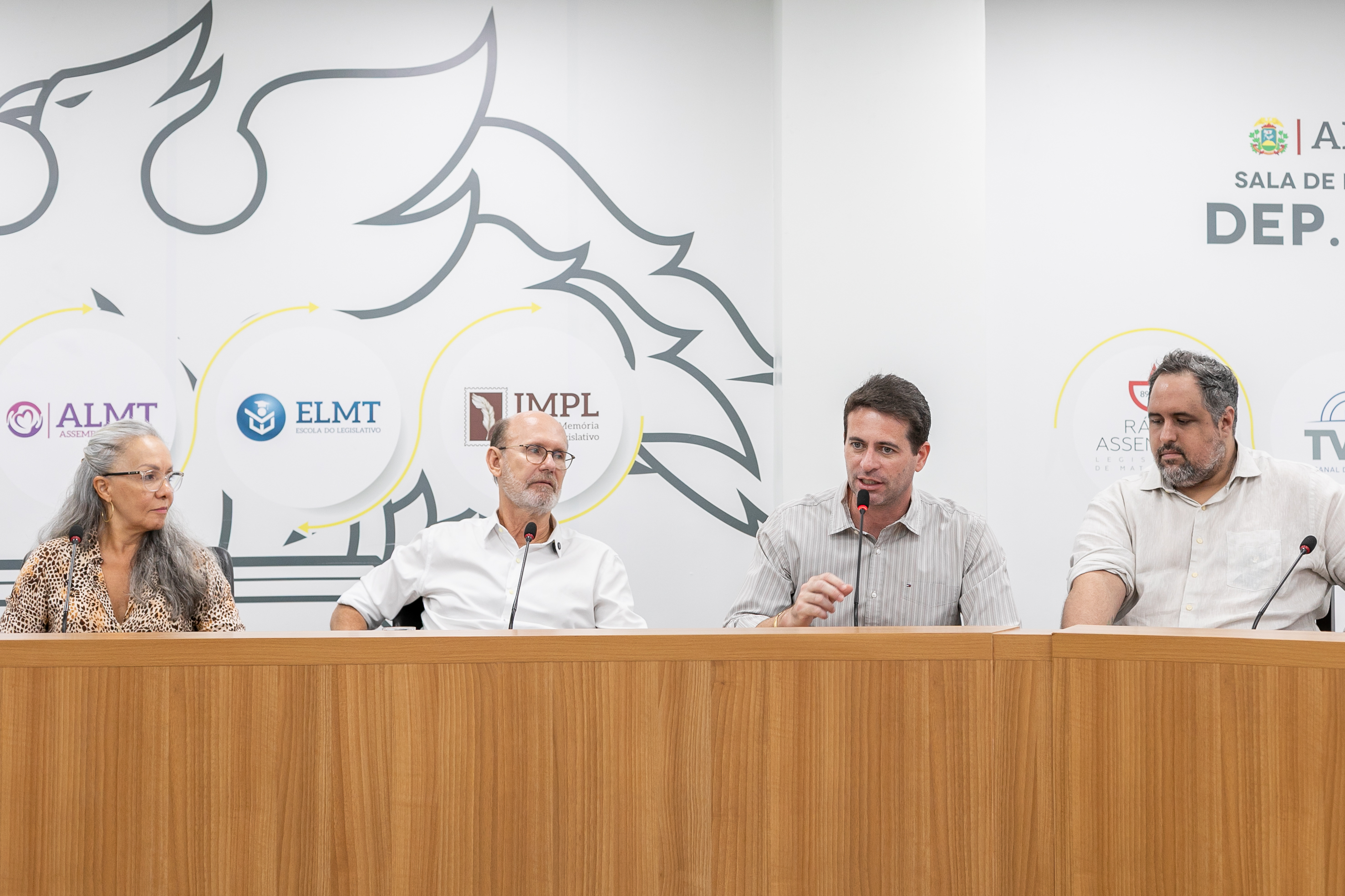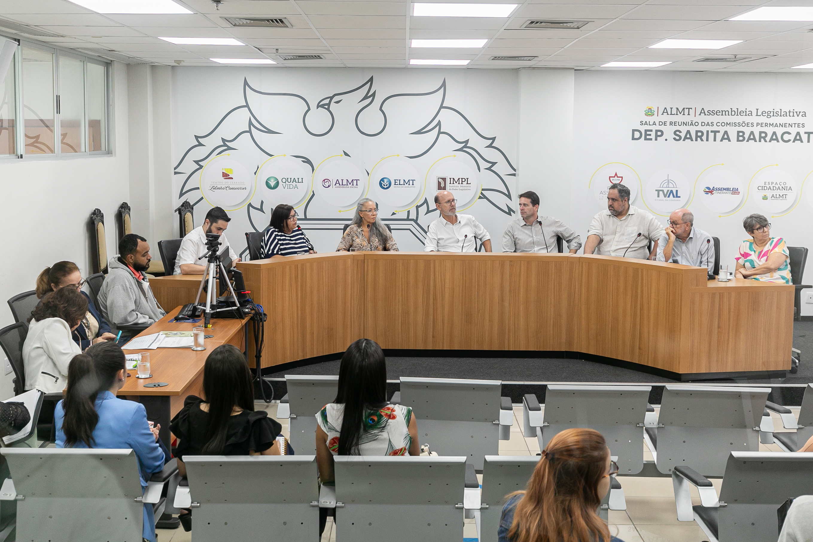 A imagem mostra um grupo de pessoas reunidas em uma sala de reuniões localizada na Assembleia Legislativa de Mato Grosso. O encontro discute temas relacionados à saúde mental, com a participação de profissionais da área. Todos estão dispostos ao redor de uma bancada de cor amadeirada, e as paredes da sala são brancas, com letreiros que identificam a instituição.