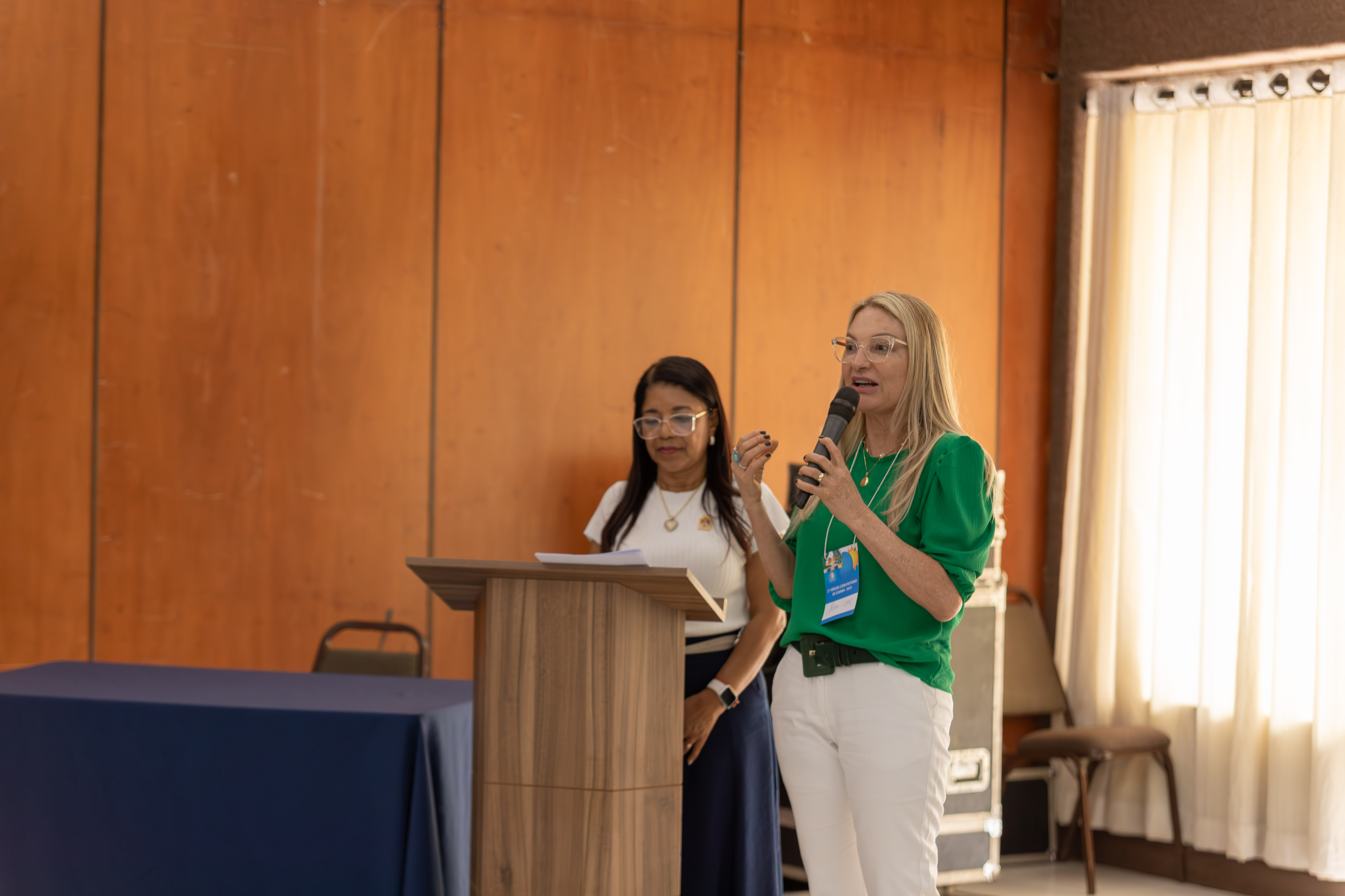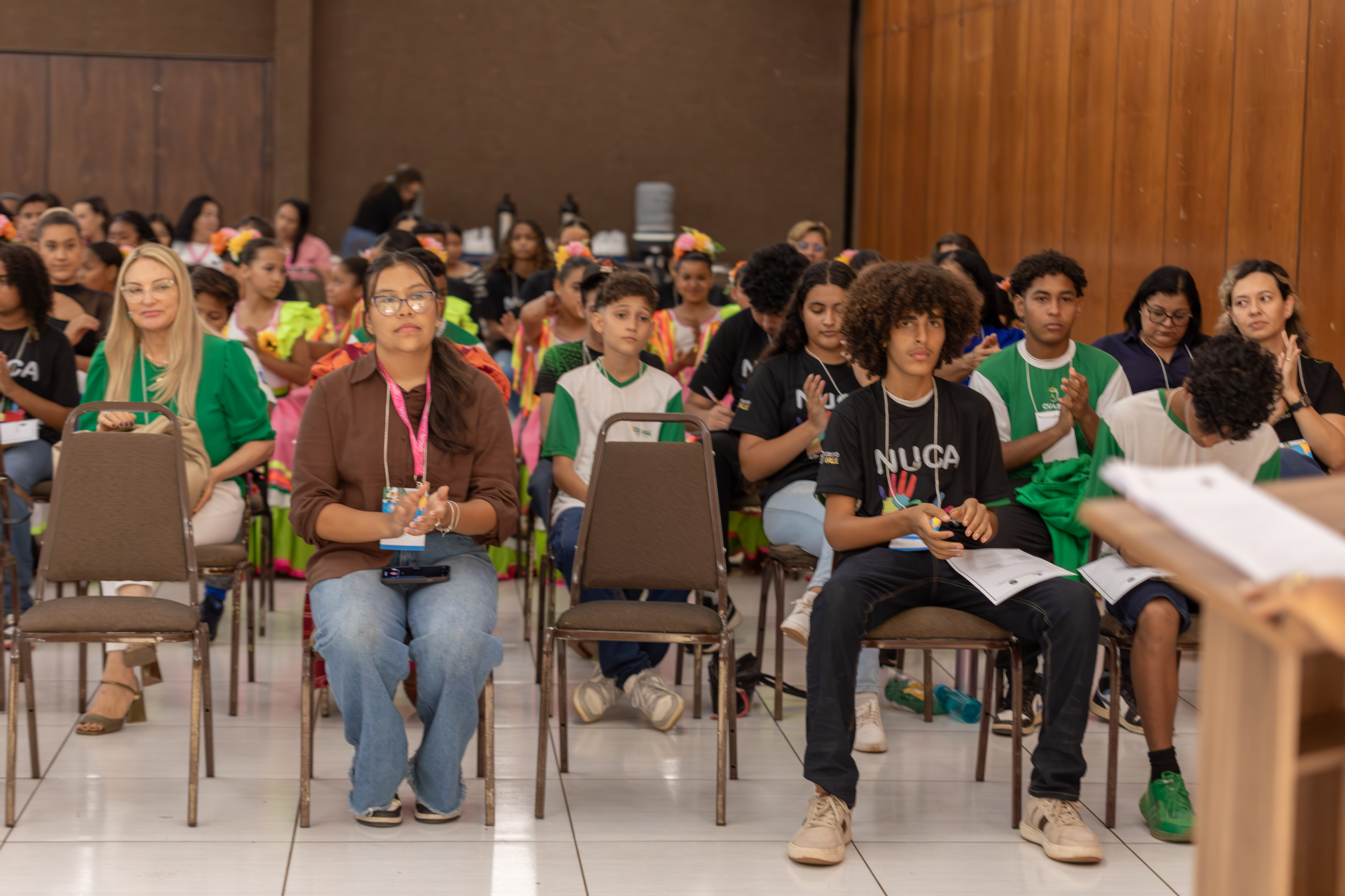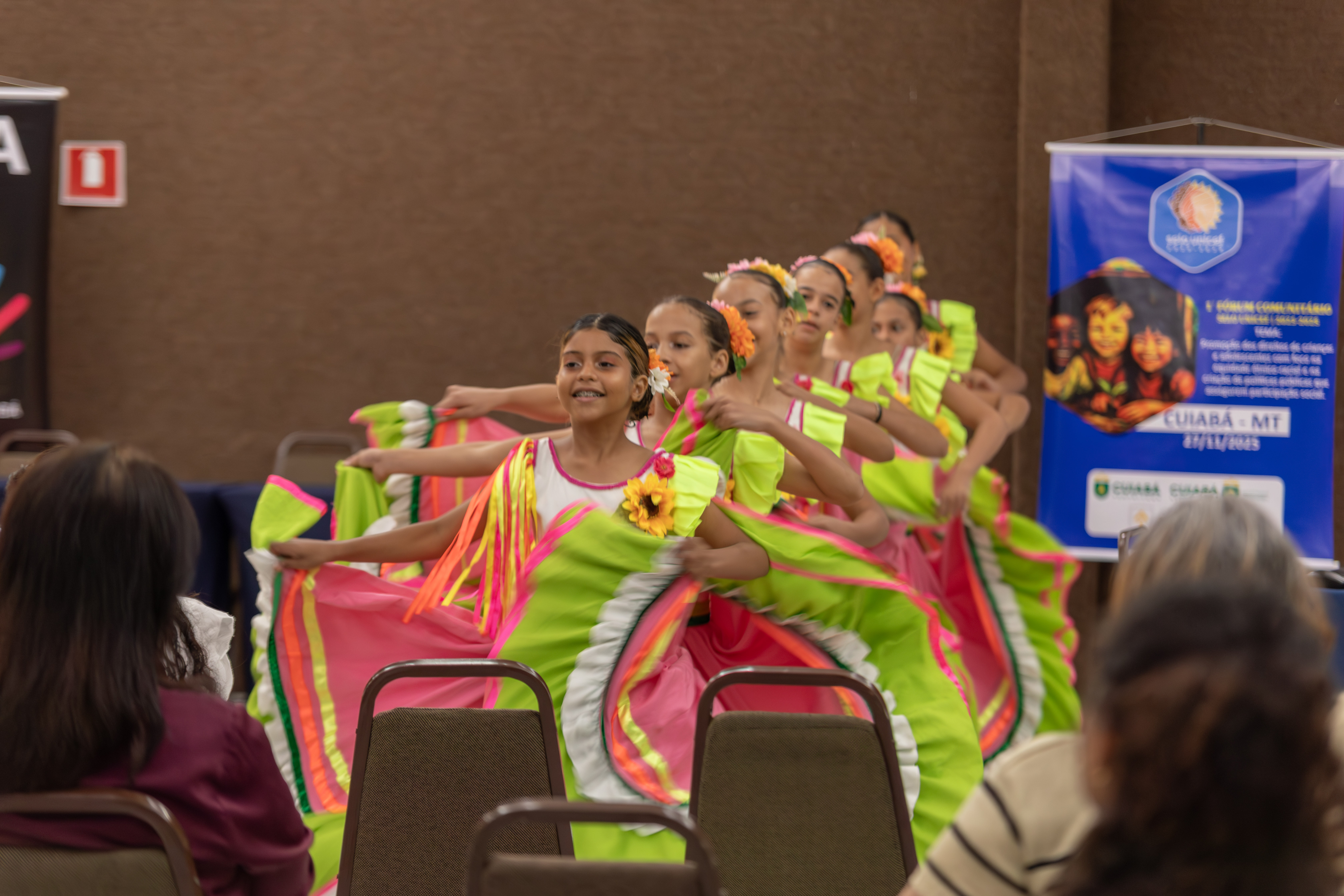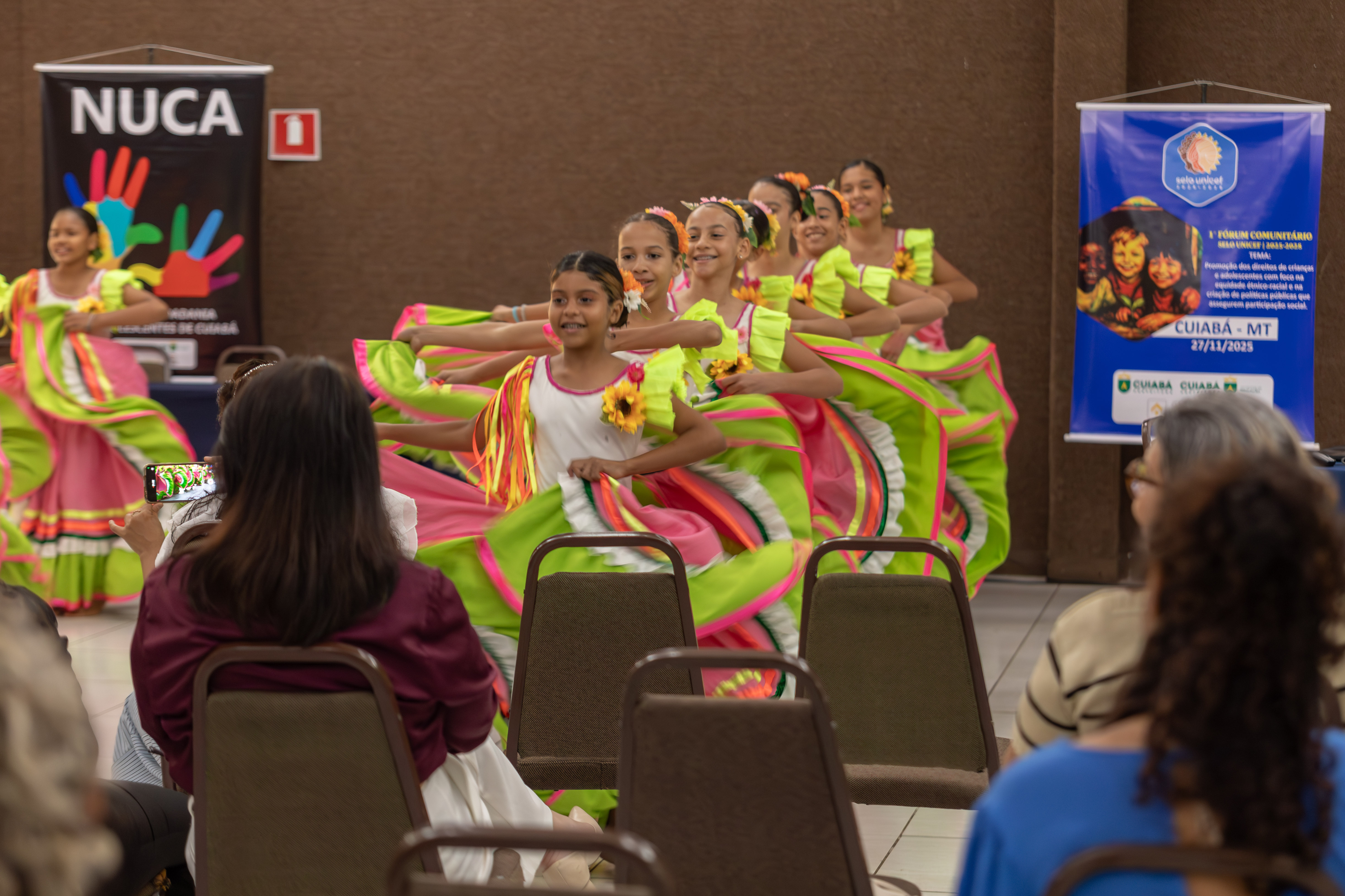 Um dos momentos mais marcantes da tarde foi a participação das adolescentes do Projeto Siminina, que inauguraram o fórum com uma apresentação vibrante de siriri. A dança tradicional mato-grossense simbolizou o protagonismo juvenil buscado pelo Selo UNICEF e deu o tom de acolhimento e identidade cultural ao encontro. As apresentações foram seguidas de falas de mobilizadores, professores, conselheiros tutelares e representantes das secretarias, que ressaltaram a importância da atuação conjunta.