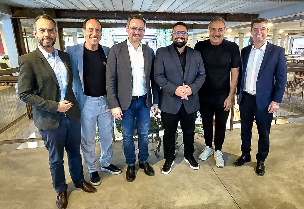 A imagem mostra os secretários de Turismo e Desenvolvimento Econômico, Fernando Medeiros e Gustavo Vandoni, acompanhados por Bernard Martins (diretor do Mercado de Origem BH), Carlos Henrique Guedes (CEO da TSX Invest), Elias Tergilene (Grupo UAI e Fundação Doimo) e Gustavo Nascimento (vice-presidente da FCDL-MT). Todos posam para a foto.