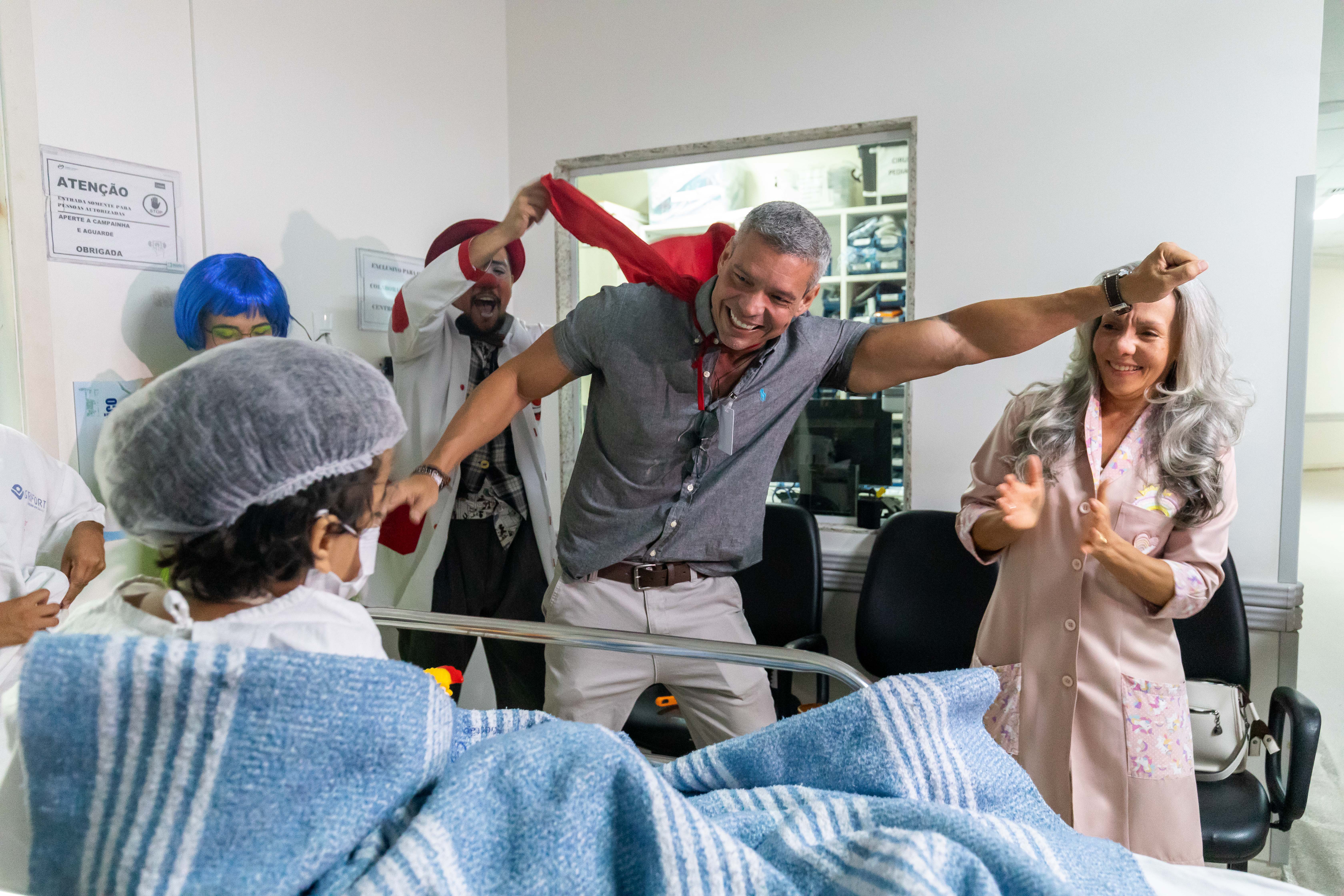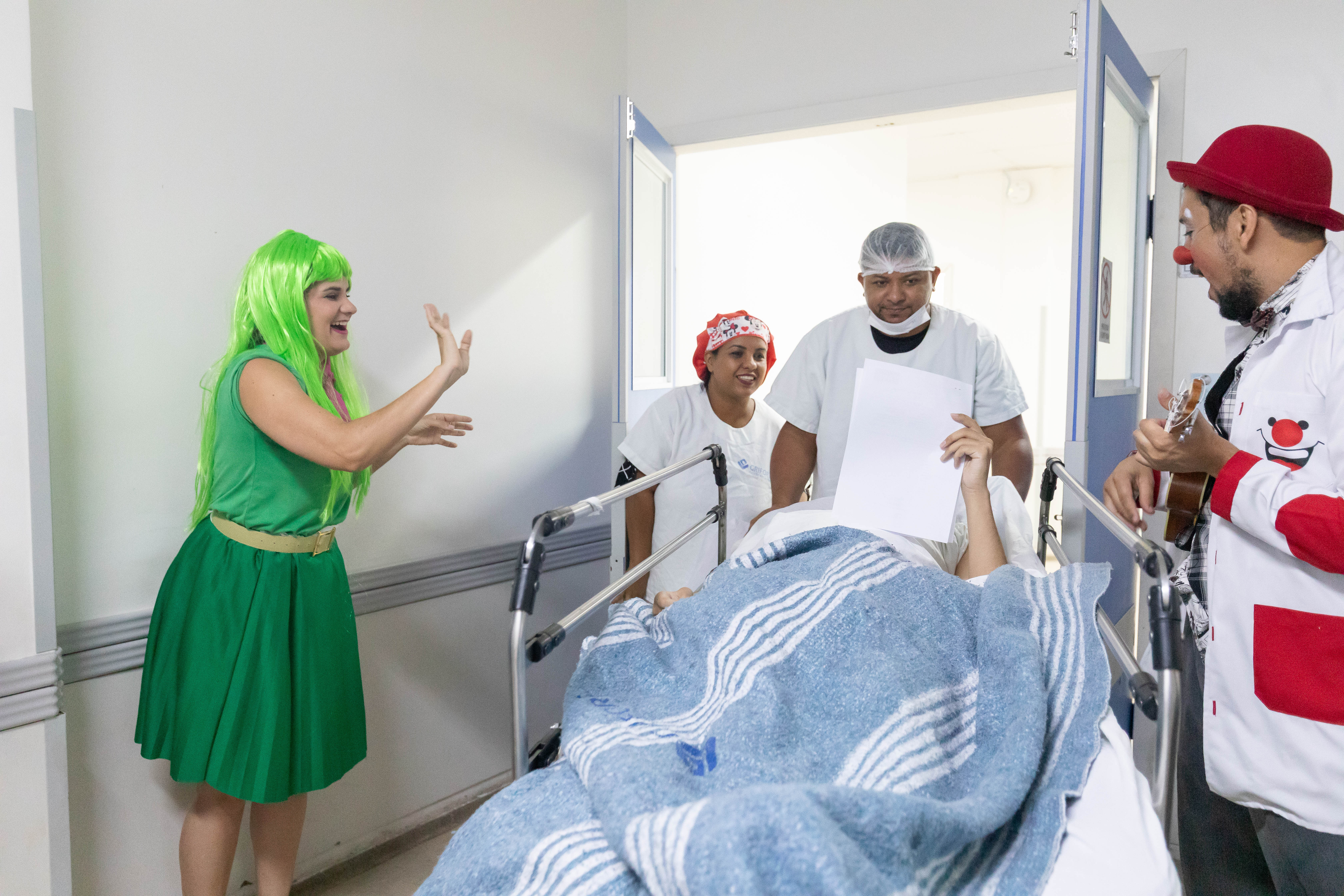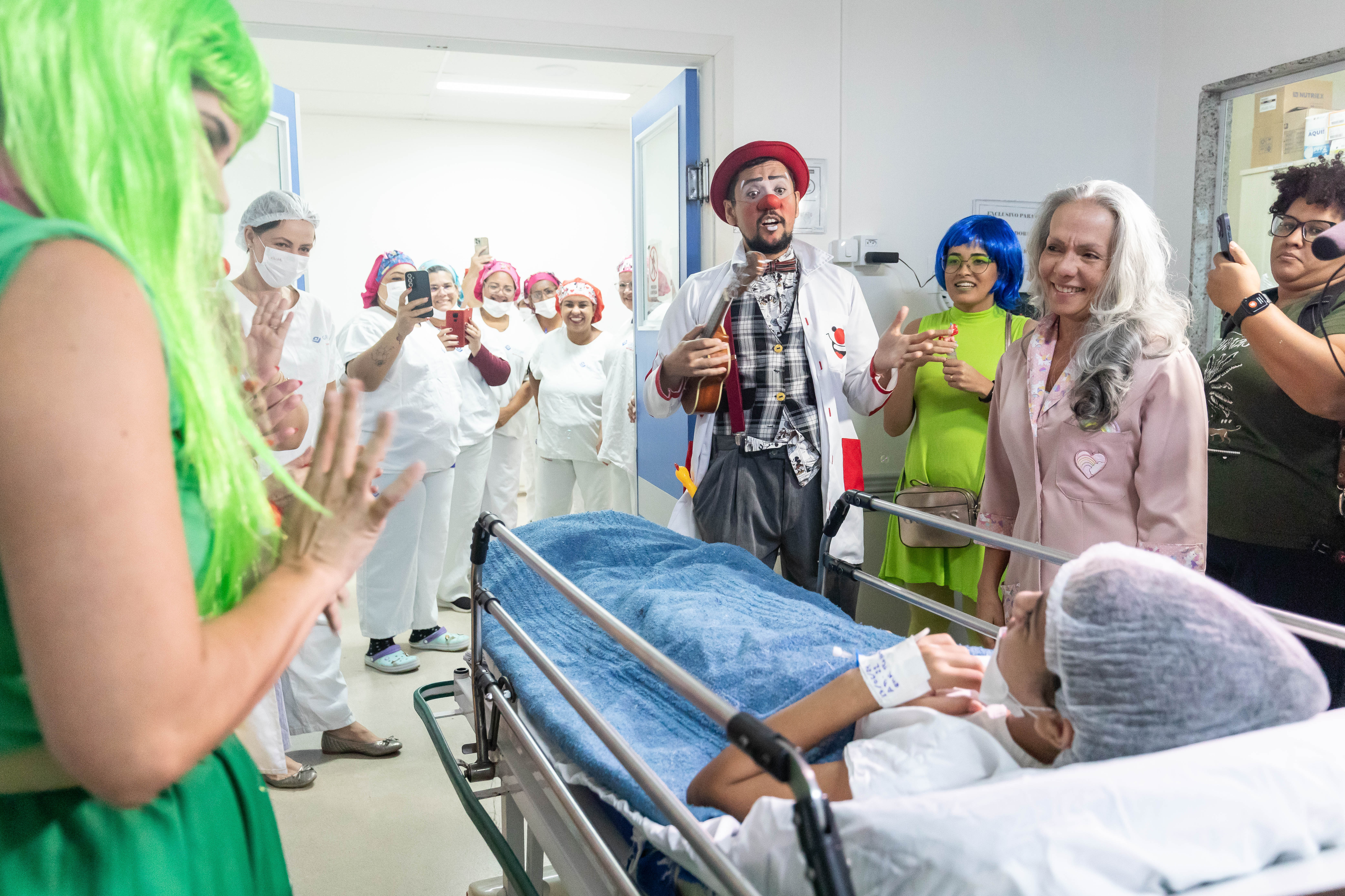 A foto mostra a equipe lúdica do HMC com fantasias, interagindo com um paciente beneficiado pelo mutirão. A secretária de Saúde, Lúcia Helena, acompanha a ação. Todos sorriem e o clima do ambiente é descontraído.