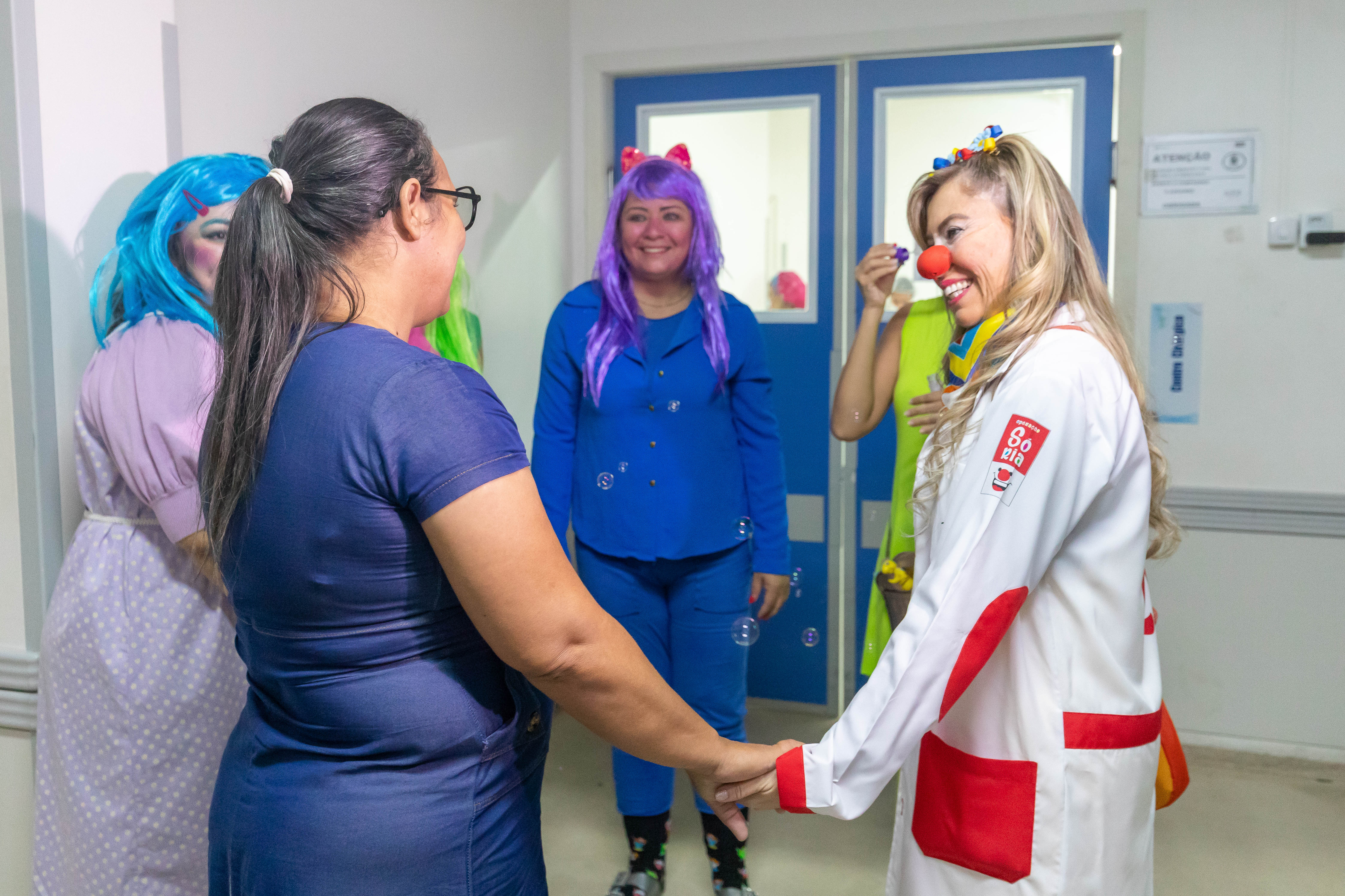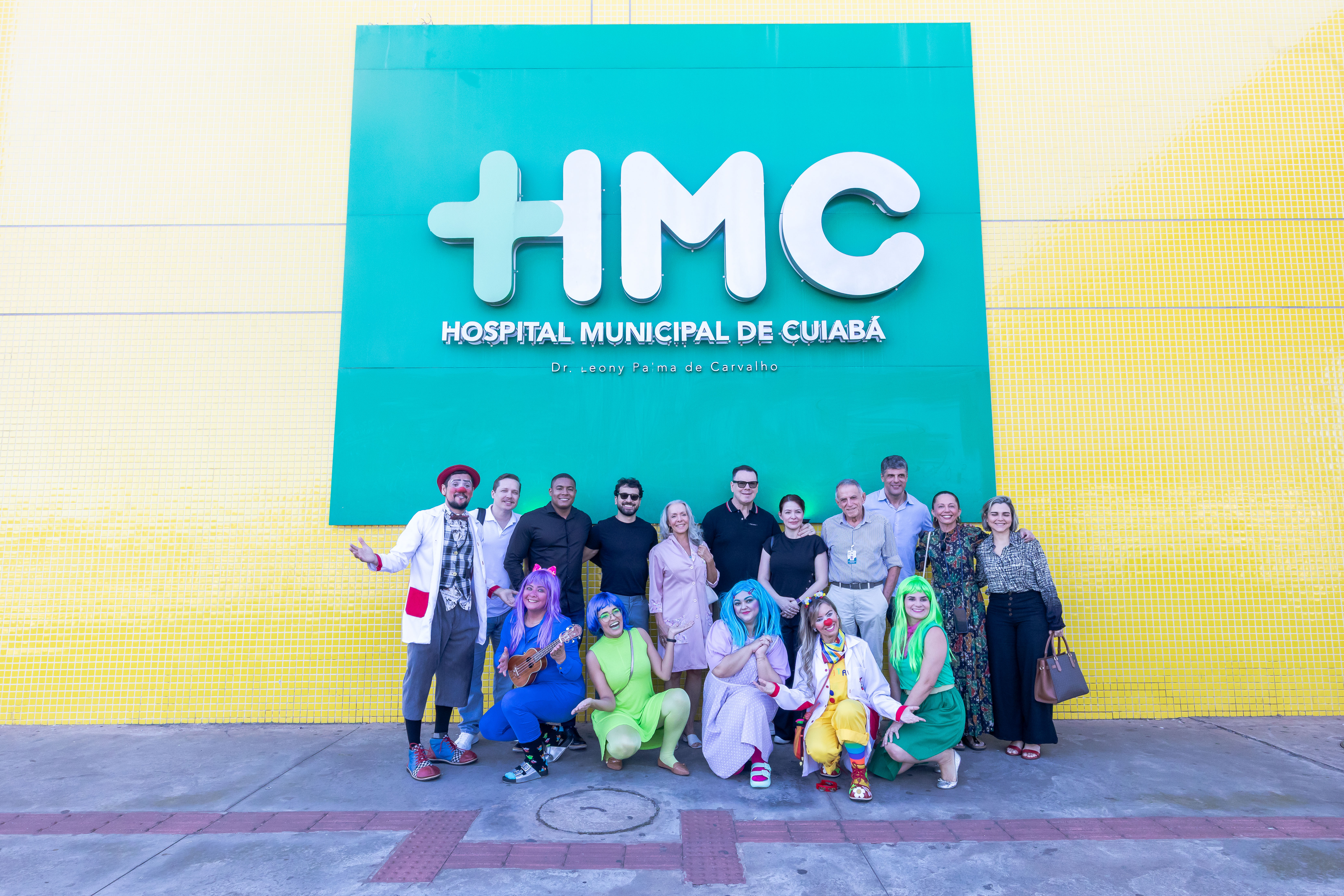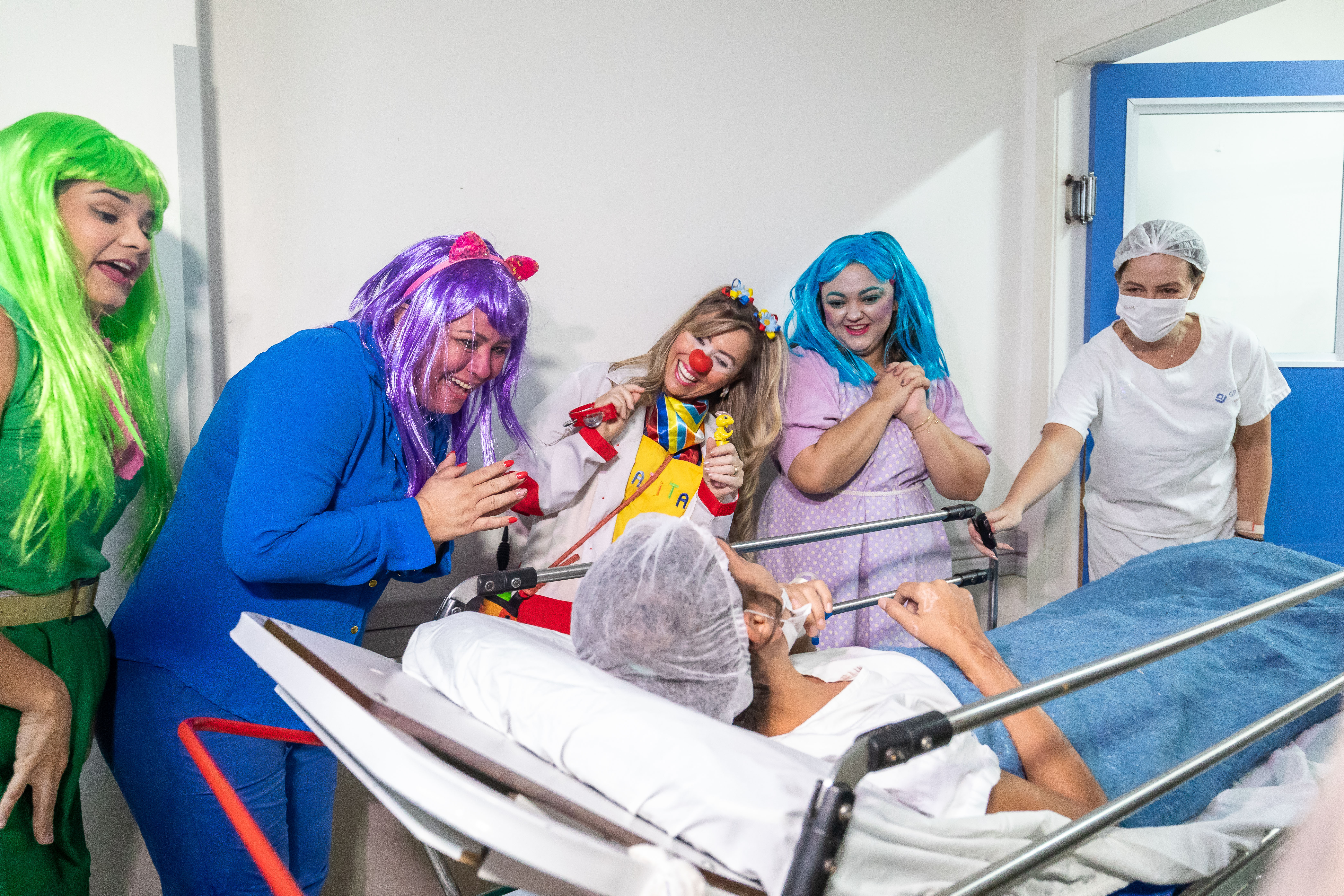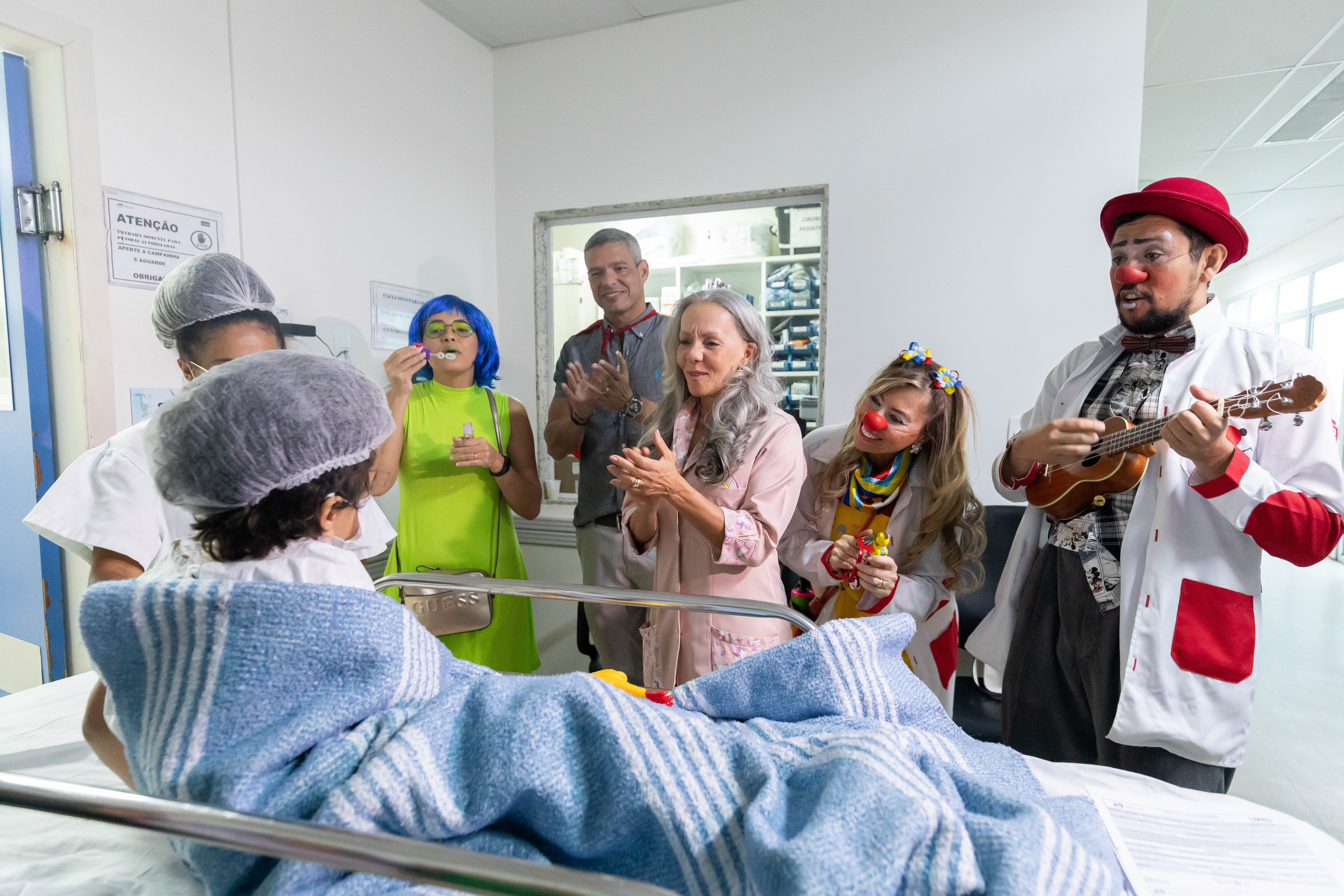 A foto mostra a equipe lúdica do HMC com fantasias, interagindo com um paciente beneficiado pelo mutirão. A secretária de Saúde, Lúcia Helena, acompanha a ação. Todos sorriem e o clima do ambiente é descontraído.