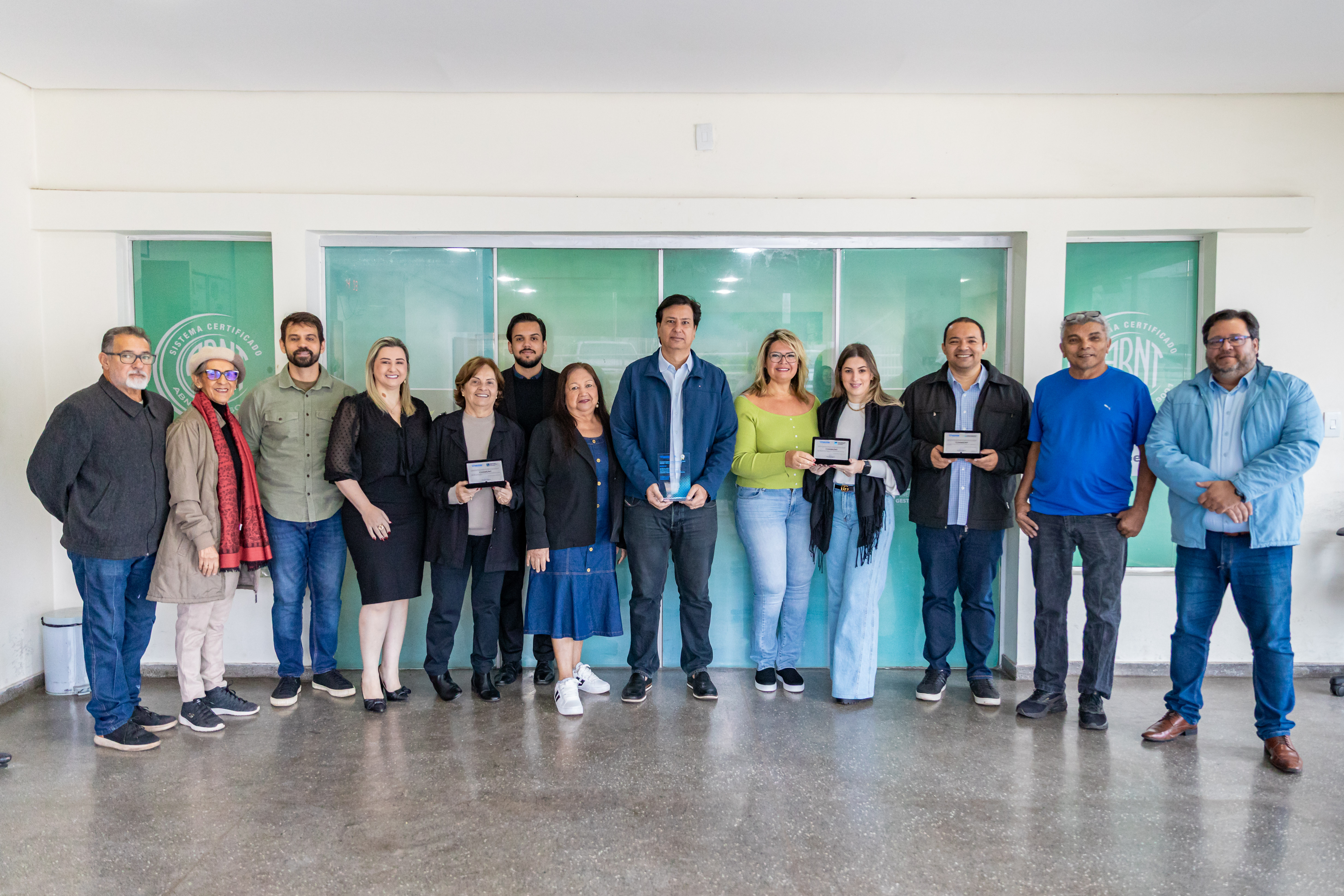 A foto ilustra um grupo de servidores públicos, formado por homens e mulheres, todos em pé, posando para uma foto. Três deles exibem as placas de metal que são as premiações recebidas pelo Cuiabá-Prev.