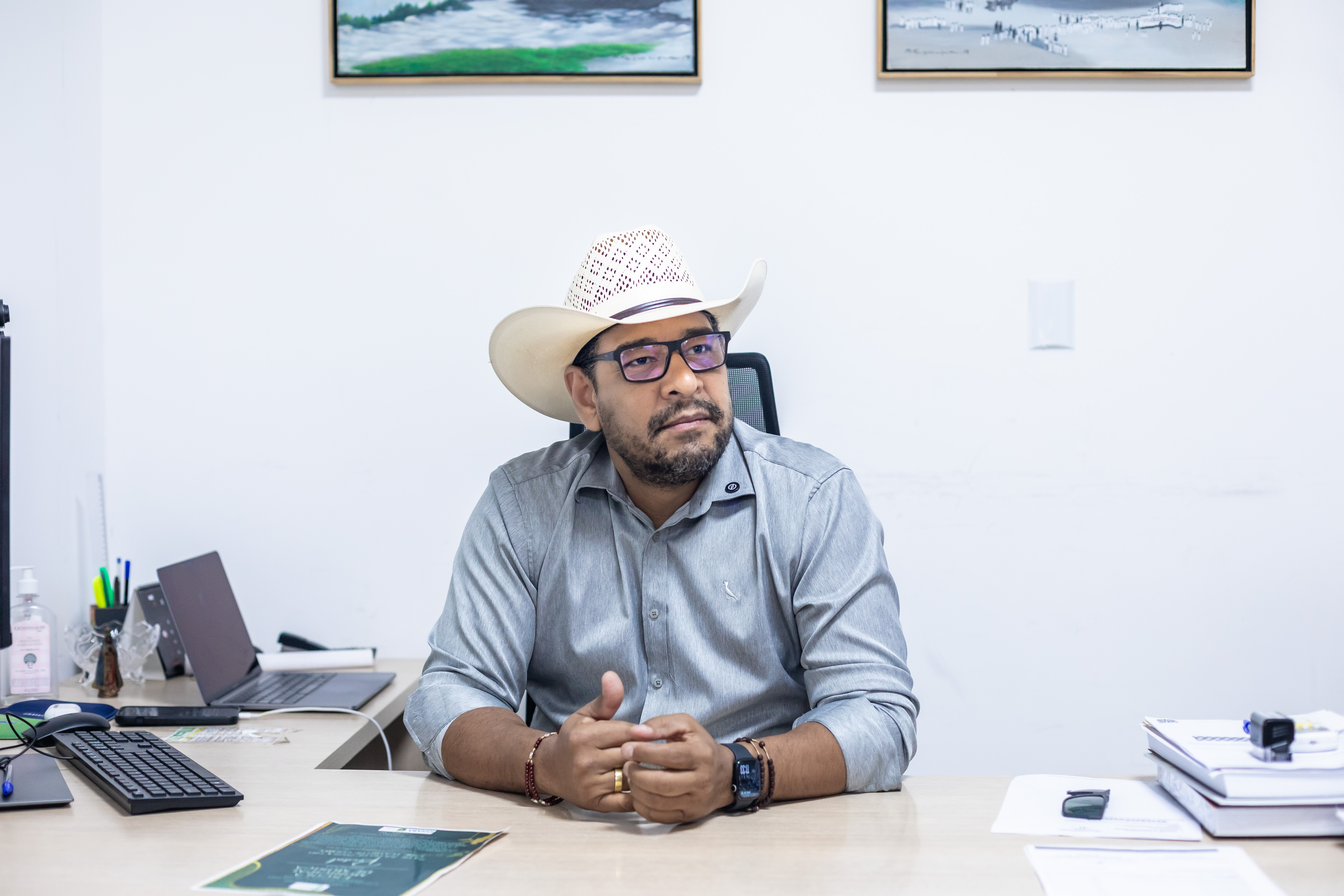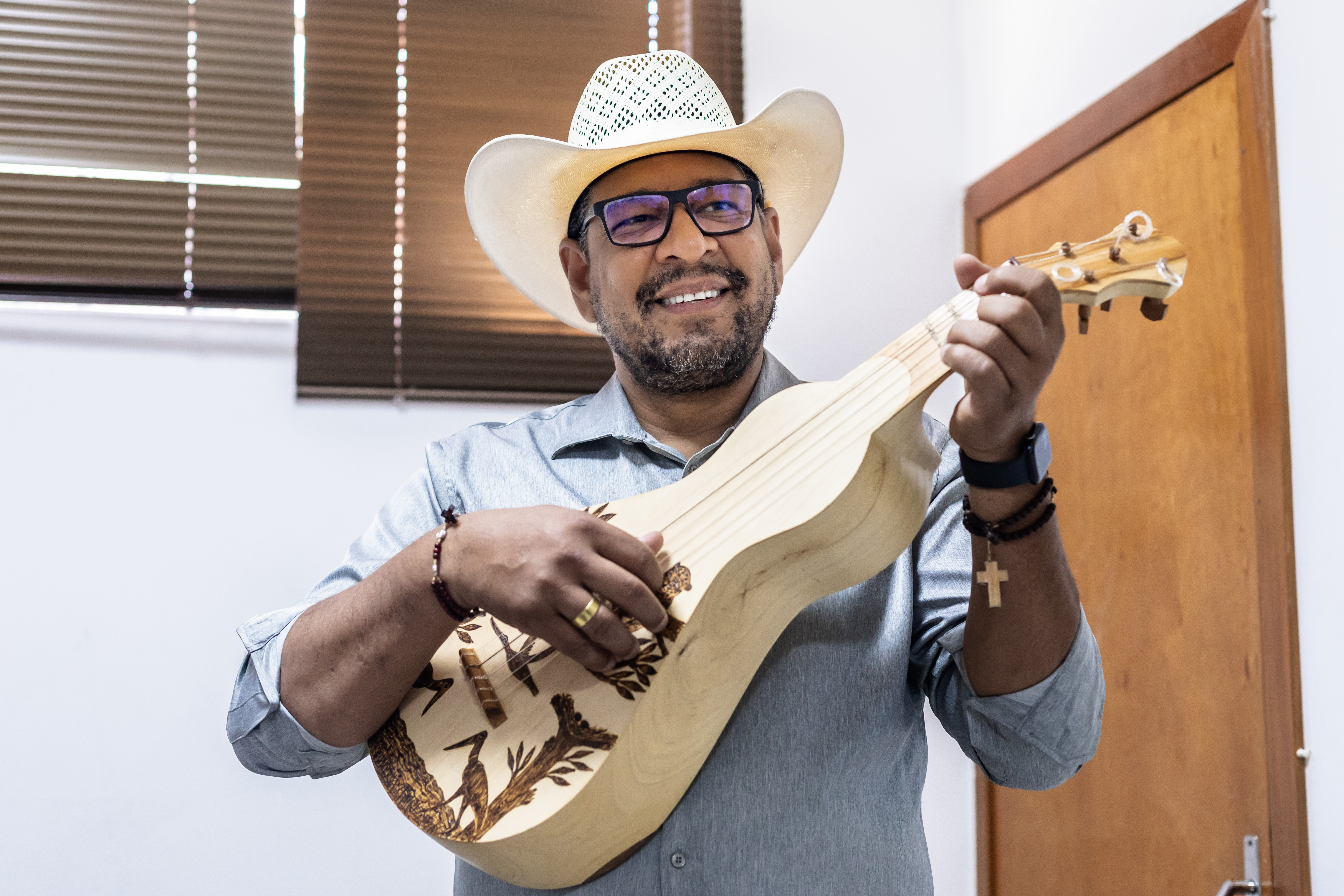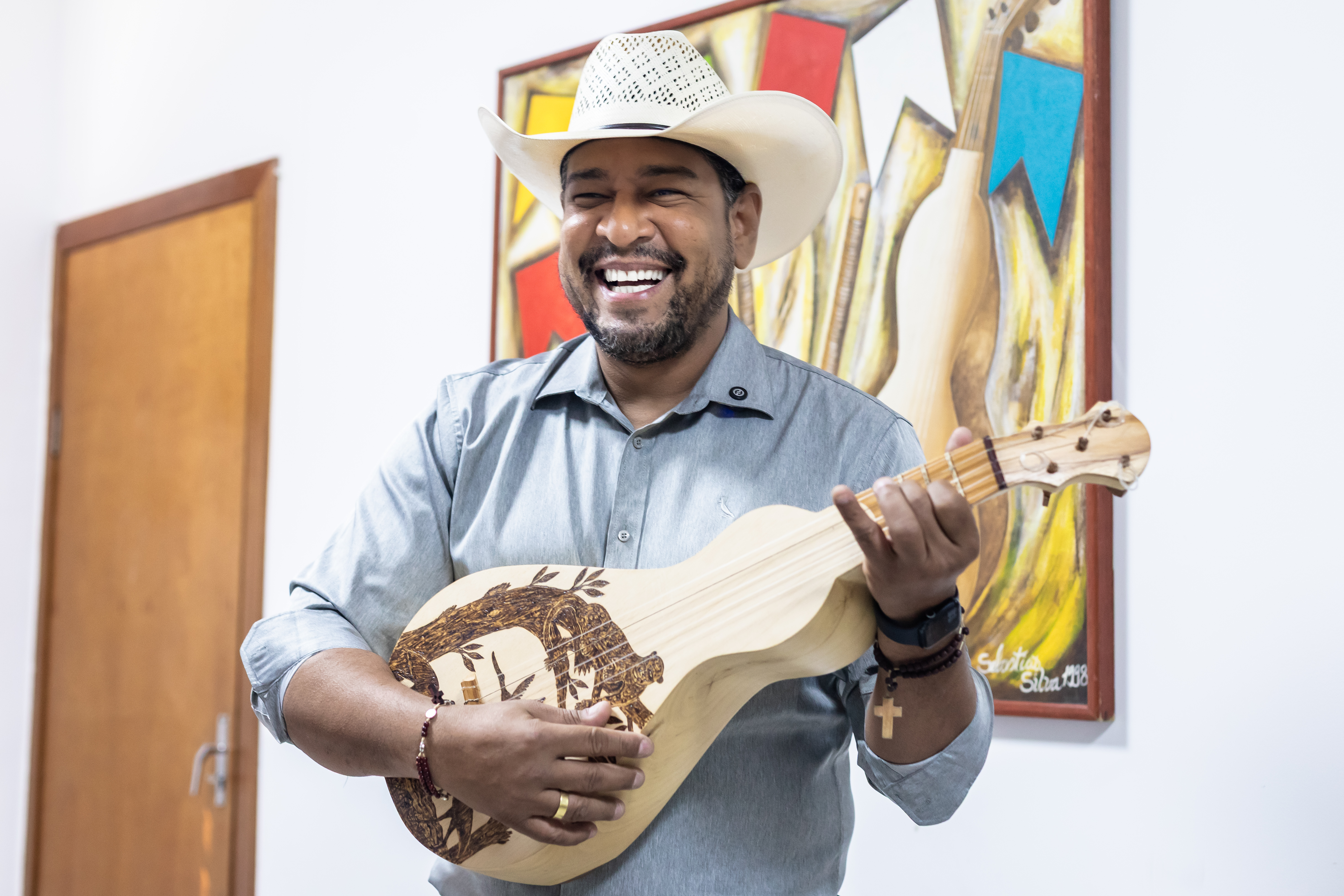 A foto mostra o secretário Johnny Everson em pé, sorridente, dedilhando as cordas de uma viola de cocho. O cenário exibe também a pintura de um quadro com violas de cocho e bandeirinhas coloridas.