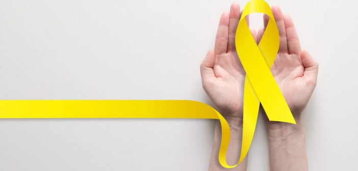 A imagem mostra as mãos de uma pessoa segurando uma faixa amarela, em alusão à campanha Julho Amarelo.