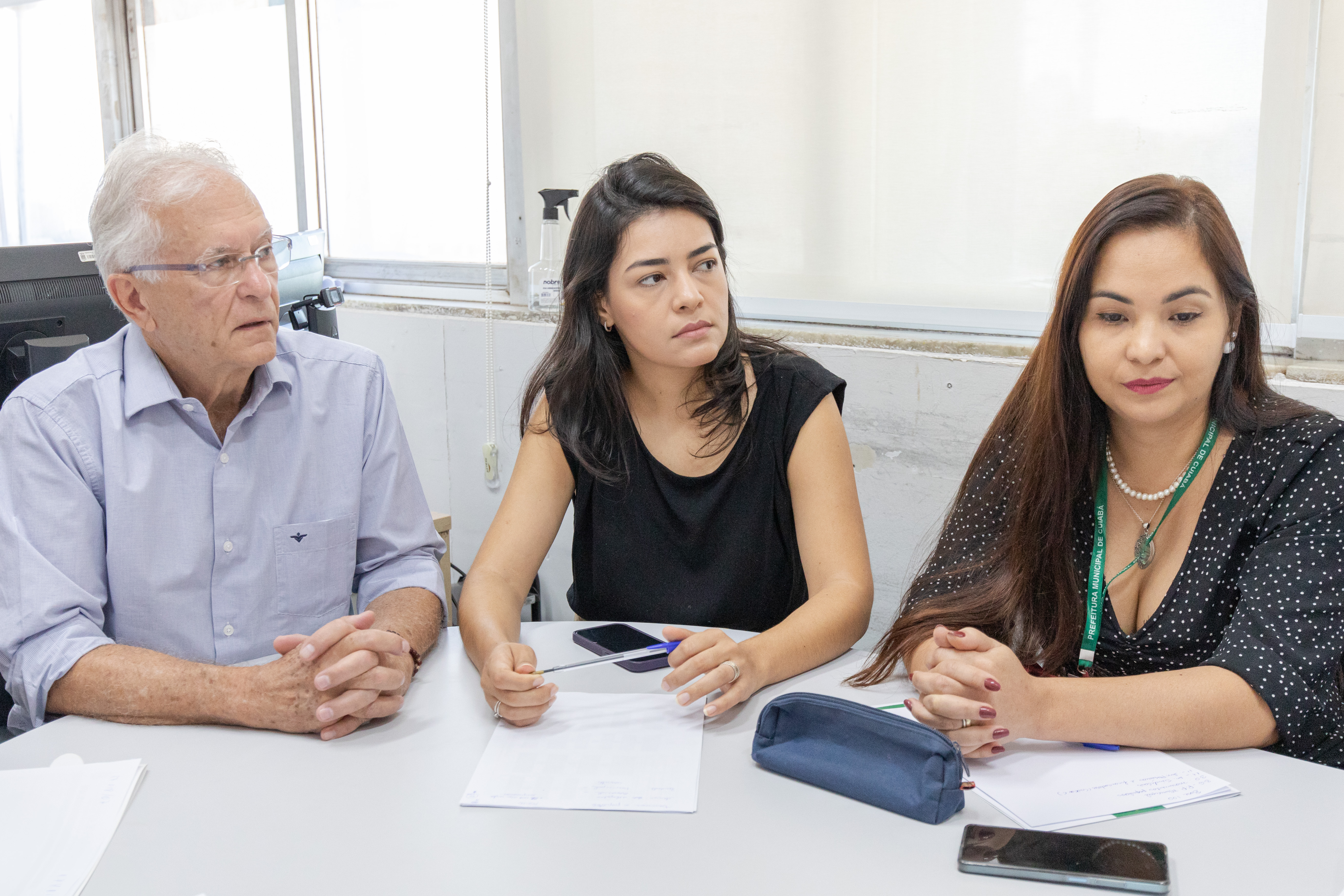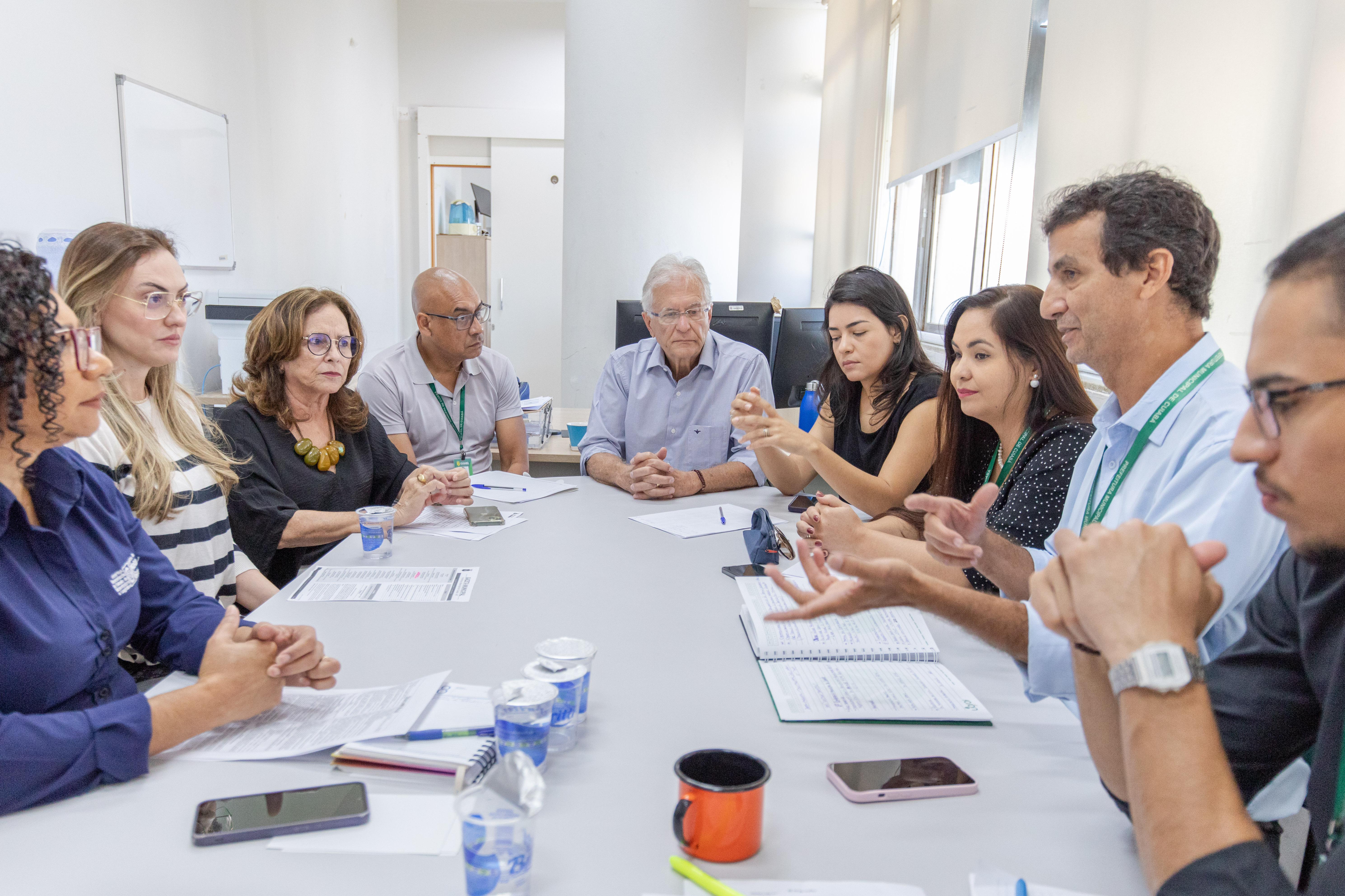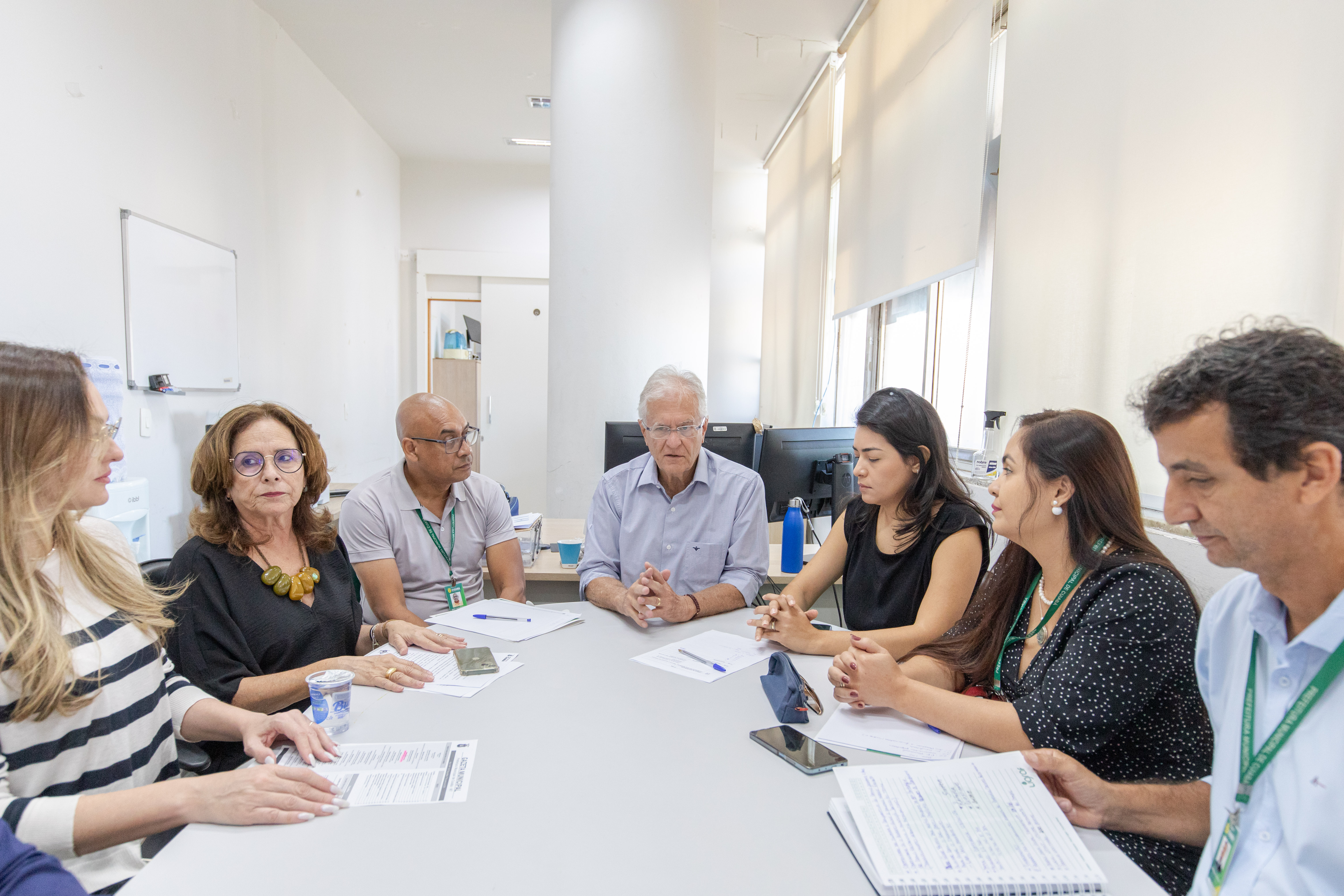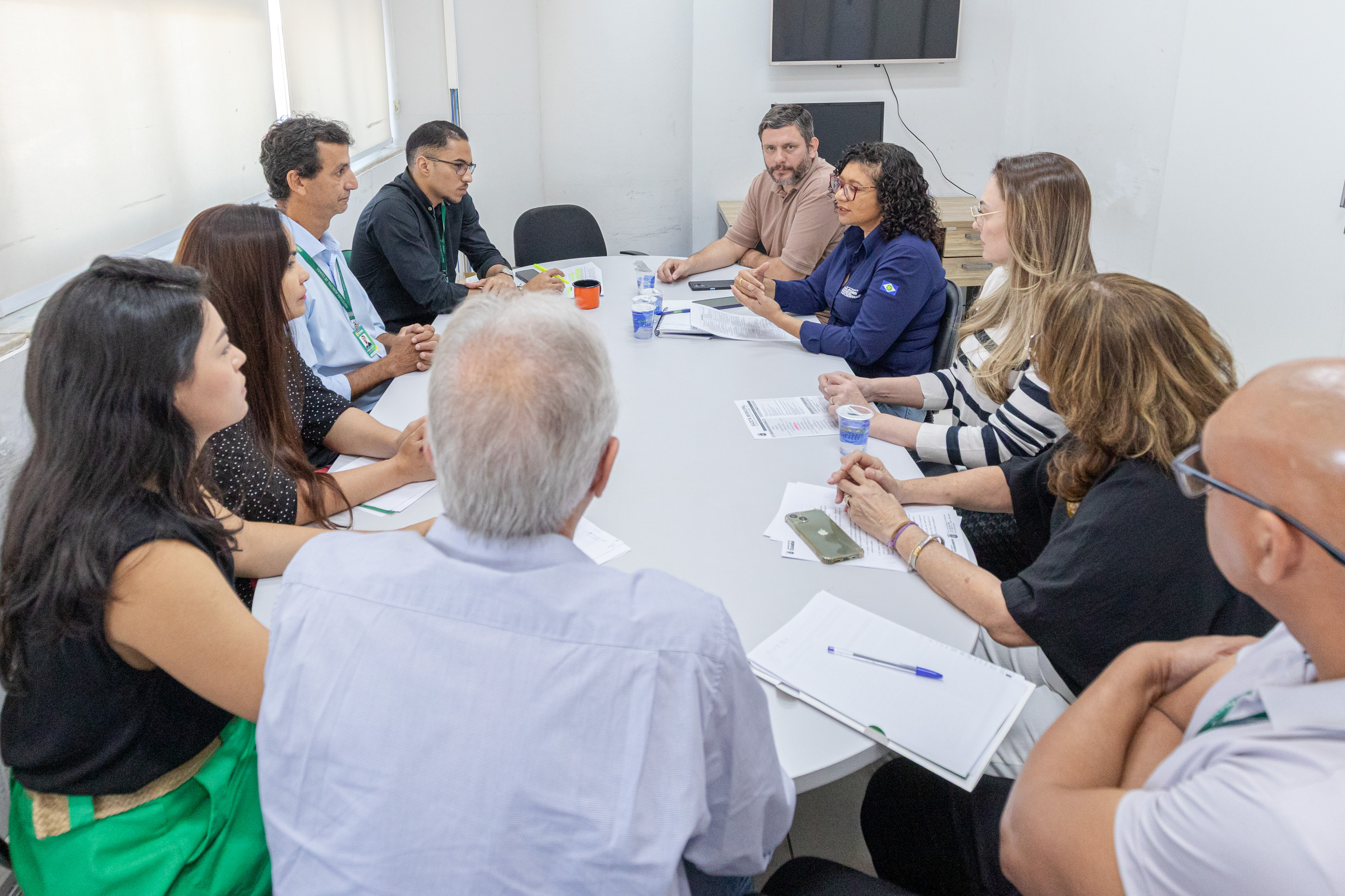 A foto mostra várias pessoas, integrantes da equipe organizadora, ao redor de uma mesa de reunião. Trata-se de uma sala ampla e com boa claridade.