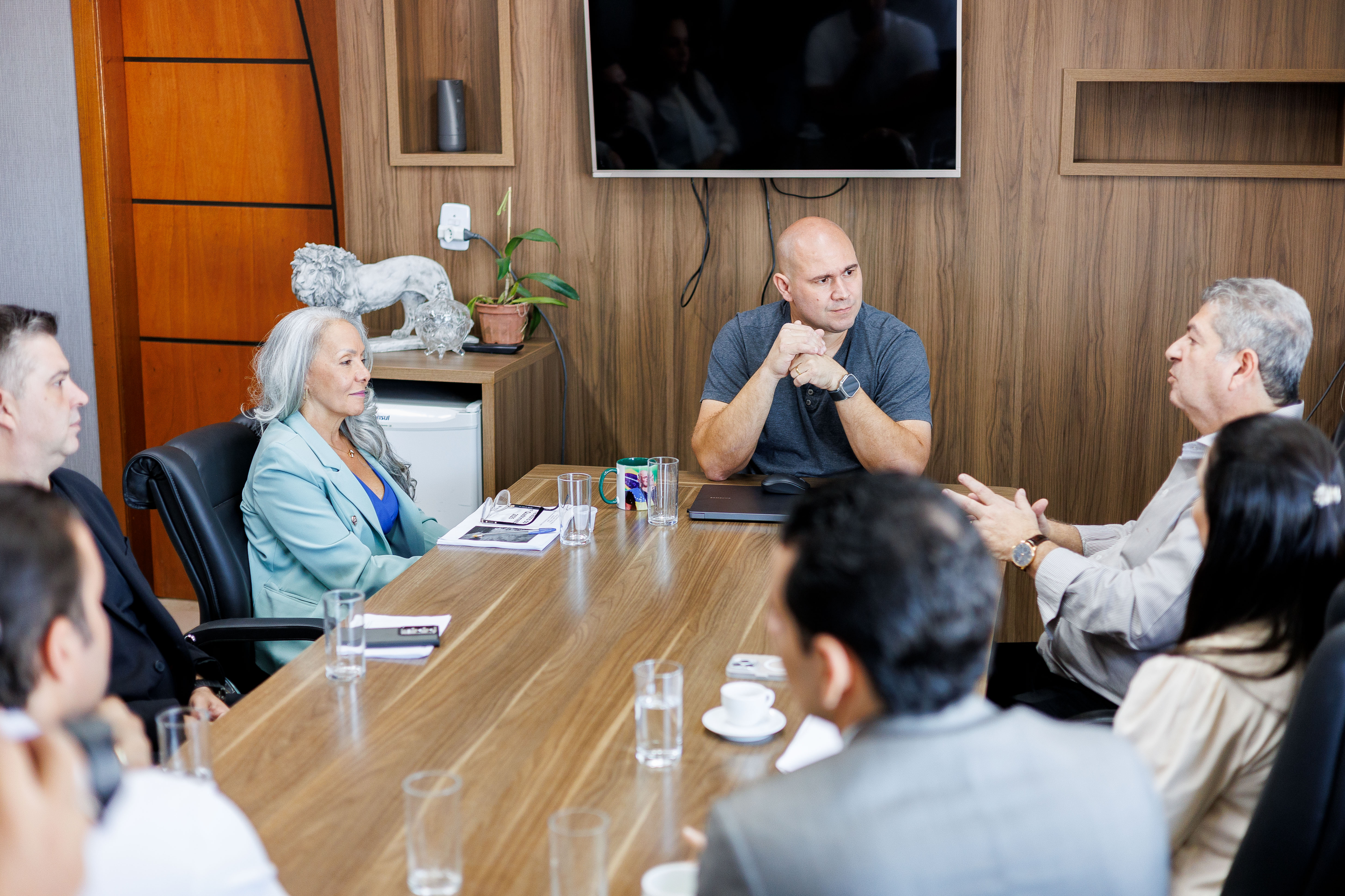 A imagem mostra o prefeito de Cuiabá sentado ao fundo de uma mesa oval com várias pessoas em uma sala de reuniões. Ao seu lado esquerdo está o conselheiro Guilherme e, ao seu lado oposto, a secretária municipal de Saúde, Lúcia Helena.