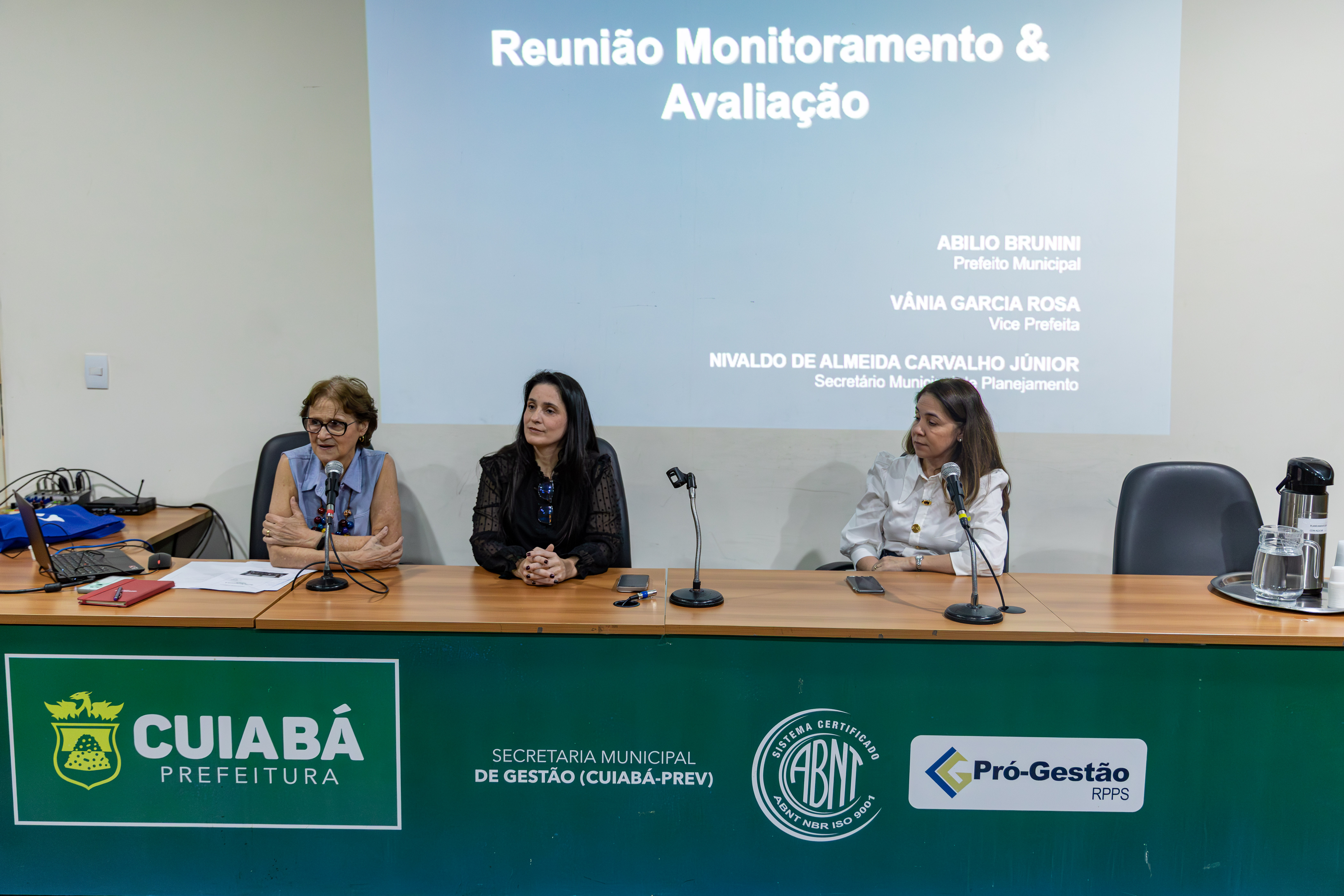 A foto ilustra três mulheres integrantes da Secretaria de Planejamento sentadas em cadeiras individuais apoiadas numa mesa de madeira. No fundo, há uma tela de cor azul com letras brancas em destaque ilustrando às palavras "Reunião Monitoramento & Avaliação.
