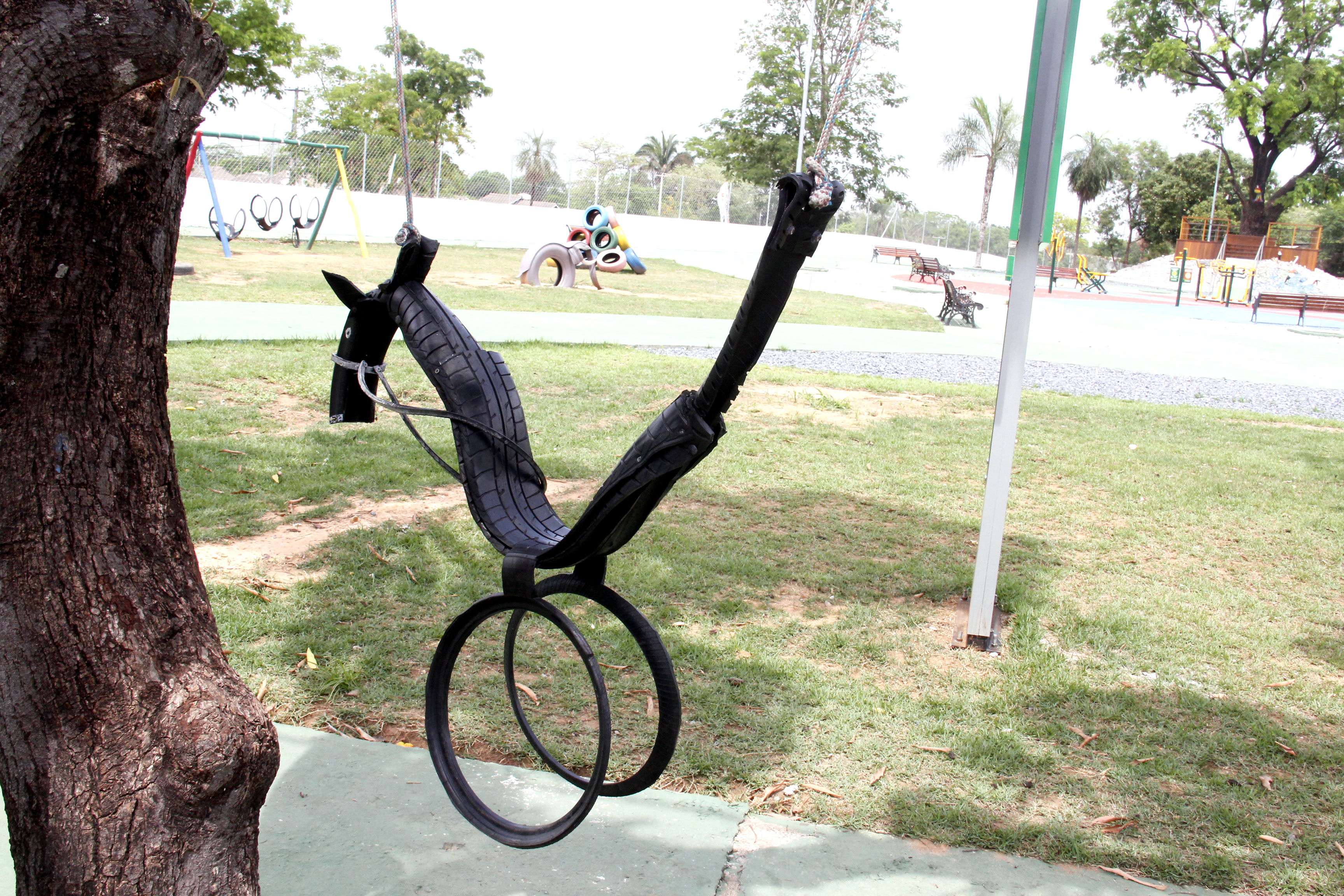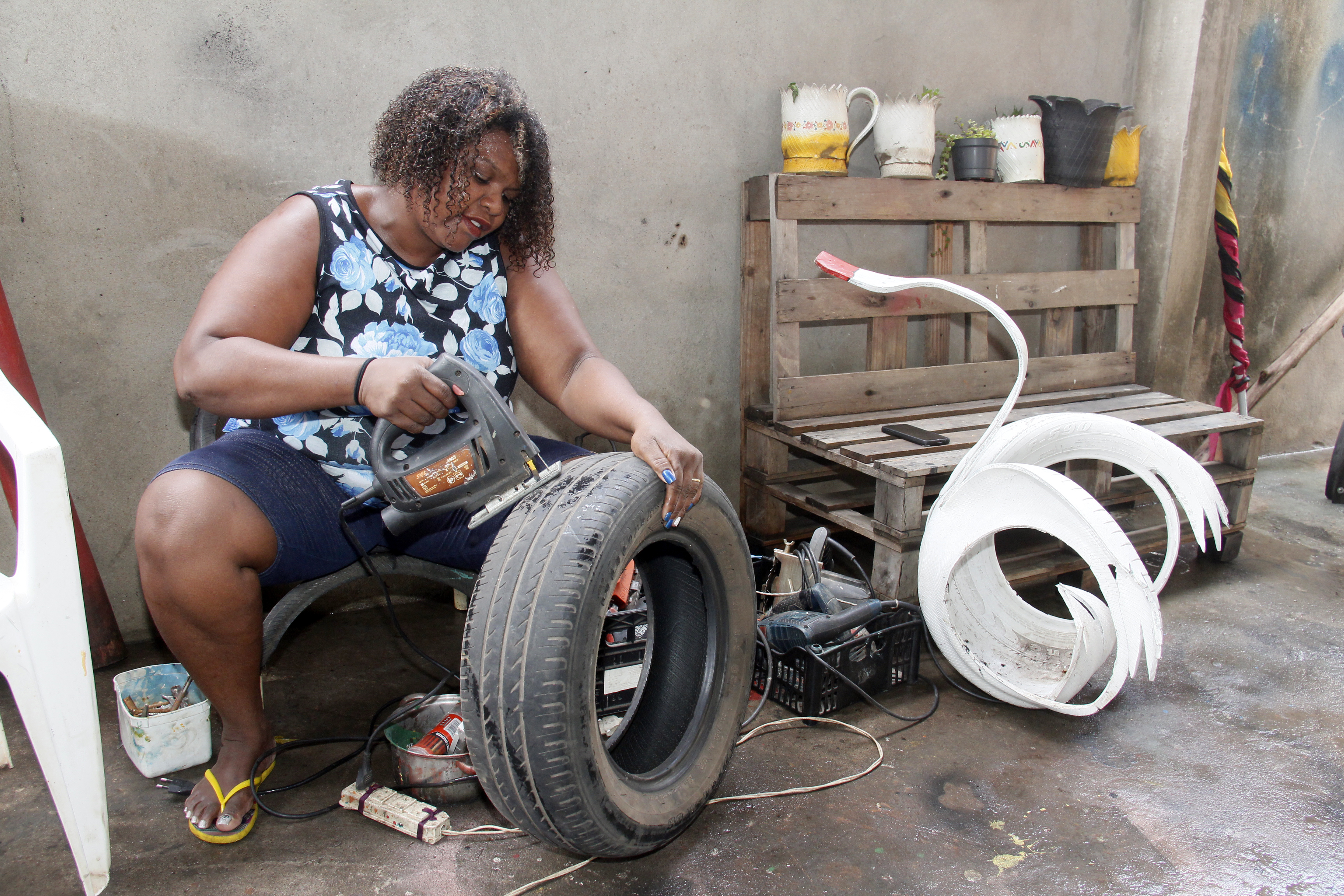 Uma série de ferramentas nas mãos, dezenas de pneus e muita disposição. Essa é a formula diária que a moradora do bairro Pedra 90 — na periferia de Cuiabá, Miriam Oliveira, de 47 anos, utiliza para transformar o material de borracha em verdadeiras obras-primas. Com o auxílio do esposo, Valdecir Júlio, também de 47 anos, Miriam faz dessa atividade sua única fonte de renda e, ao mesmo tempo, colabora com a cidade em pelo menos dois importantes pontos: a sustentabilidade e o combate ao mosquito Aedes aegypti.