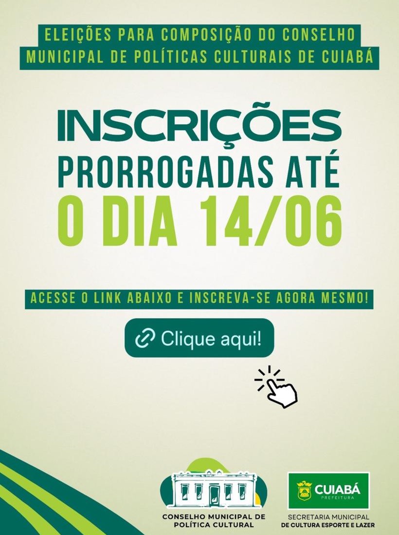 Prorrogado por mais uma semana, o prazo para que a classe artística, produtores e técnicos culturais participem do processo de escolha dos novos membros do Conselho Municipal de Política Cultural de Cuiabá para o biênio 2024-2026. Os interessados terão até o dia 14 (sexta-feira) para fazer a inscrição. Basta acessar o link https://cmpc.cuiaba.mt.gov.br/votaculturapmc/com.votacultura.wportal e fazer o registro, garantindo assim a participação.