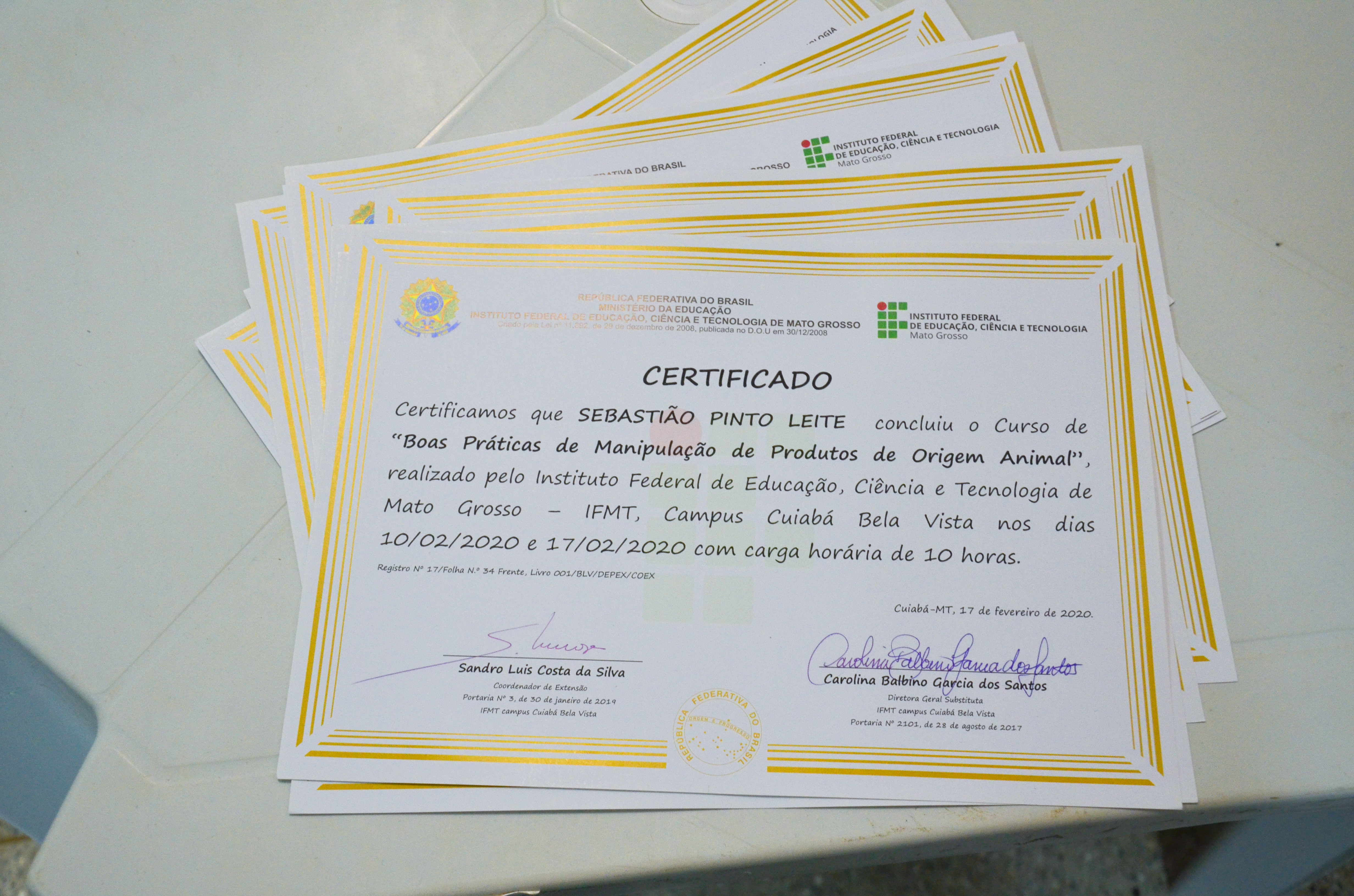 Alunos do curso de Boas Práticas e Manipulação de Produtos de Origem Animal receberam seus certificados nesta segunda-feira (17). Mais de 80 permissionários das 48 feiras de Cuiabá e do Mercado do Porto participaram do evento, fruto de parceria entre a Secretaria de Agricultura, Trabalho e Desenvolvimento Econômico de Cuiabá, com o Instituto Federal de Mato Grosso (IFMT), Campus Bela Vista.