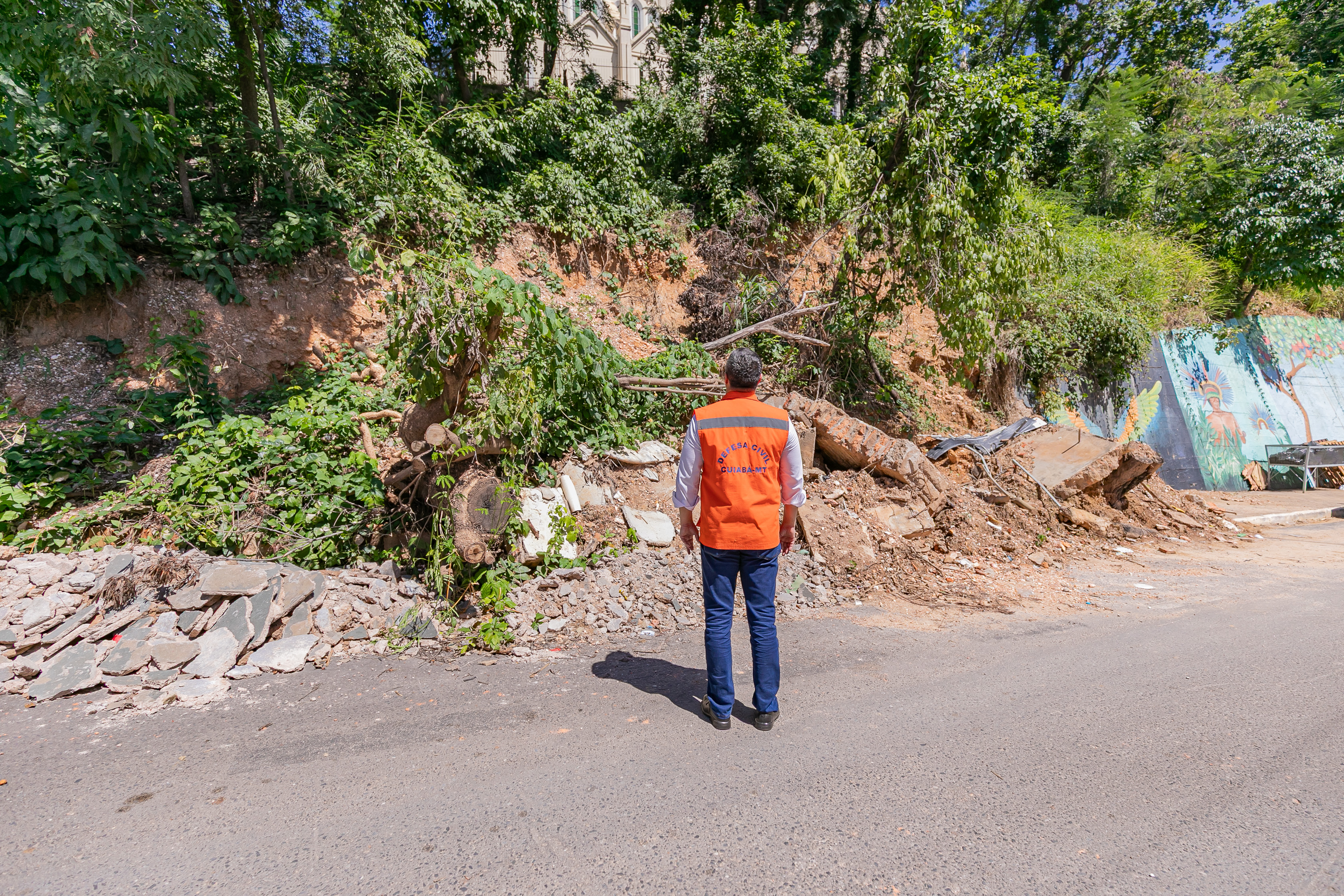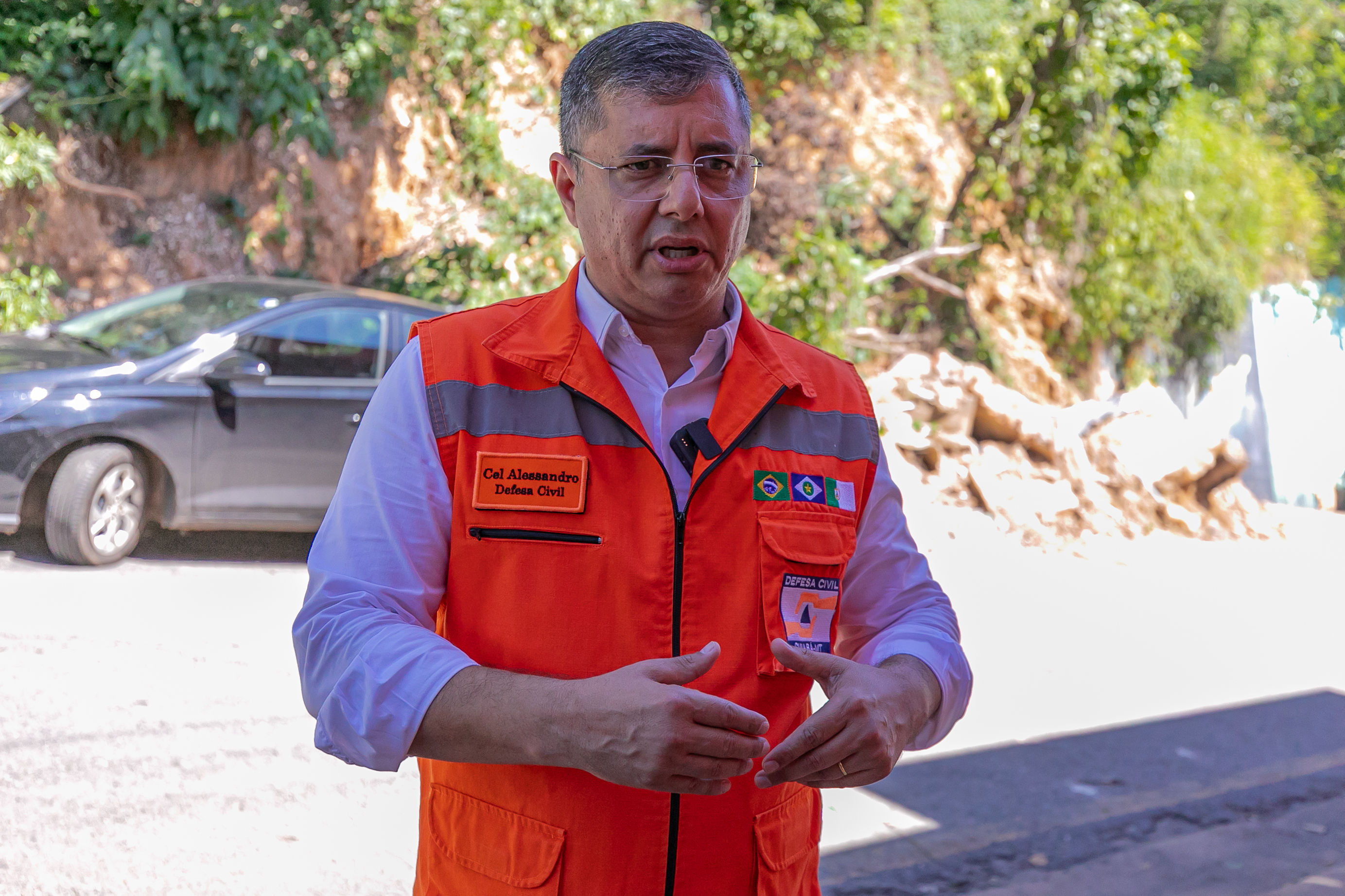 A imagem mostra o secretário de Defesa Civil, coronel Alessandro Borges, observando ponto de deslizamento de terra no Morro do Bom Despacho. Ele usa camisa branca e colete laranja da Defesa Civil.