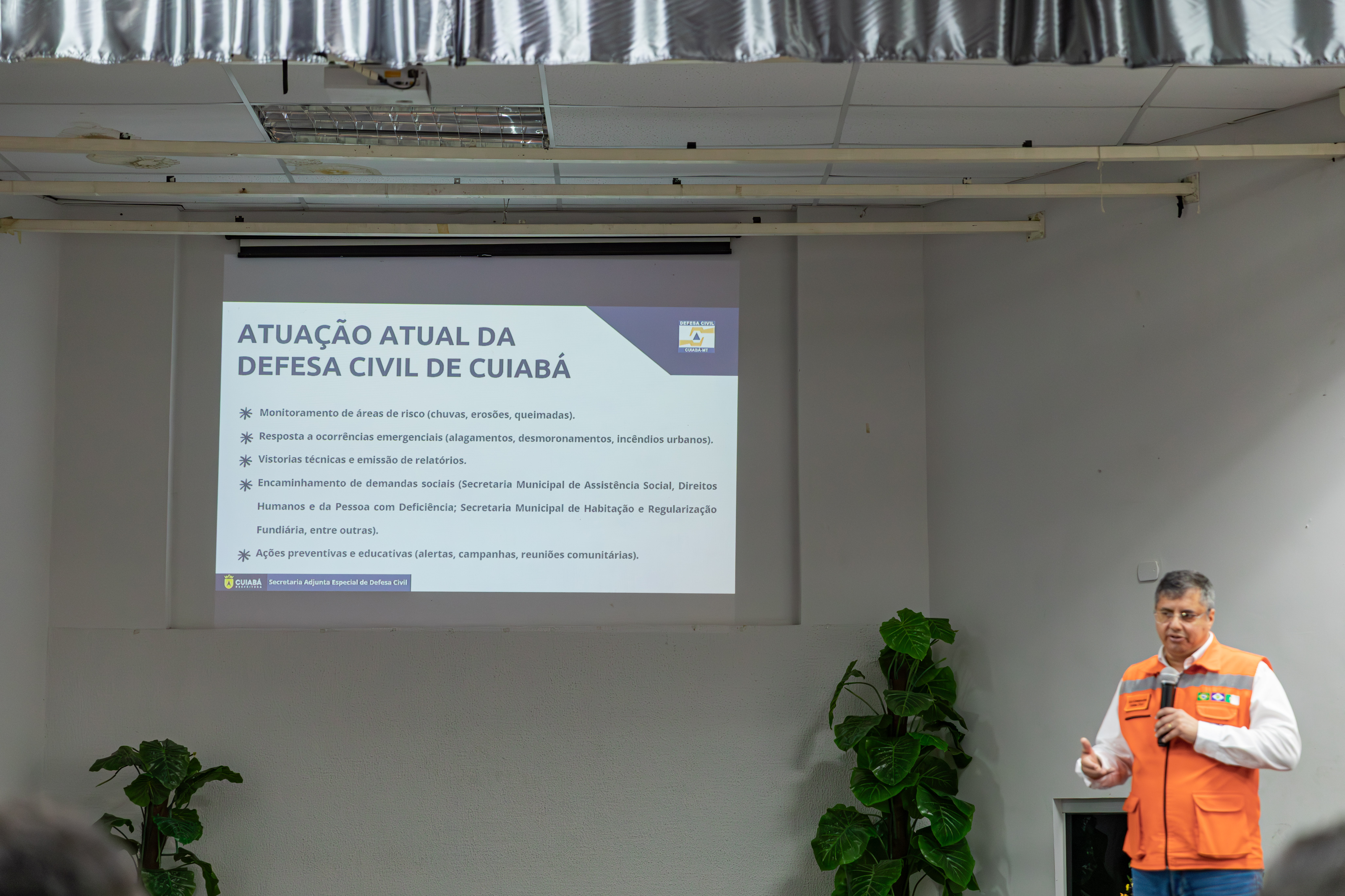 A imagem que ilustra a matéria mostra o secretário especial da Defesa Civil de Cuiabá, coronel BM Alessandro Borges, apresenta os principais pontos do Plano de Contingência Municipal a um auditório composto por representantes de instituições civis, militares e órgãos públicos.