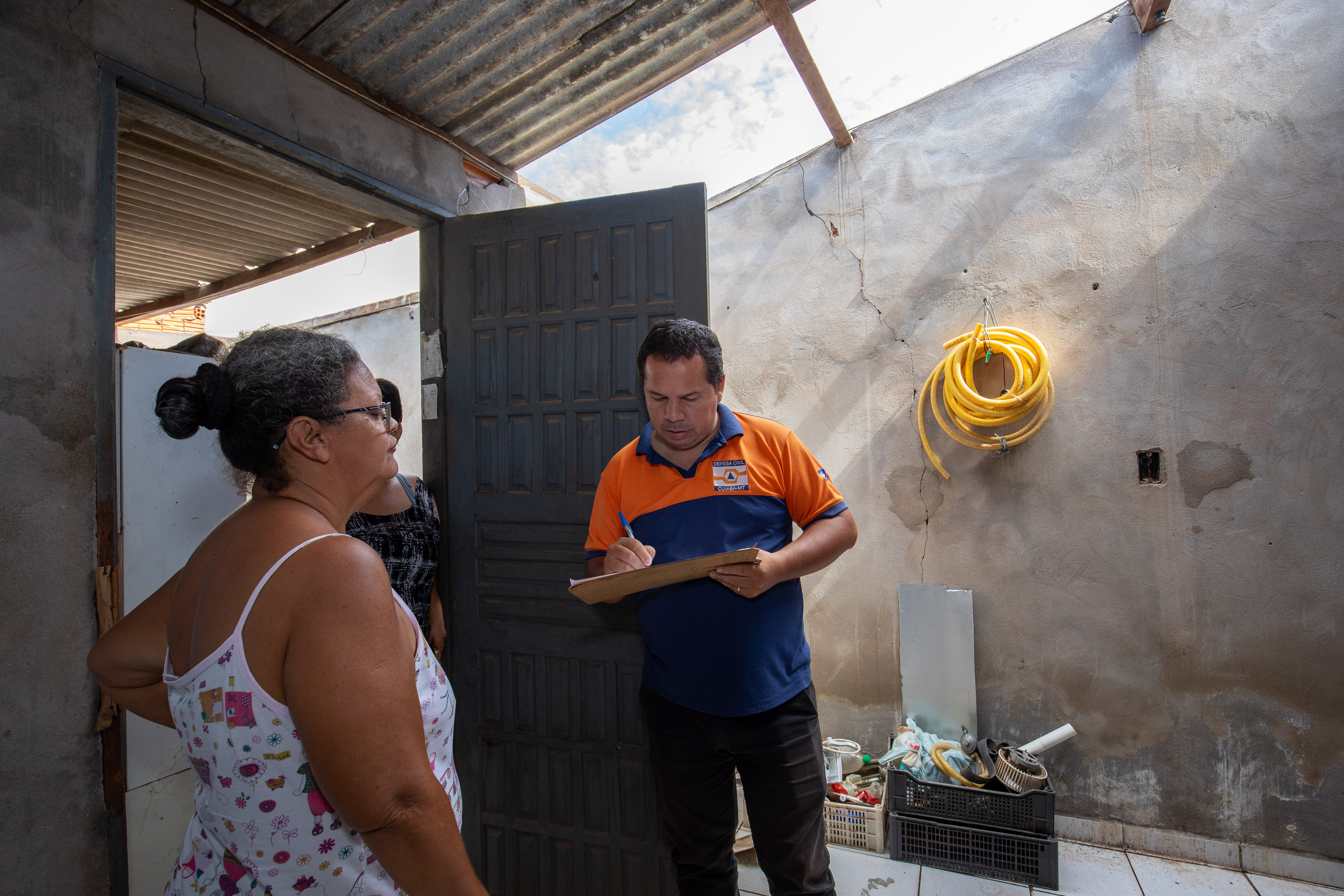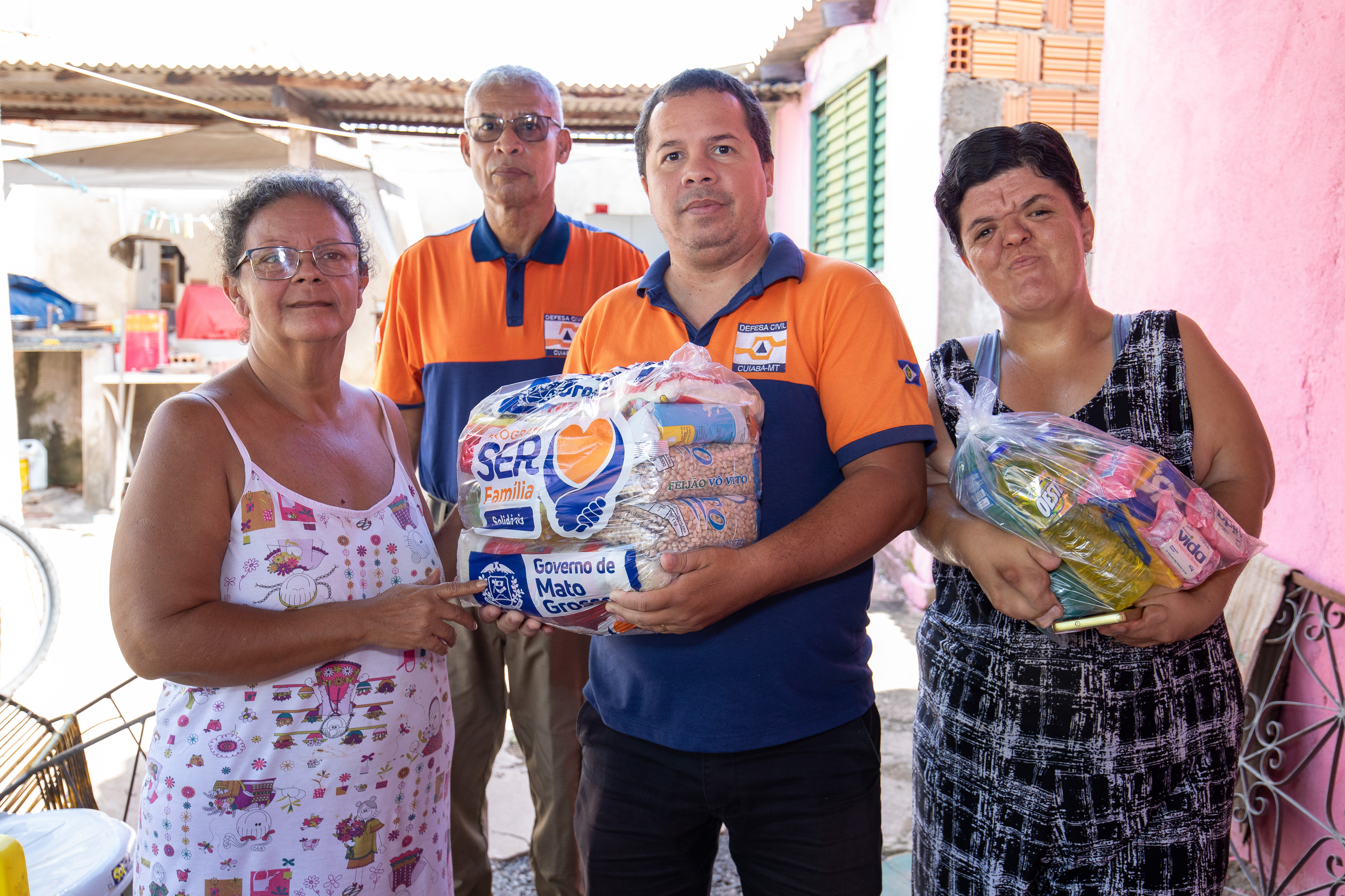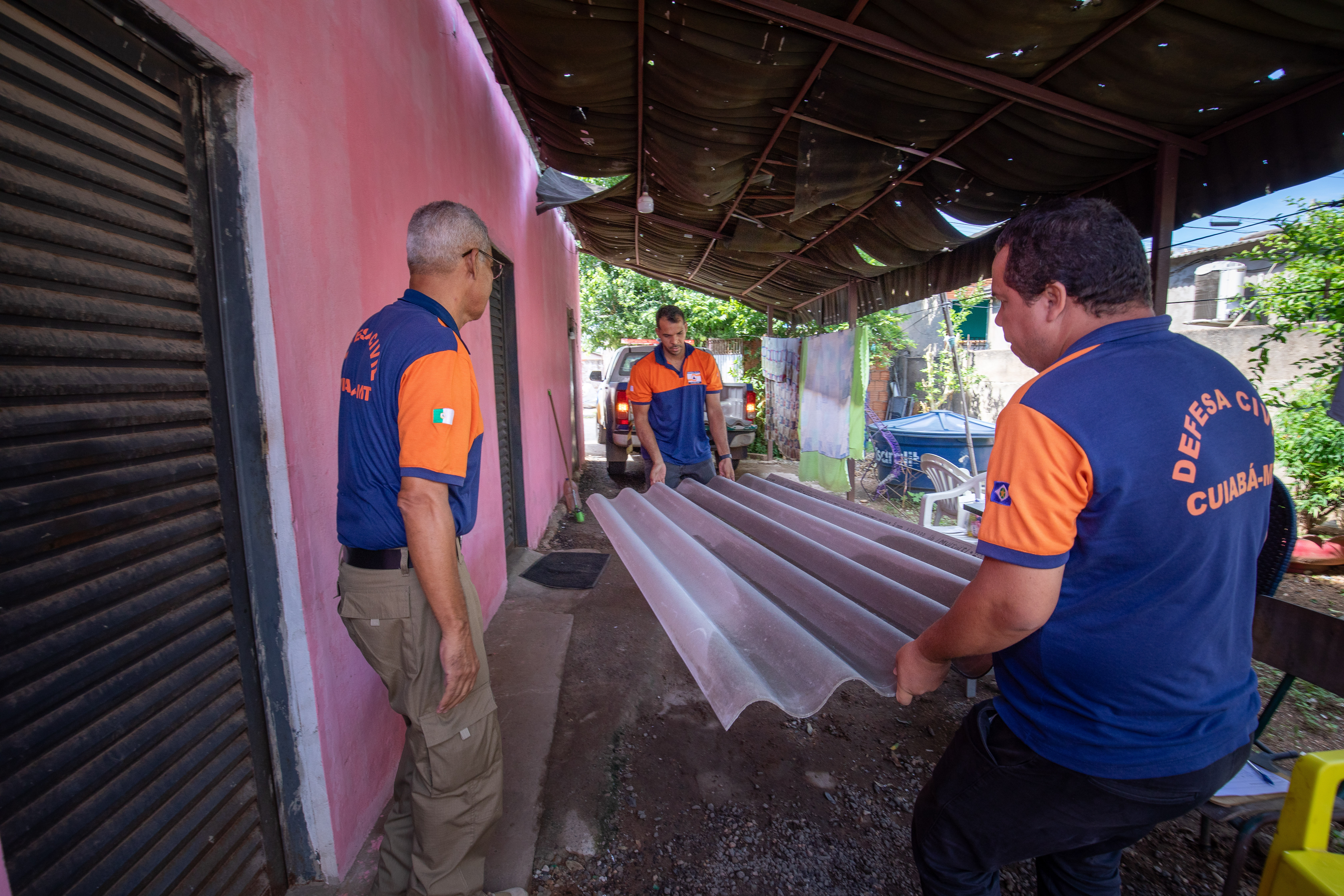 A imagem que ilustra a matéria mostra os agentes da Defesa Civil de Cuiabá entregando cesta básica e telhas à família de Dona Sueli, moradora do bairro Novo Terceiro em Cuiabá. Dona Sueli usa vestido branco com figuras coloridas. A filha dela, Thaina Soares usa roupa preta com listas quadriculadas no tom cinza.