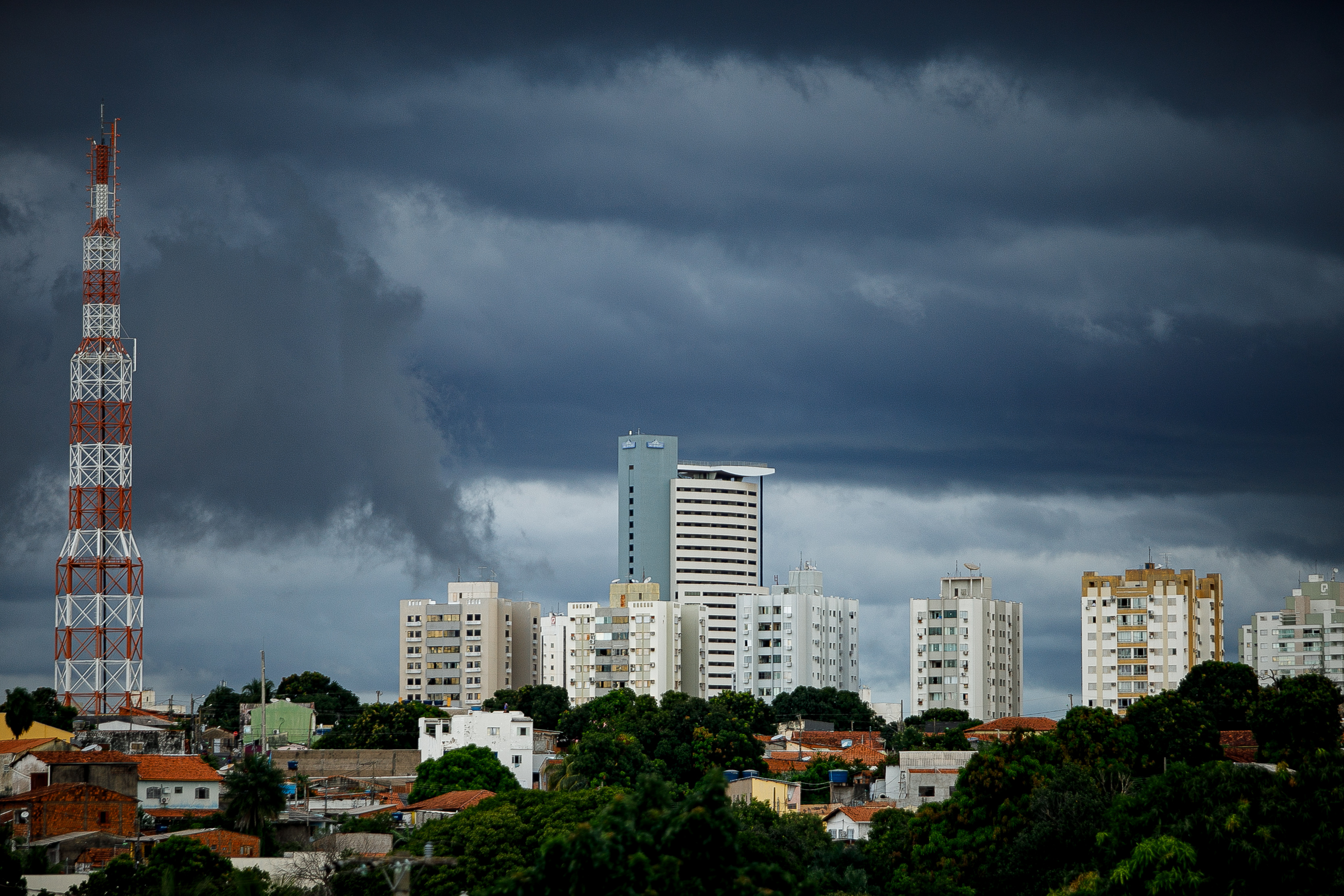 A imagem mostra as nuvens de chuva no céu de Cuiabá. Abaixo tem uma galeria de fotos com ações da Defesa Civil durante as chuvas.