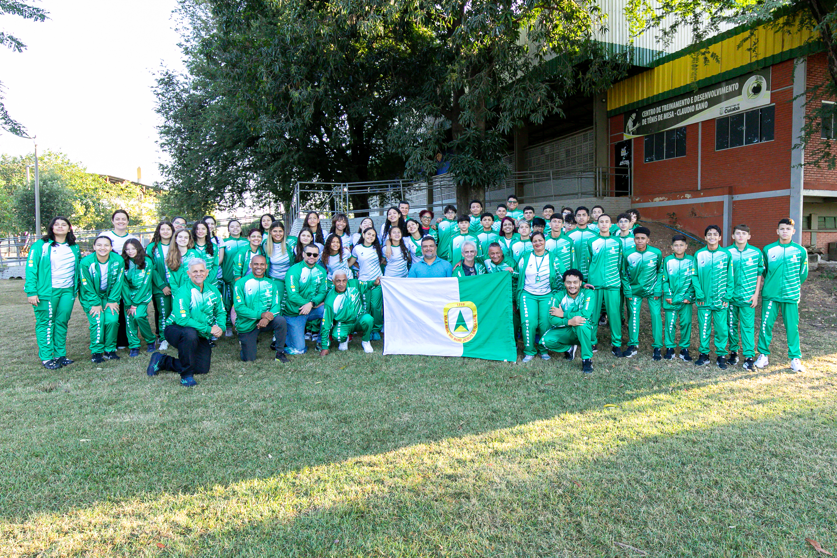 A imagem mostra os atletas que irão representar a capital no Campeonato Estadual de Desporto Escolar, com a comissão responsável pela delegação cuiabana.