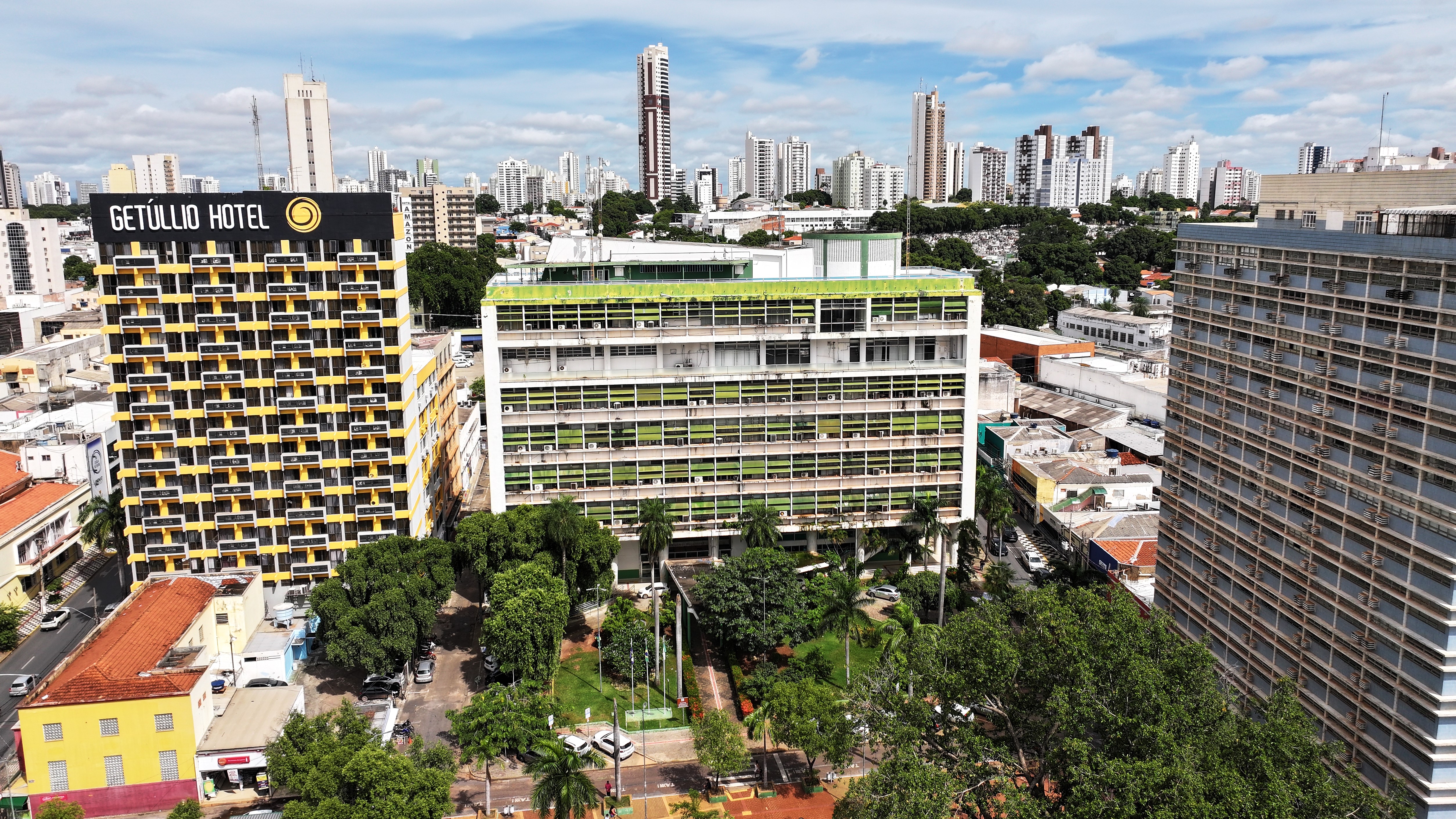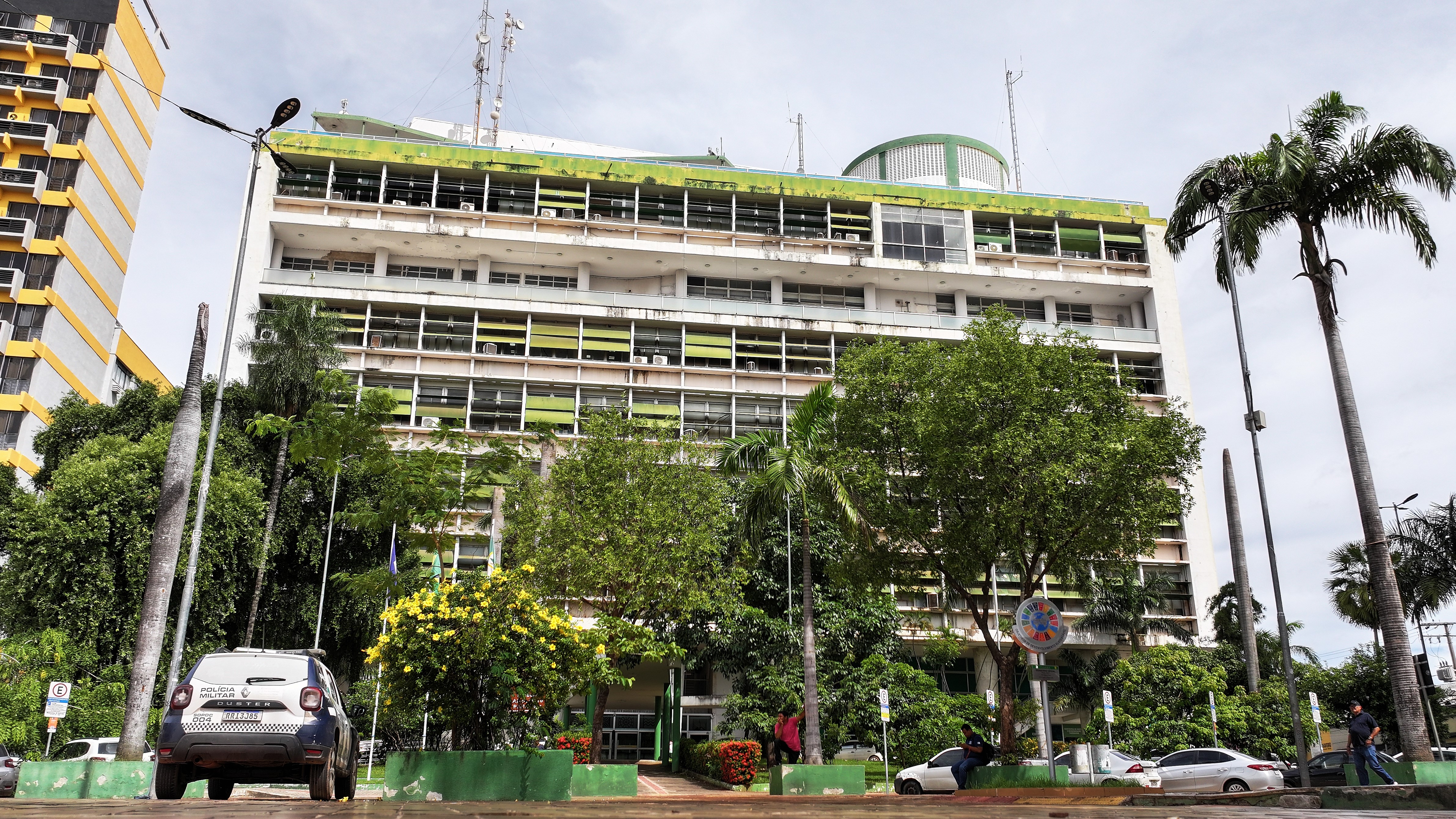 A imagem que ilustra a matéria é uma fachada do prédio da Prefeitura de Cuiabá captada por drone. O prédio do Palácio Alencastro é ilustrado na fachada com cores brancas e verdes. Há ainda árvores com folhas verdes