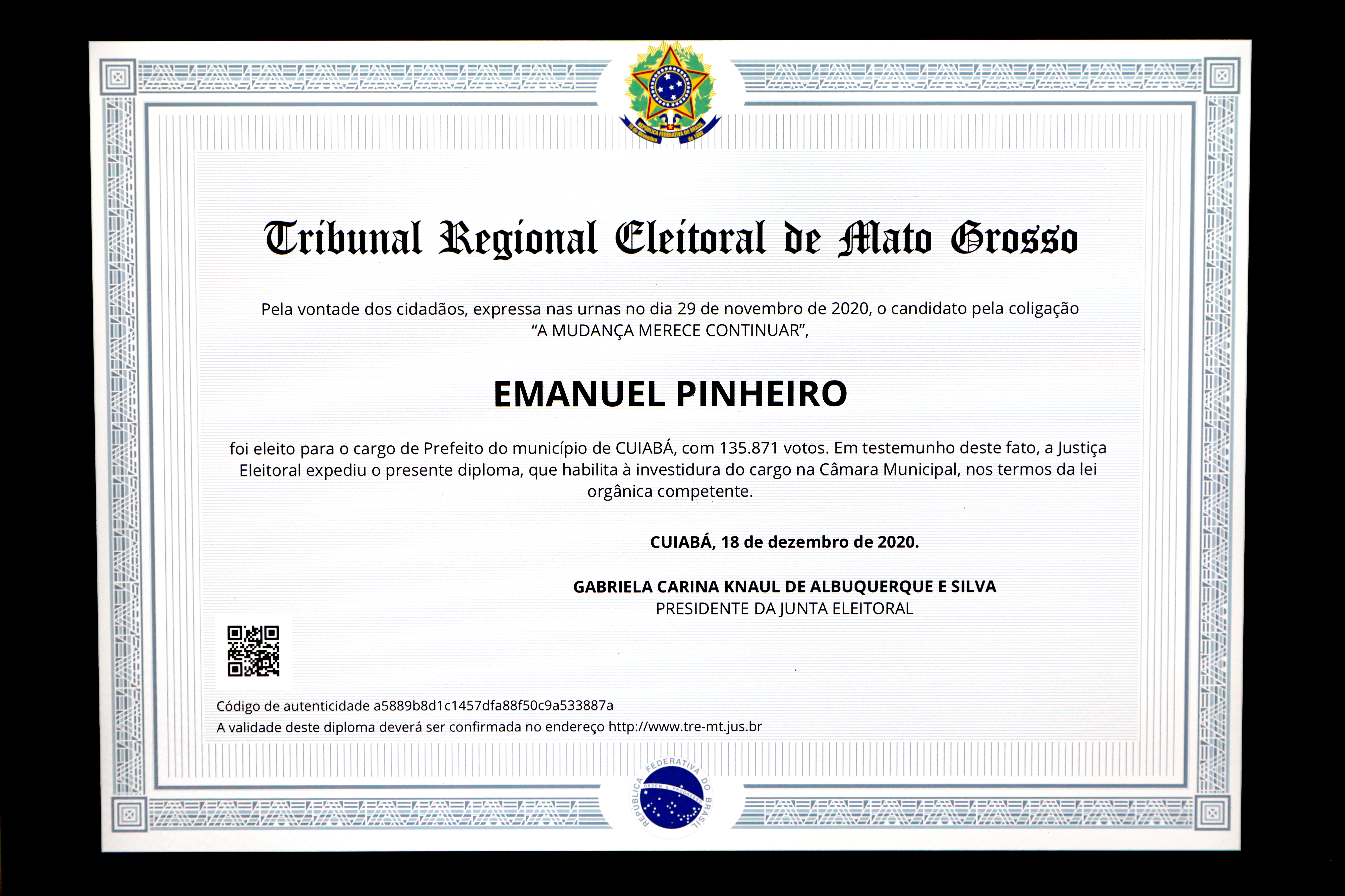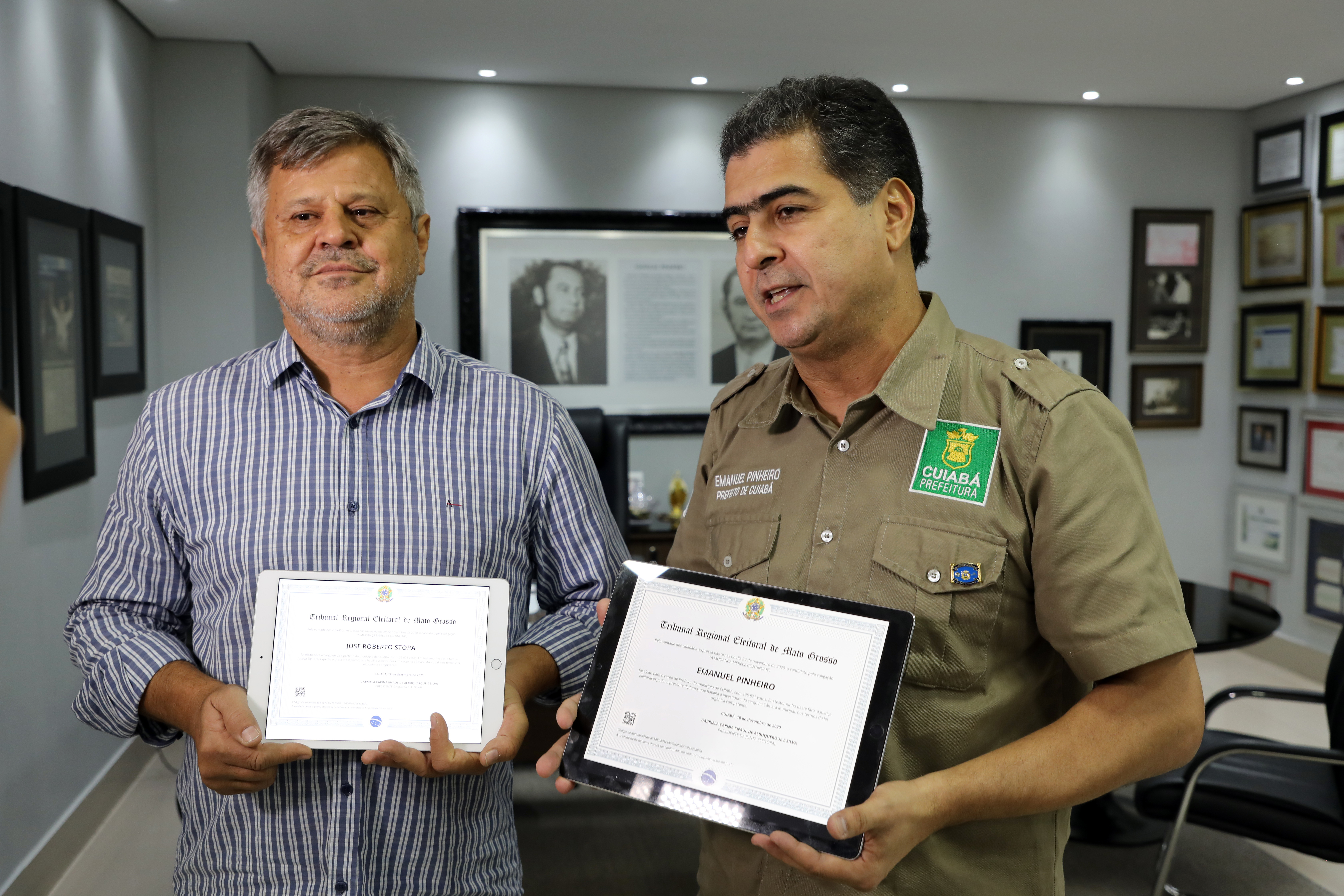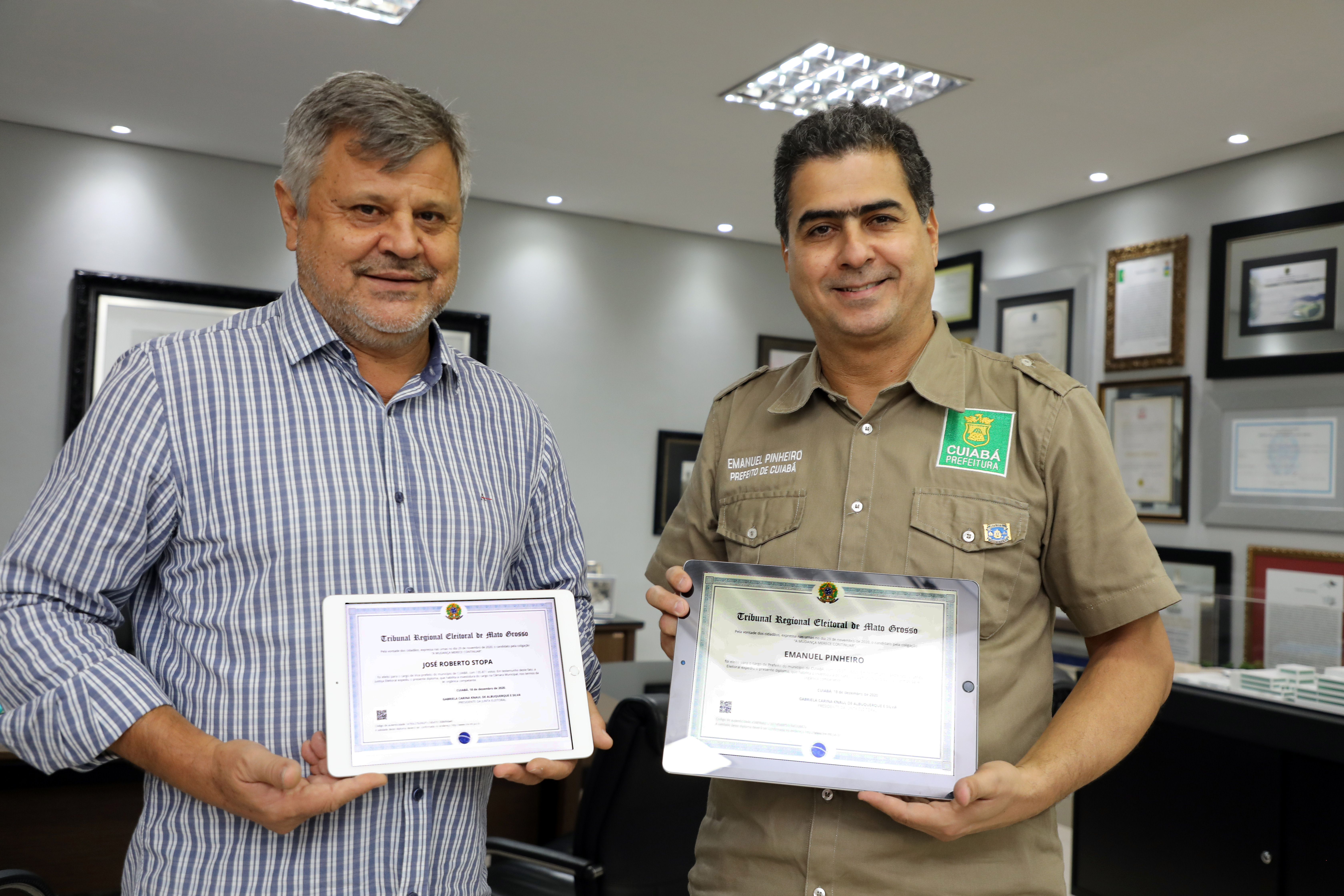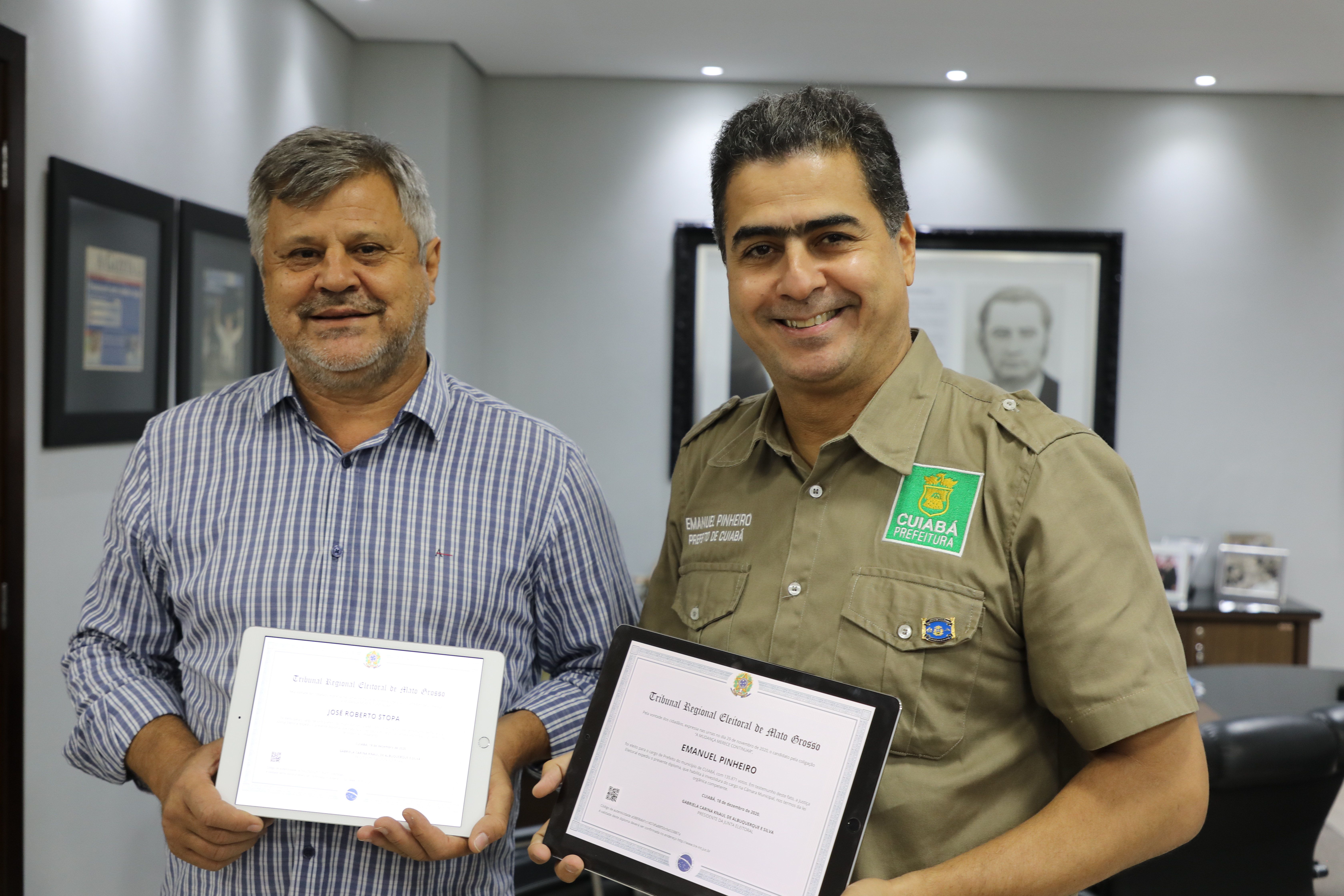 O prefeito reeleito de Cuiabá, Emanuel Pinheiro, e o vice, José Roberto Stopa, foram diplomados na manhã de hoje (18), pelo Tribunal Regional Eleitoral (TRE-MT) virtualmente. Pinheiro, mais uma vez, ratificou o compromisso de trabalhar por uma capital mais moderna, inclusiva e de justiça social. Pinheiro e Stopa acompanharam a assinatura e emissão dos diplomas do Palácio Alencastro.