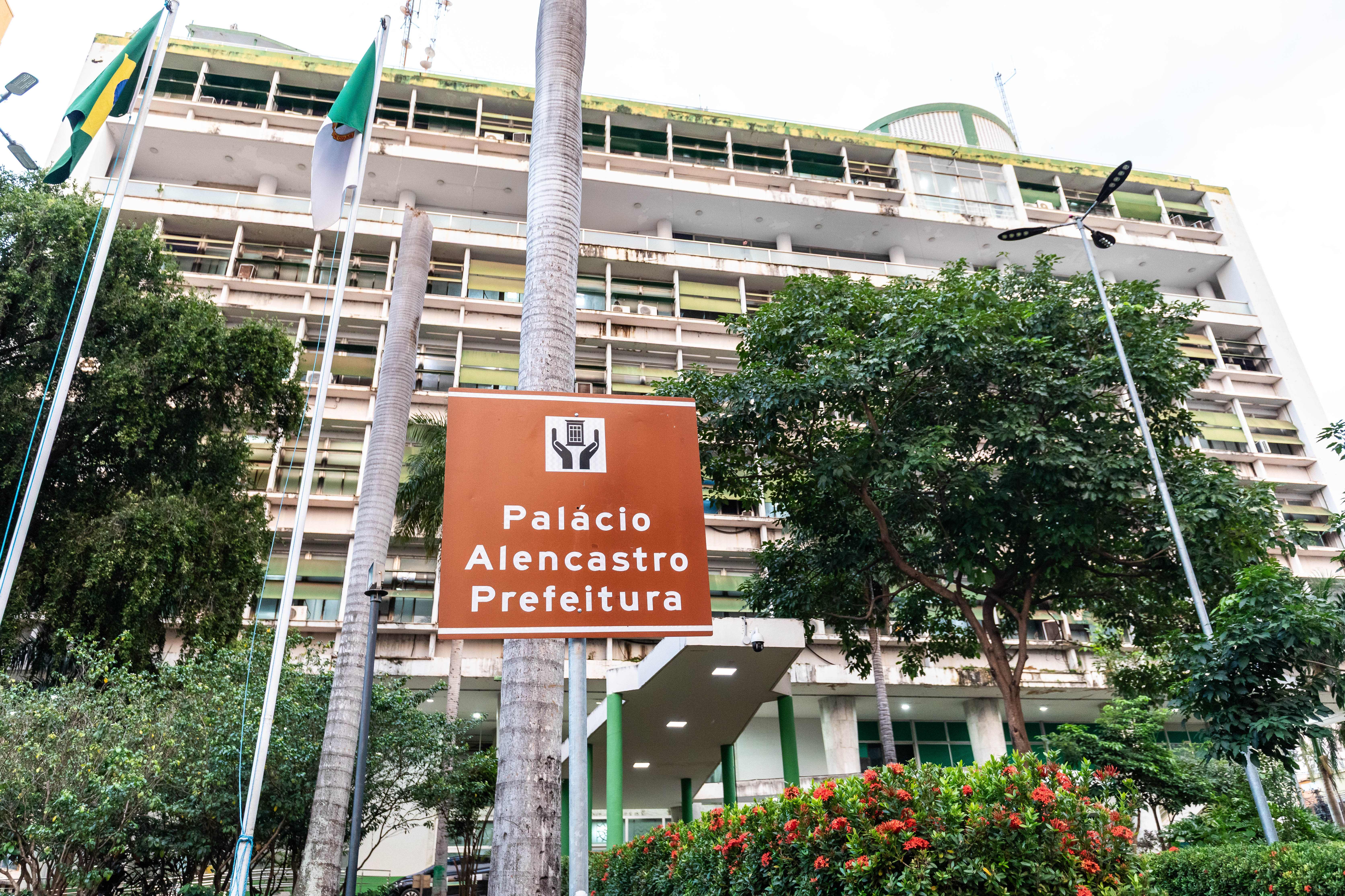 A imagem ilustra o Palácio Alencastro, prédio que abriga a Prefeitura de Cuiabá. Há destaque para uma placa de cor marrom que ilustra a frase em branco "Palácio Alencastro Prefeitura". Também são destacadas árvores com folhas verdes em frente ao prédio.