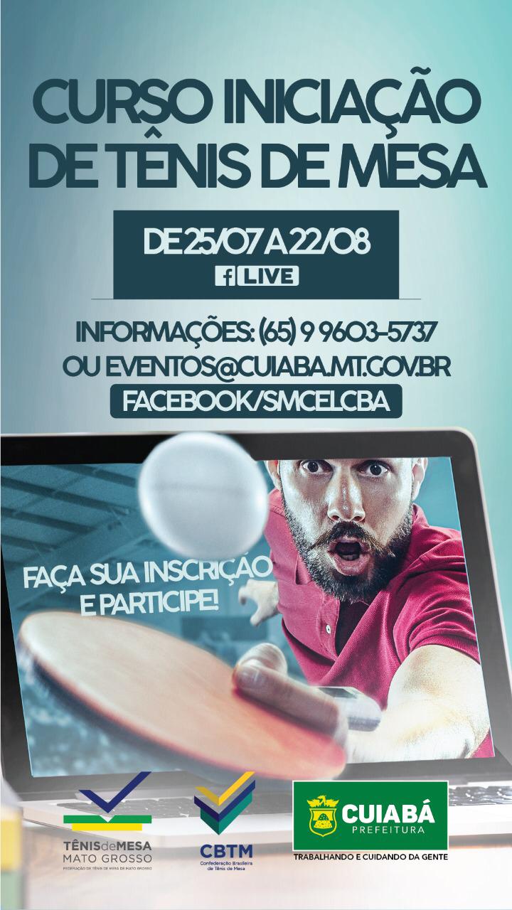 A Secretaria de Cultura, Esporte e Lazer promove, no período de 25 de julho a 28 de agosto, o curso de iniciação ao tênis de mesa, que será realizado via live em sua página no facebook. Com inscrições abertas e gratuitas, as aulas serão ministradas pelo professor Sandro José Abrão, presidente da Federação Mato-grossense de Tênis de Mesa. Será entregue certificado aos inscritos ao final da formação.