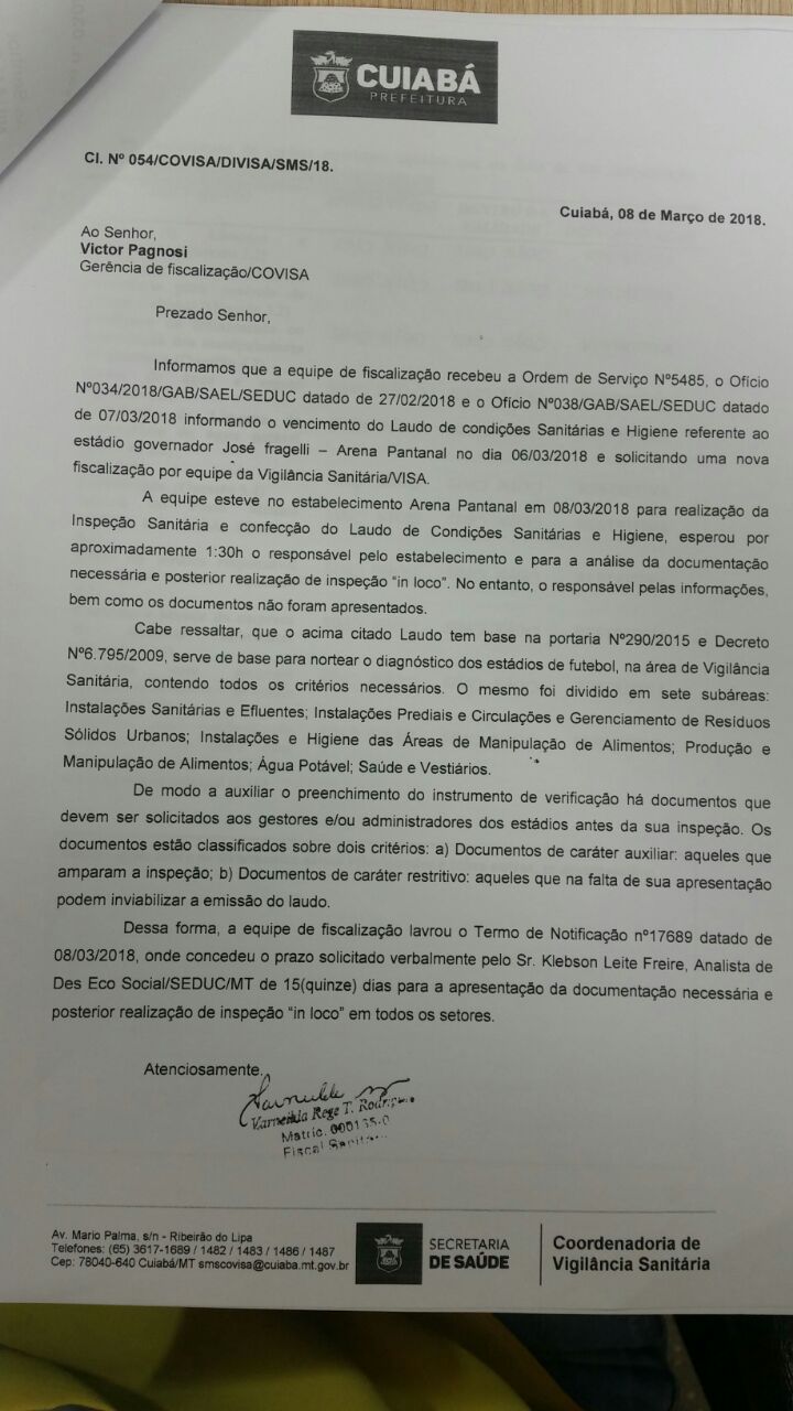A Secretaria Municipal de Saúde (SMS) por meio da Vigilância em Saúde esclarece que os responsáveis pela Arena Pantanal, só apresentaram no fim da tarde de ontem, dia 12 de março, parte da relação de documentos necessários para o início dos trabalhos da Vigilância Sanitária e posterior emissão do Laudo.