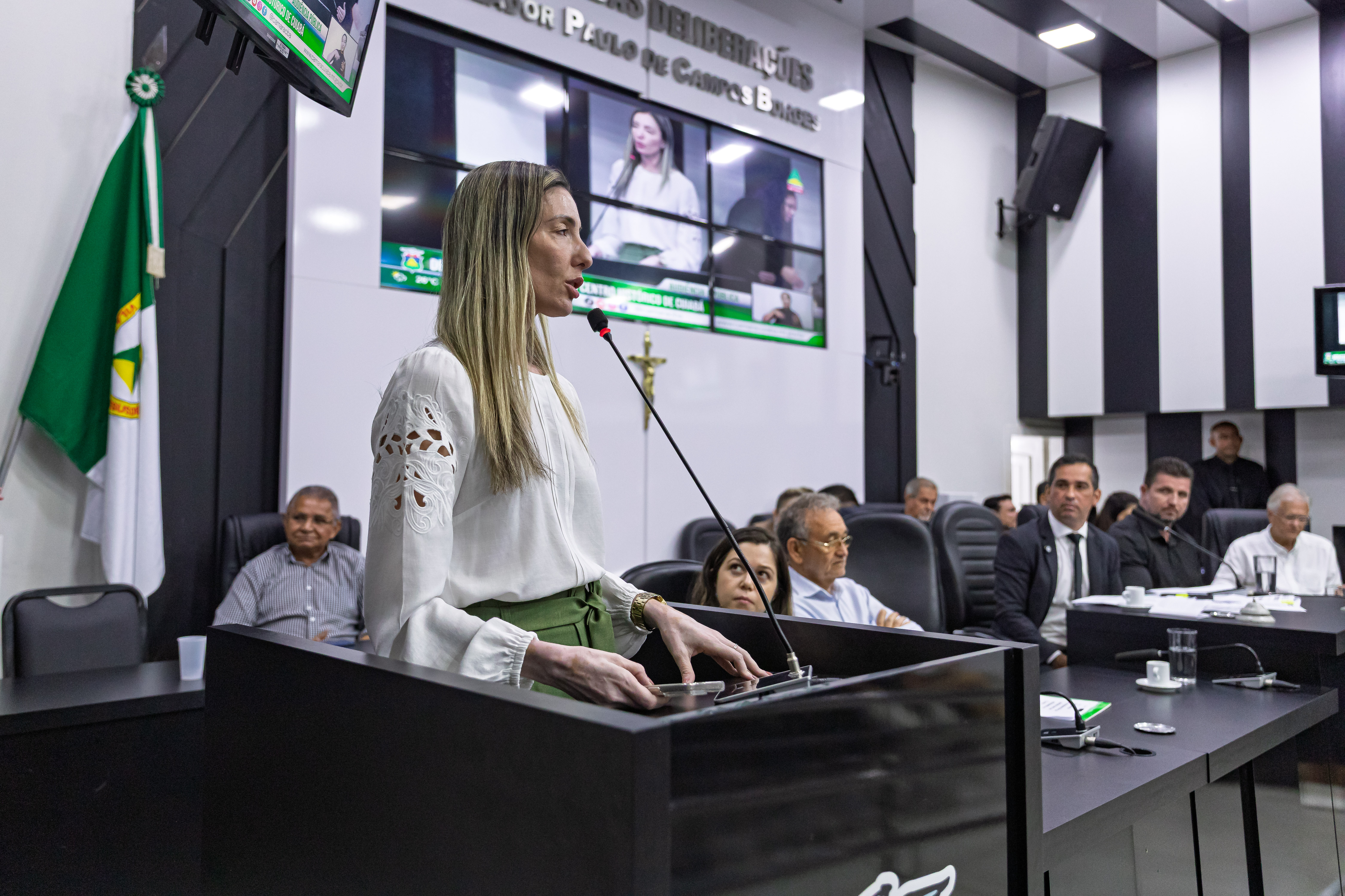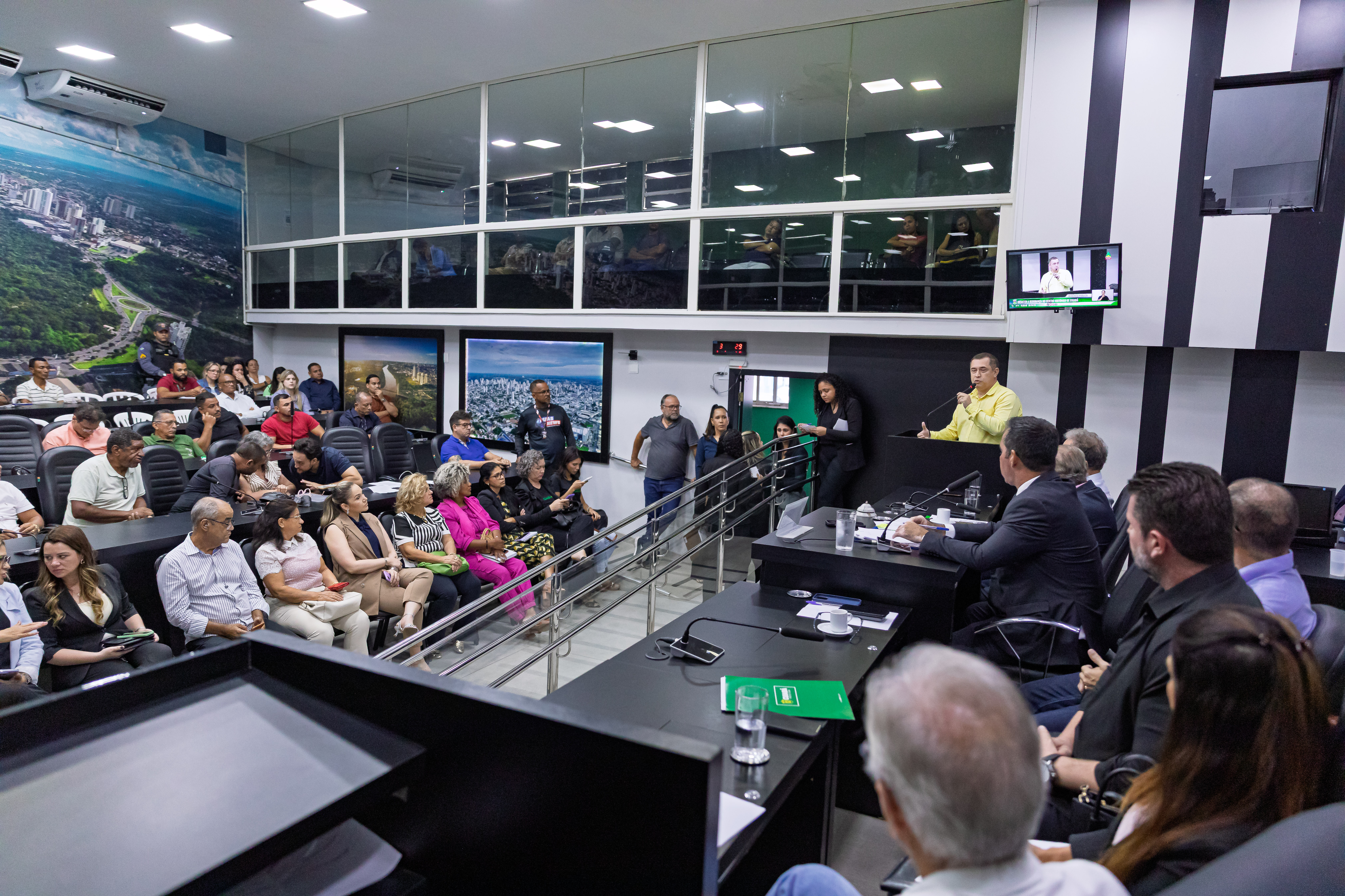 A foto mostra o plenário e autoridades na Câmara de Vereadores durante a audiência pública.