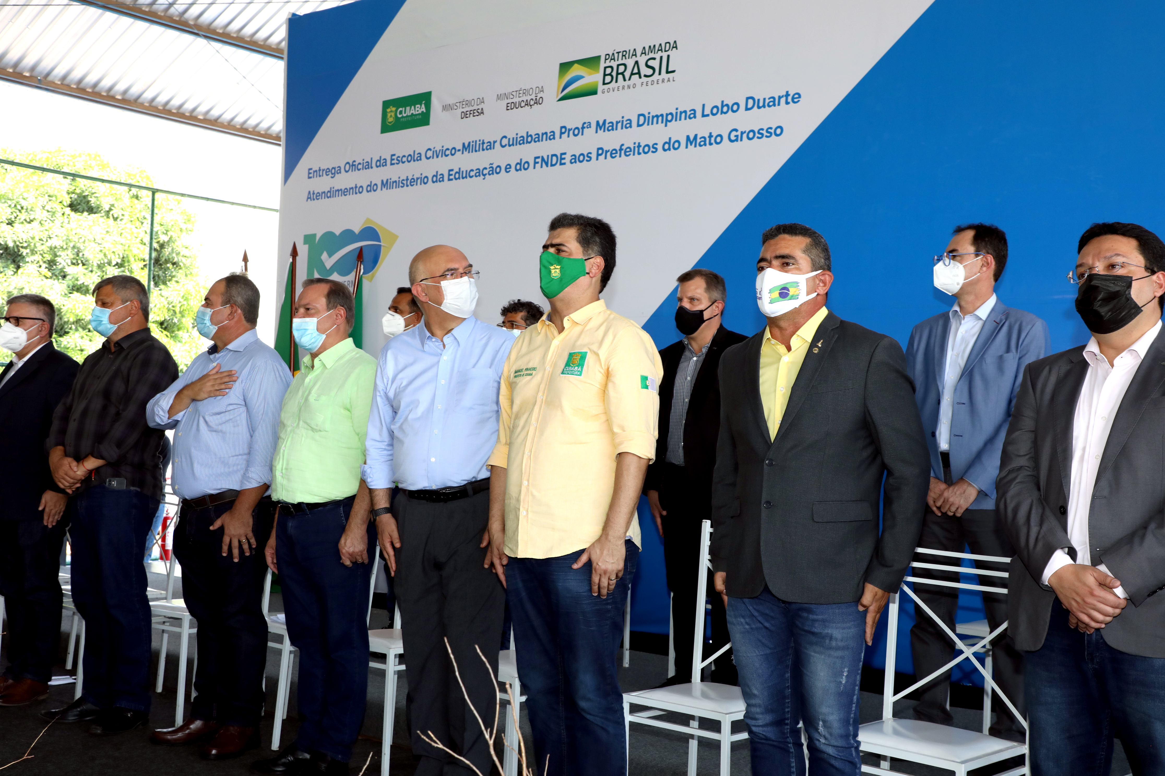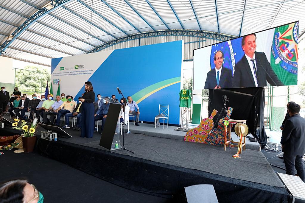 O presidente da República, Jair Bolsonaro, participou online na manhã de hoje (1), da solenidade de entrega oficial da Escola Cívico-Militar Cuiabana Professora Maria Dimpina. Na capital, o ato de entrega foi realizado pelo prefeito Emanuel Pinheiro, e também pelo ministro da Educação, Milton Ribeiro. A unidade escolar foi completamente reformada pela Prefeitura de Cuiabá e entregue à população em junho deste ano.