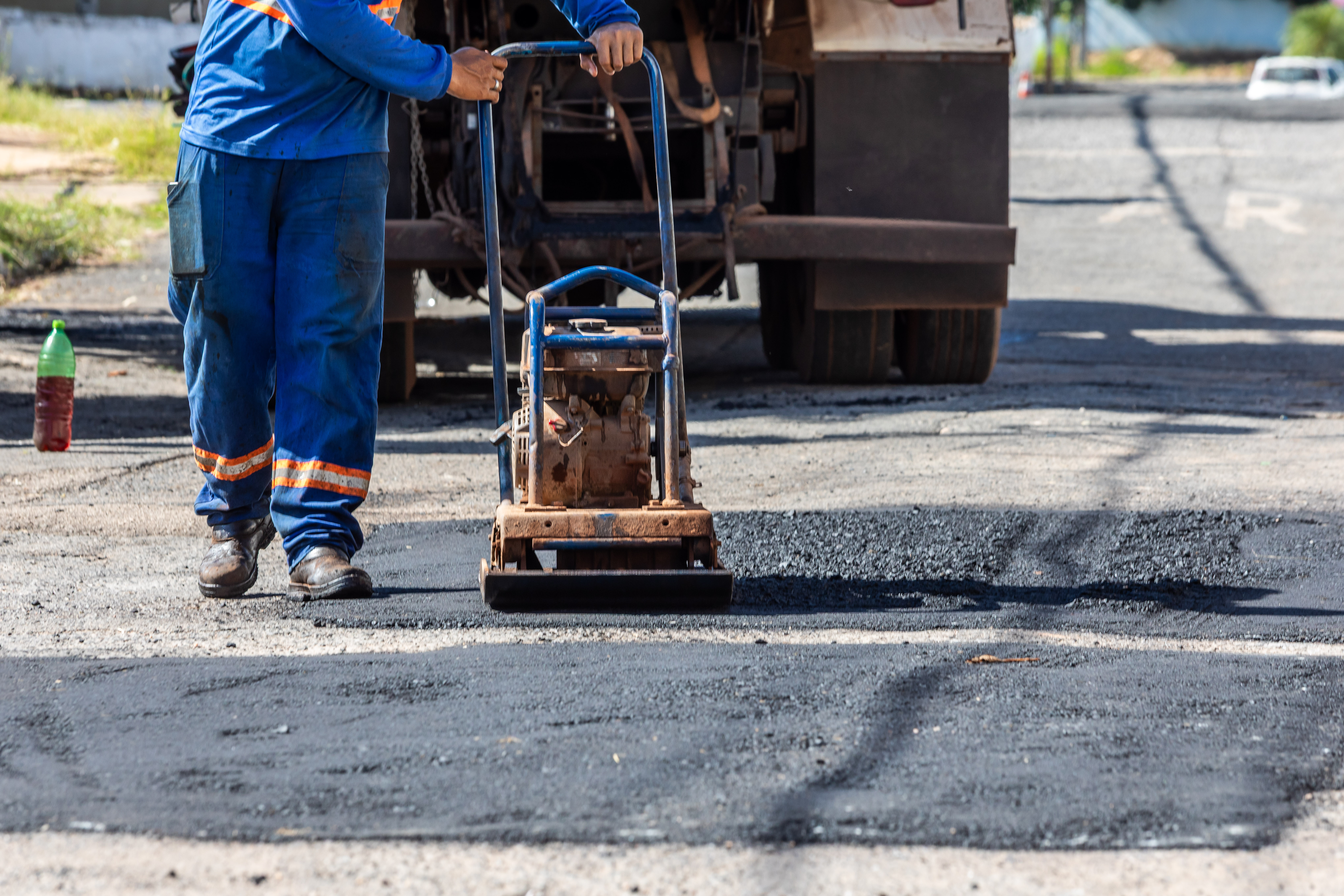 A foto ilustra um trabalhador aplicando uma malha em um asfalto. O trabalhador veste uniforme azul com detalhes laranja.