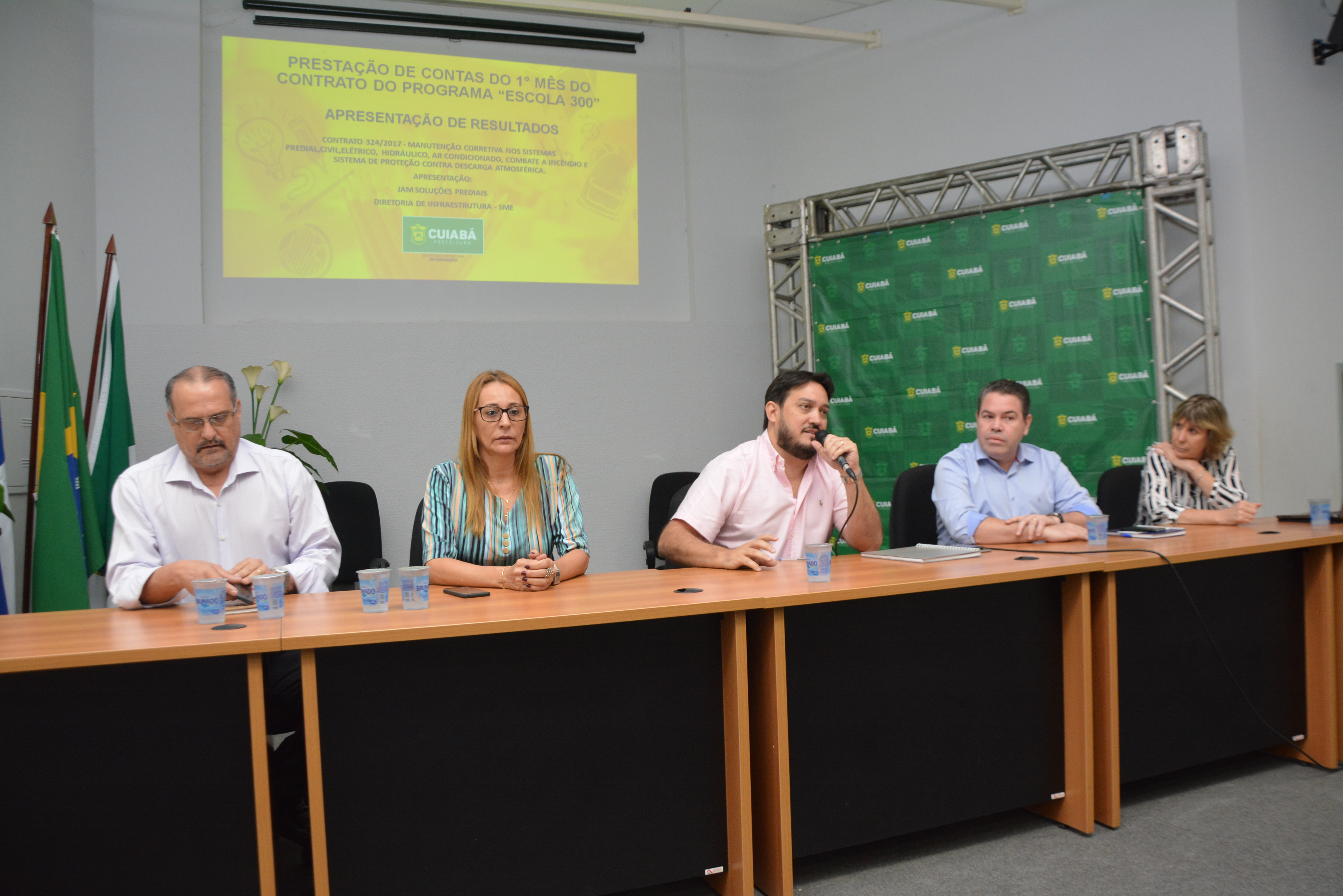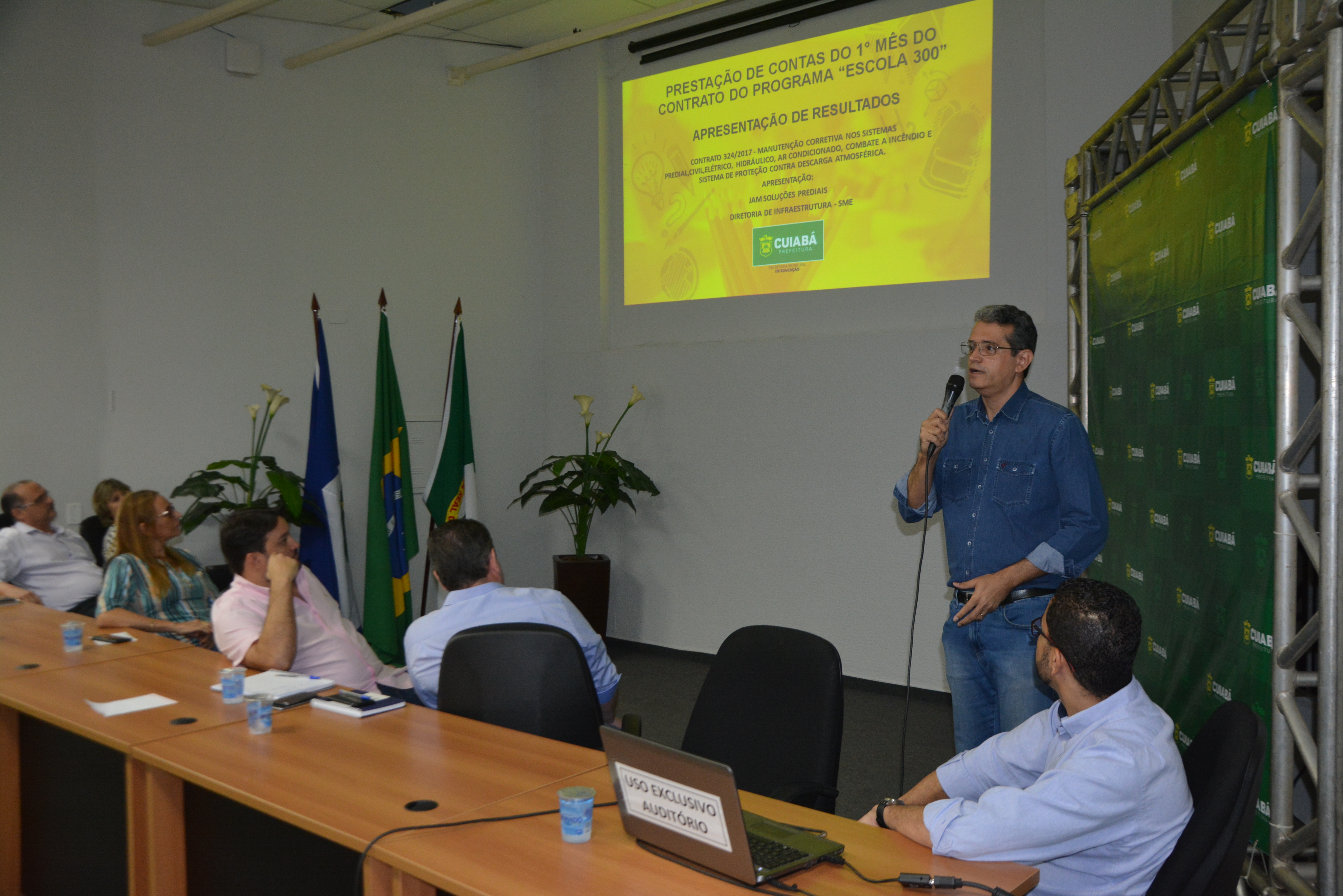O secretário de Educação de Cuiabá, Rafael de Oliveira Cotrim, acompanhou a apresentação do balanço das ações dos primeiros 30 dias de execução efetiva do projeto Escola 300, de manutenção corretiva e emergencial nas unidades da rede pública de ensino. Nesse período, 61 unidades já foram atendidas. O contrato com a Jam Soluções Prediais para a execução da manutenção tem prazo até março de 2018 e valor de R$ 4.193.952,03. O contrato abrange 96 unidades escolares, 24 delas para execução de manutenção corretiva.