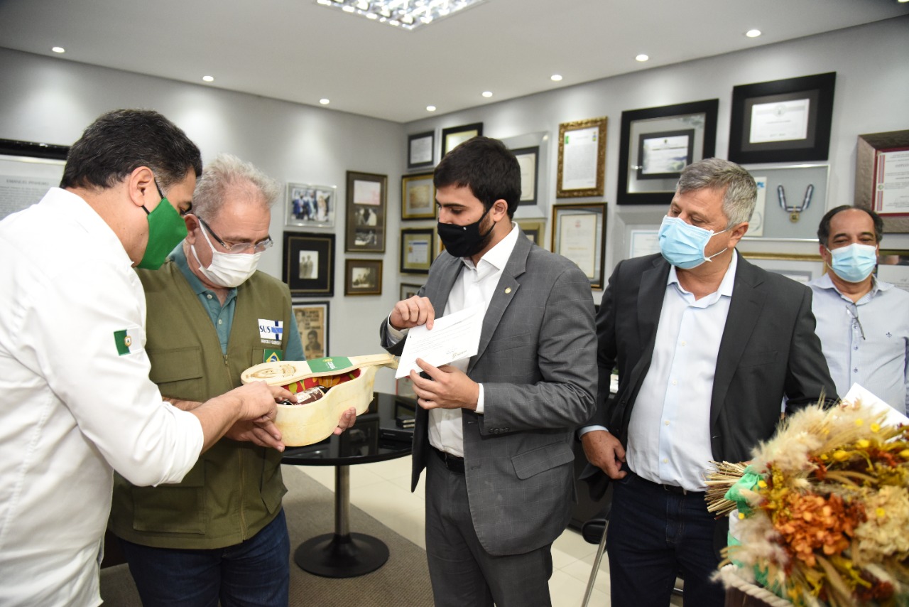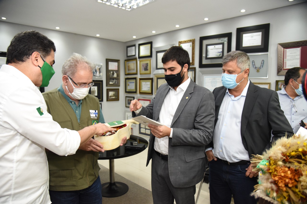 “Entregamos aqui uma cesta com iguarias cuiabanas, viola de cocho, licor, cerveja artesanal cuiabana que é muito famosa aqui, doces cuiabanos, tudo isso com muita alegria e a honra de recebe-lo na nossa terra”, disse o prefeito Emanuel Pinheiro.