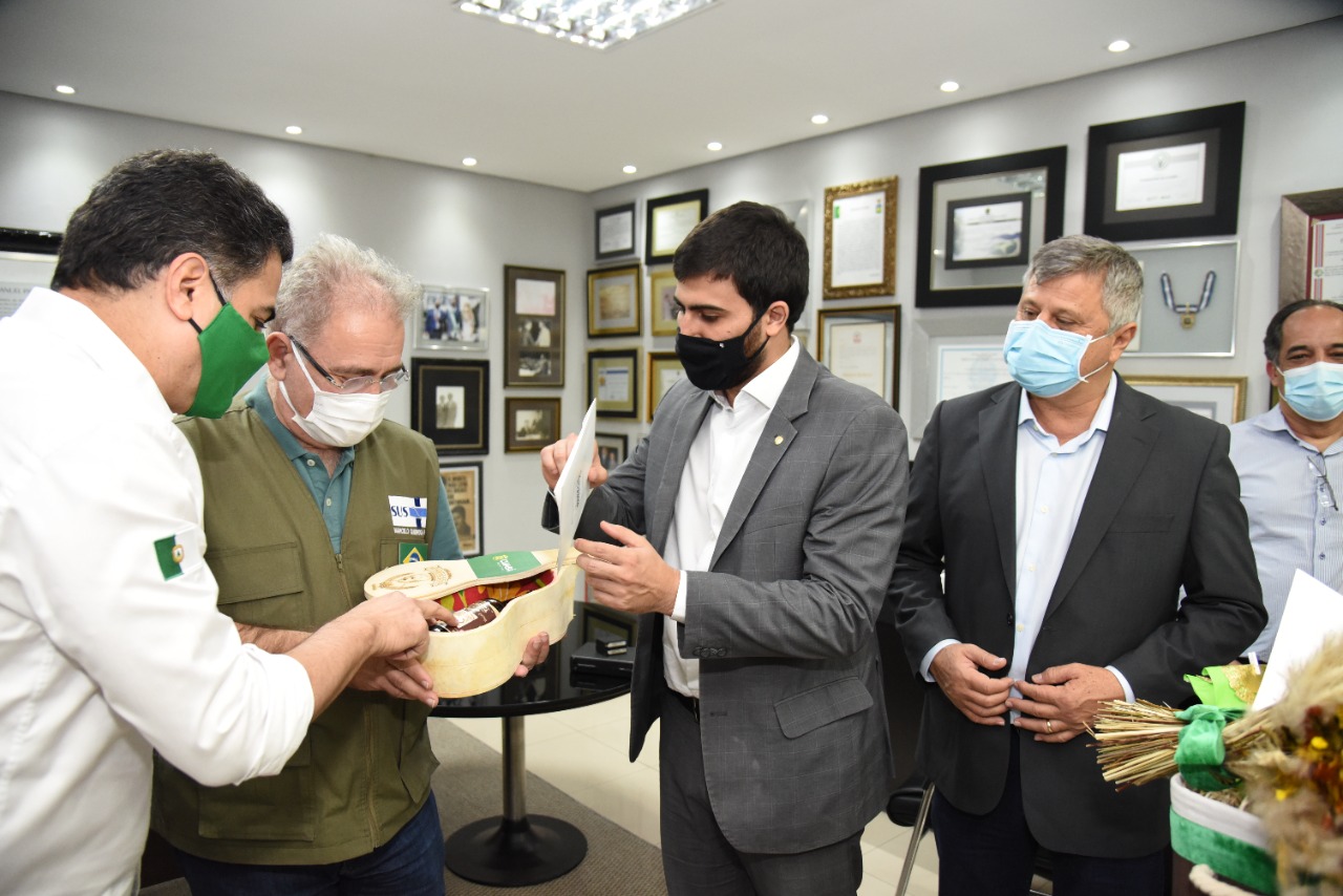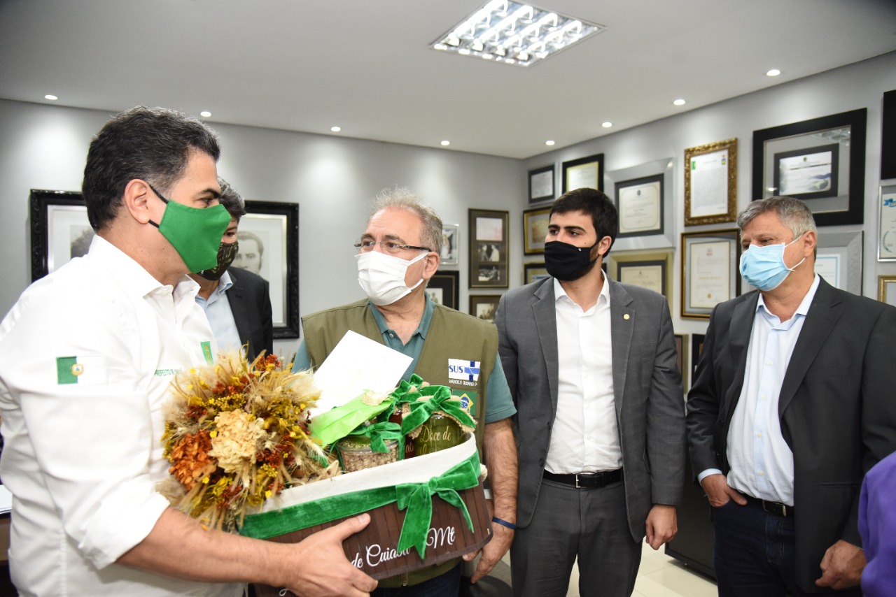 O ministro da Saúde, Marcelo Queiroga agradeceu a hospitalidade do prefeito Emanuel Pinheiro e disse que pretende retornar a capital de Mato Grosso em breve. A declaração foi dada enquanto o ministro recebia como lembrança uma cesta de iguarias e símbolos da cultura cuiabana, no Gabinete do Prefeito, no Palácio Alencastro, nesta sexta-feira (09).