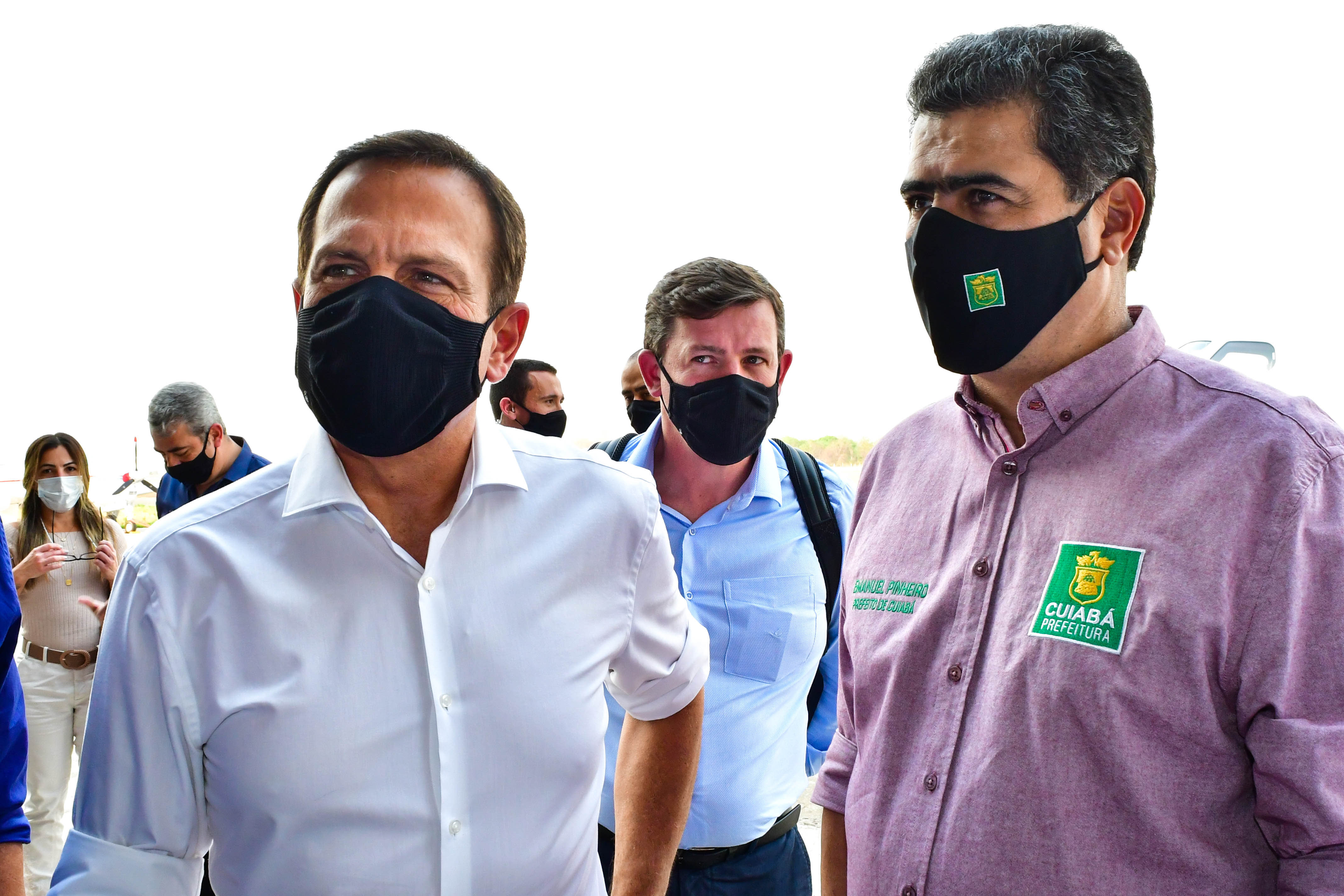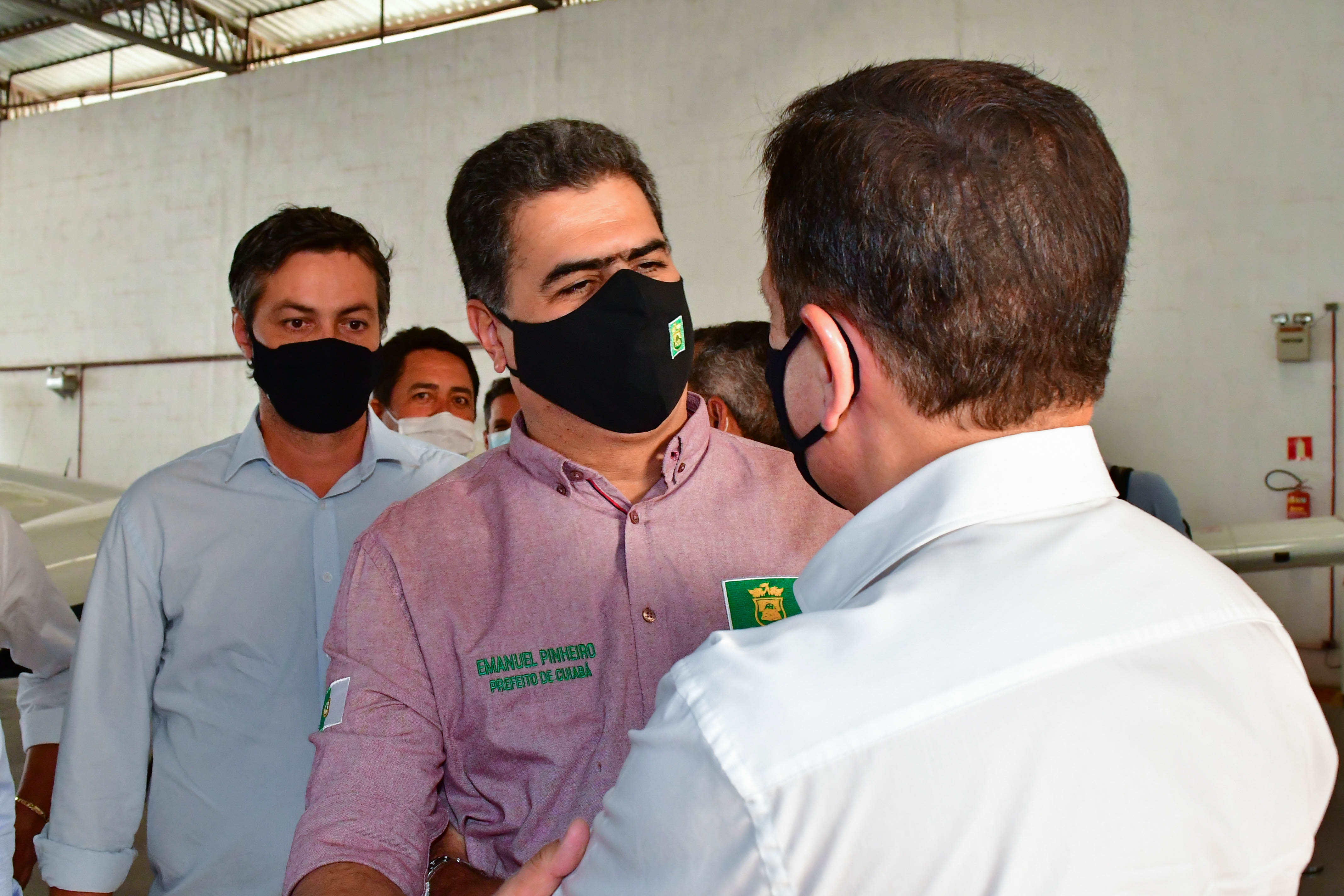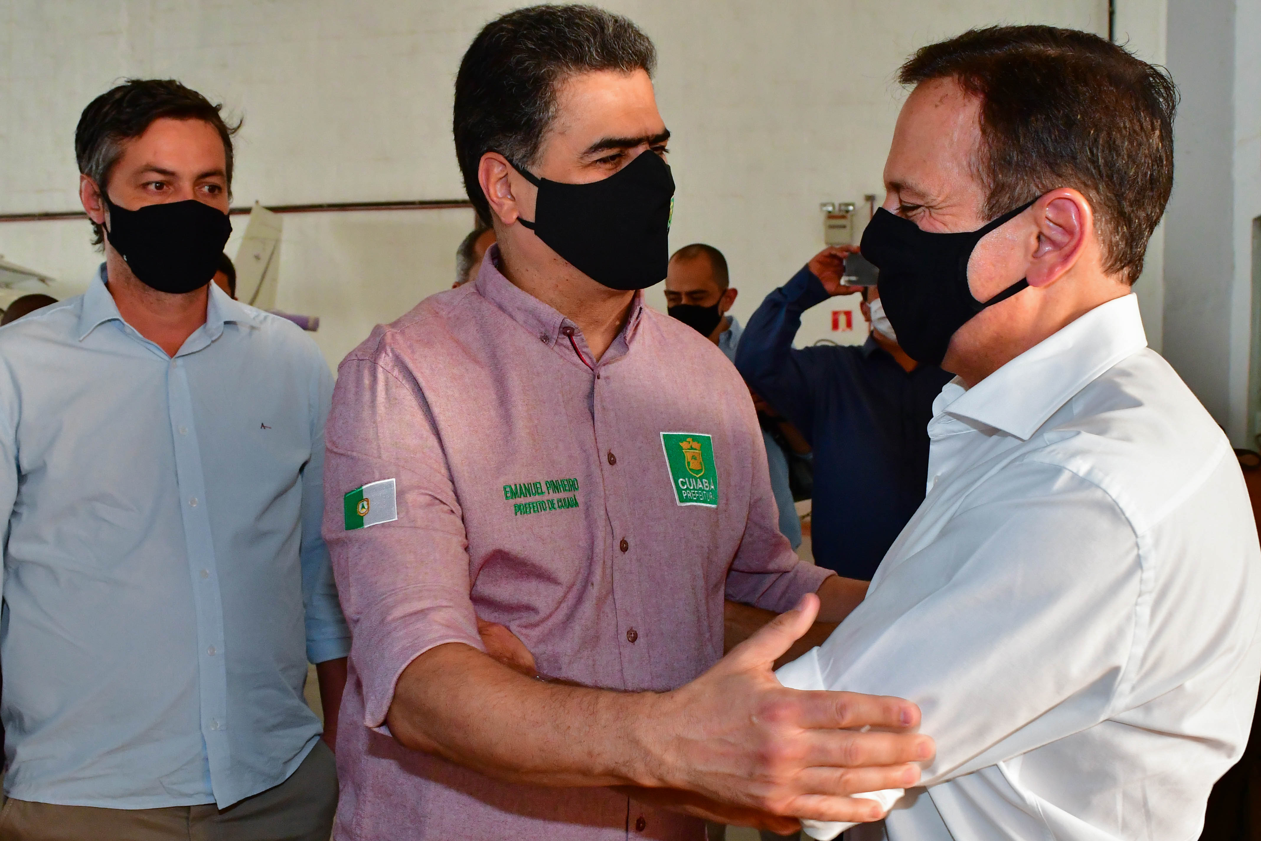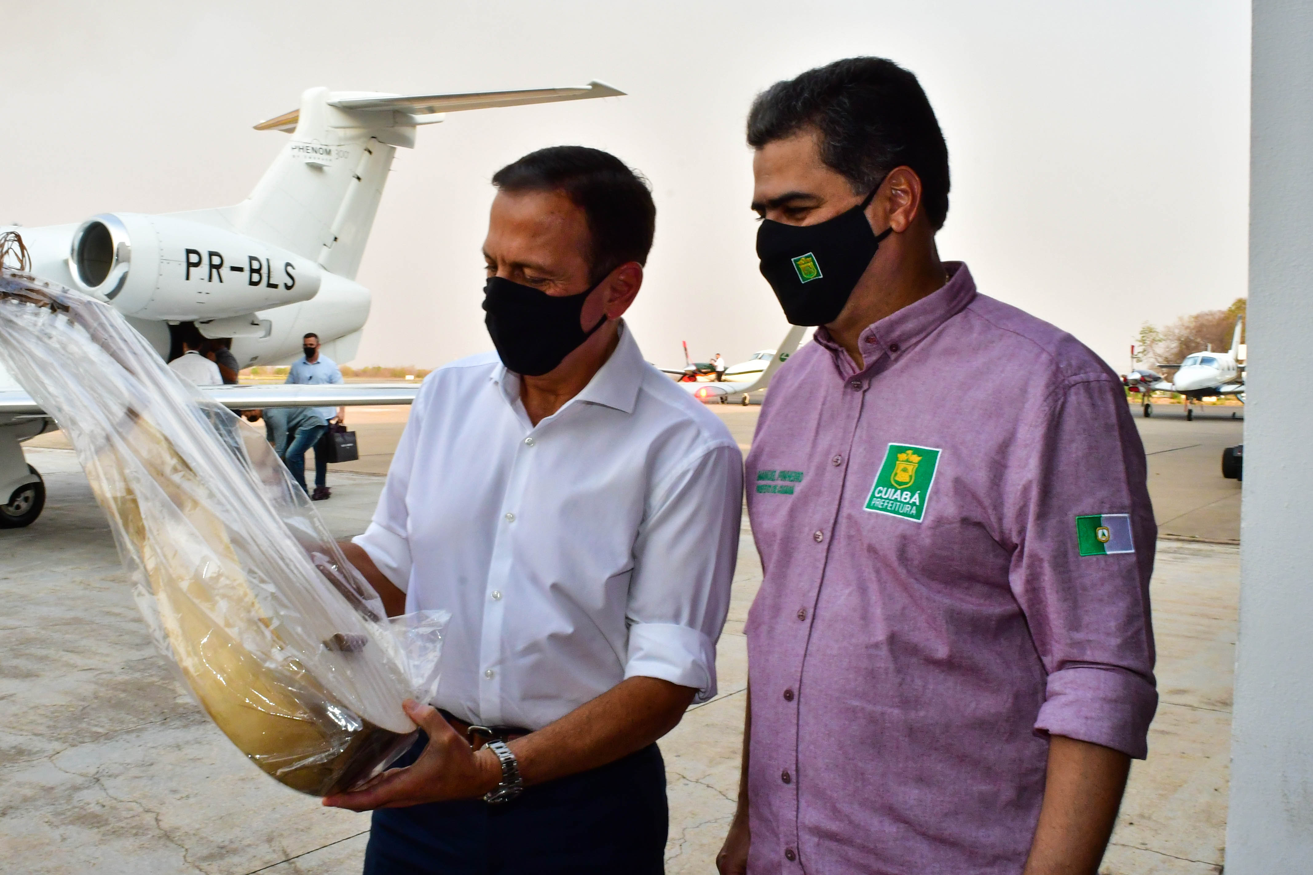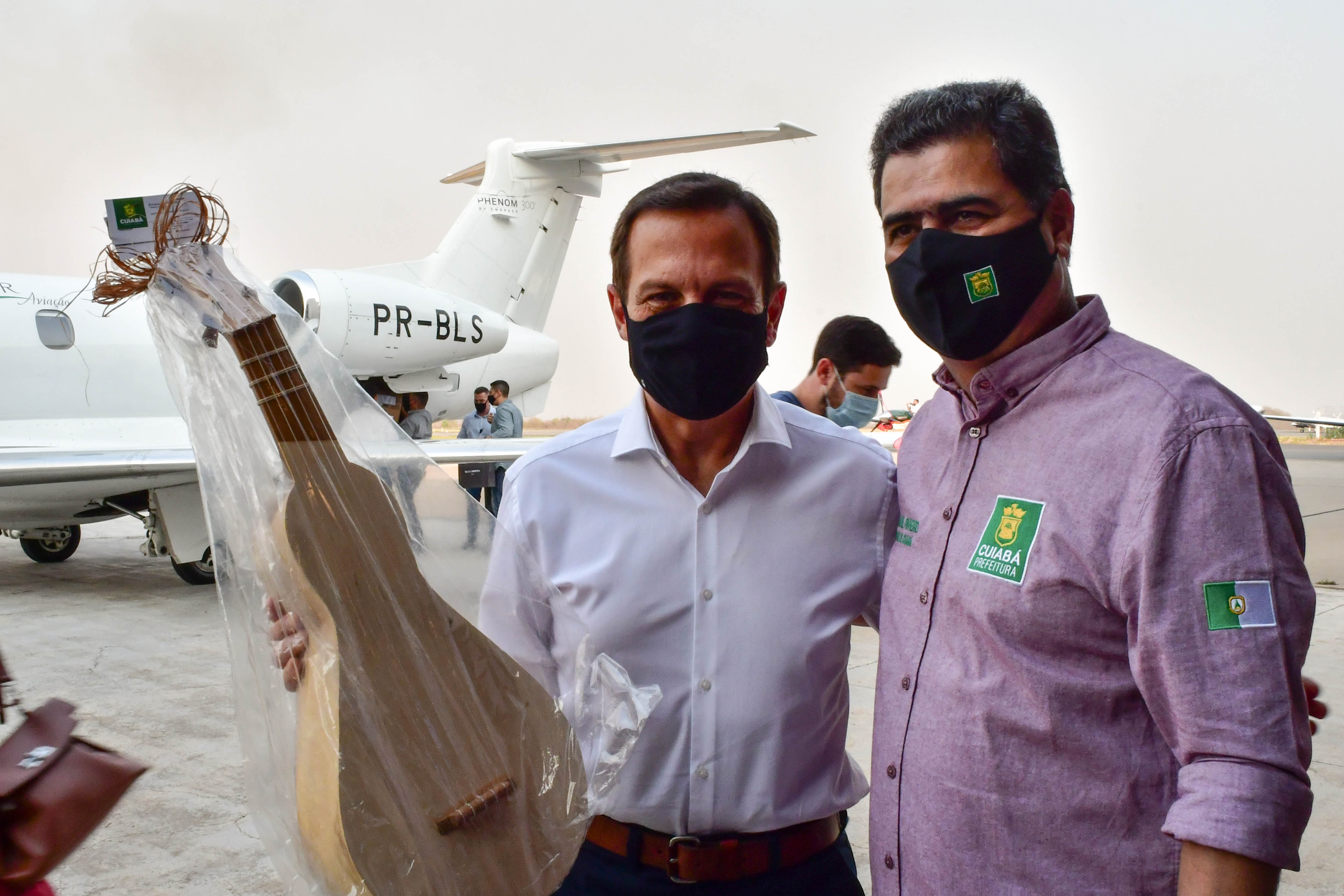 O prefeito de Cuiabá, Emanuel Pinheiro, recepcionou na tarde desta sexta-feira (24), o governador de São Paulo, João Doria, e o prefeito de São Bernardo do Campo, Orlando Morando, no aeroporto Marechal Rondon, em Várzea Grande. No encontro, Emanuel entregou a Doria, uma viola de cocho, que é um instrumento musical e símbolo da cultura cuiabana e pantaneira.