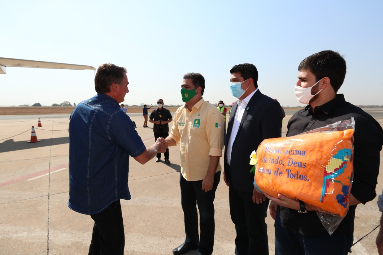 O prefeito de Cuiabá, Emanuel Pinheiro, recepcionou na manhã de hoje (19), no Aeroporto Internacional Marechal Rondon, o presidente da República, Jair Bolsonaro. Na ocasião, o gestor entregou para autoridade uma rede. A escolha do presente objetiva fomentar a cultura local. A rede, tecida por Rosangela Lemes de Oliveira Pereira, da Comunidade de Limpo Grande, em Várzea Grande, possui araras bordadas, foi especialmente confeccionada a frase: ‘Brasil acima de tudo, Deus acima de todos’.