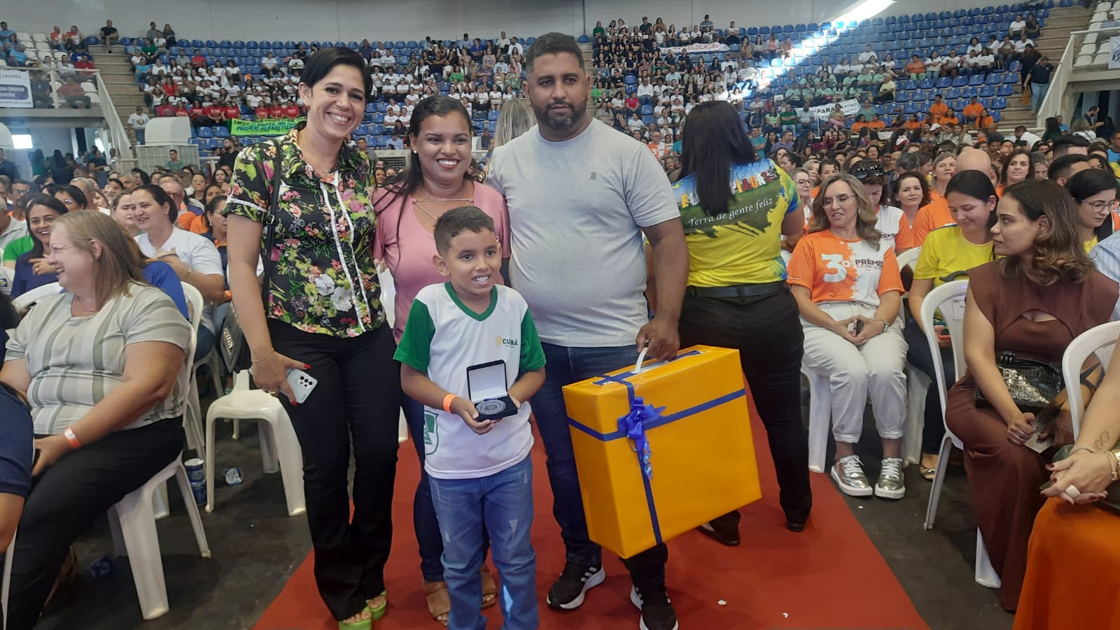 O prêmio alfabetiza MT também reconheceu os resultados apresentados por 14 estudantes do 2º ano do ensino fundamental, que receberam medalhas e um videogame. O estudante João Vitor Pereira de Souza, que em 2023 era atendido na EMEB Liberdade foi um dos premiados. Acompanhado dos pais ele disse estar bastante feliz. “Como pais estamos orgulhosos”, disse a mãe Flaime Pereira Macena.