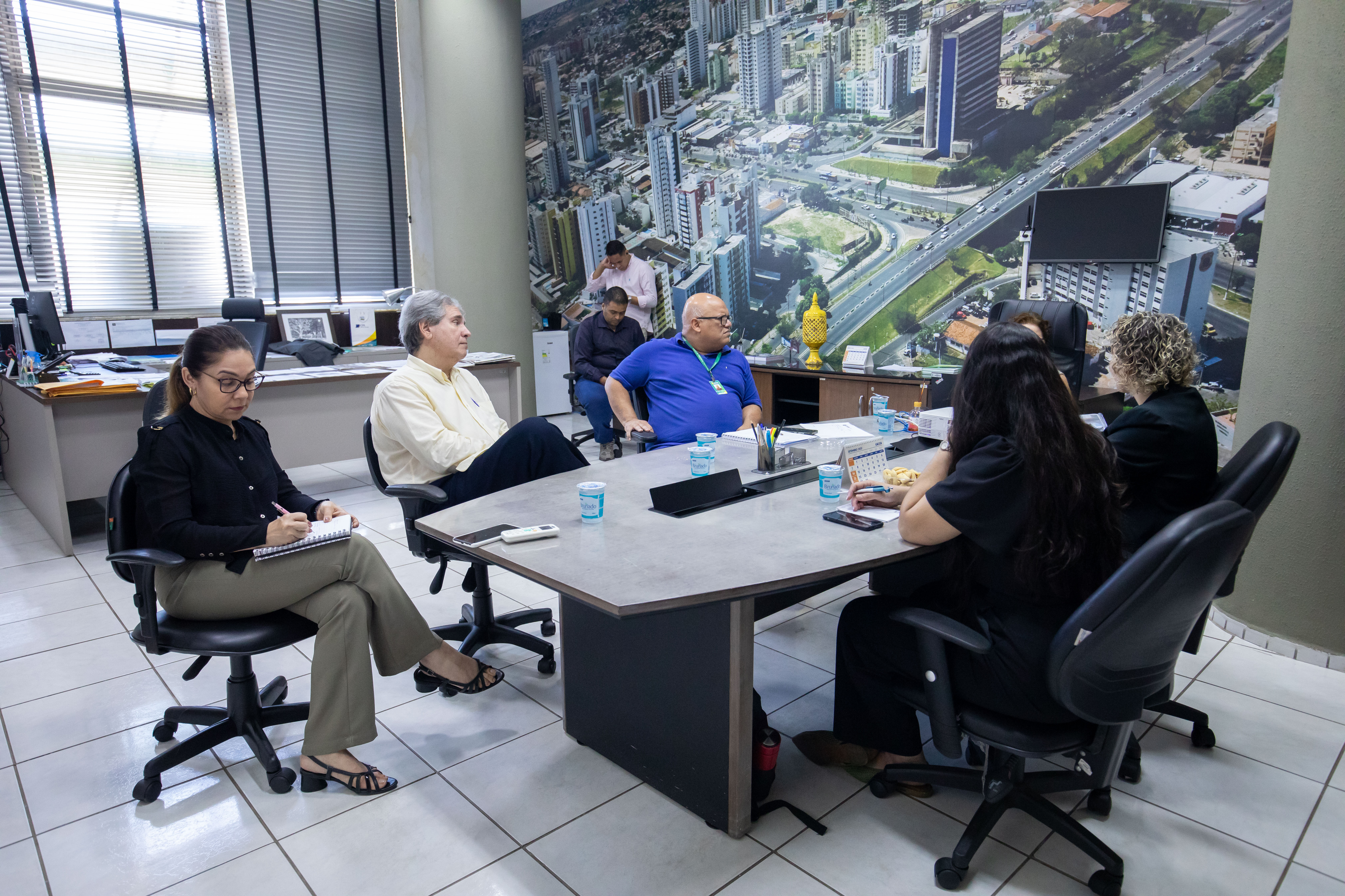A foto mostra o secretário de Planejamento, Nivaldo Carvalho, sentado em uma cadeira de cor preta, prestando atenção a um diálogo entre servidores da Prefeitura de Cuiabá e da Prefeitura de Sinop. O ambiente é a sala da Secretaria Municipal de Planejamento, localizada no Palácio Alencastro, sede da Prefeitura de Cuiabá.