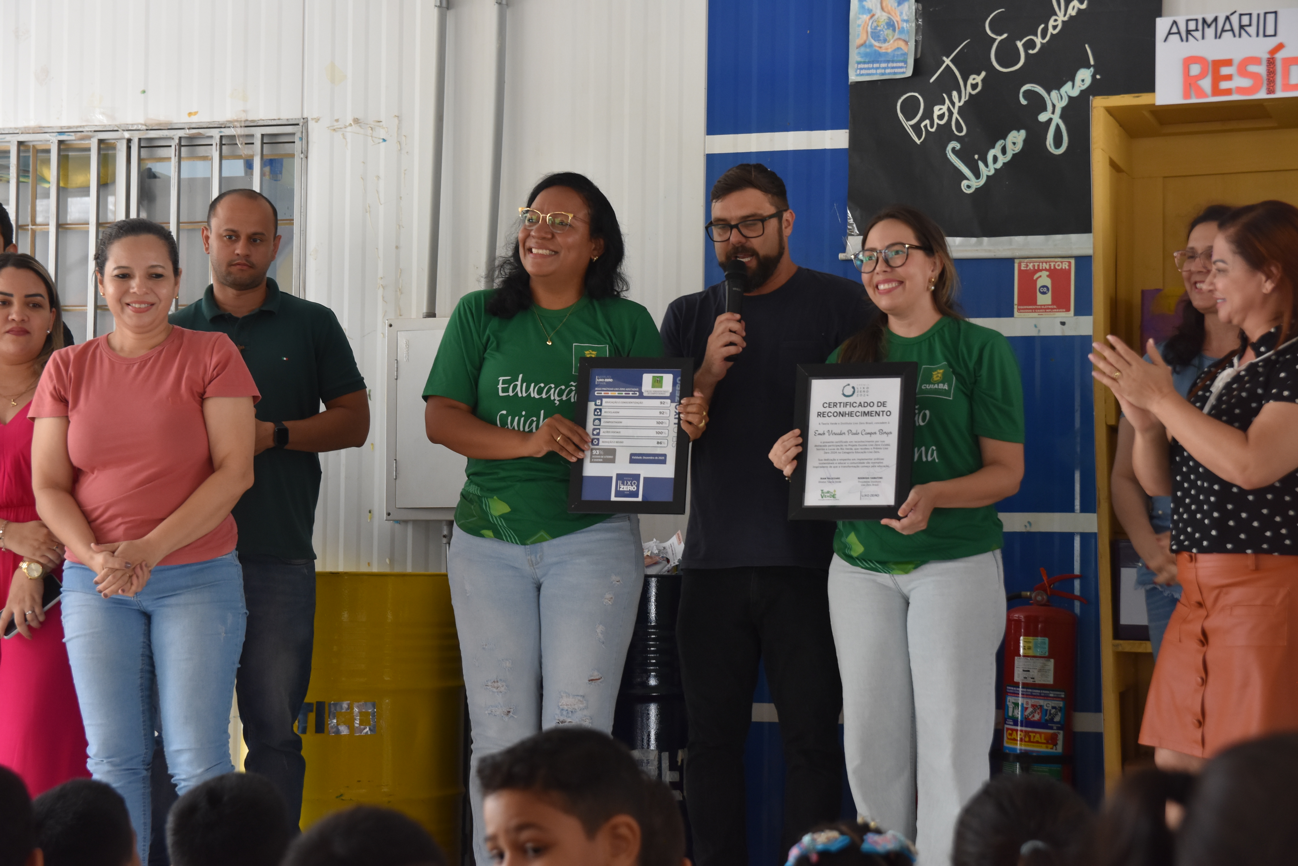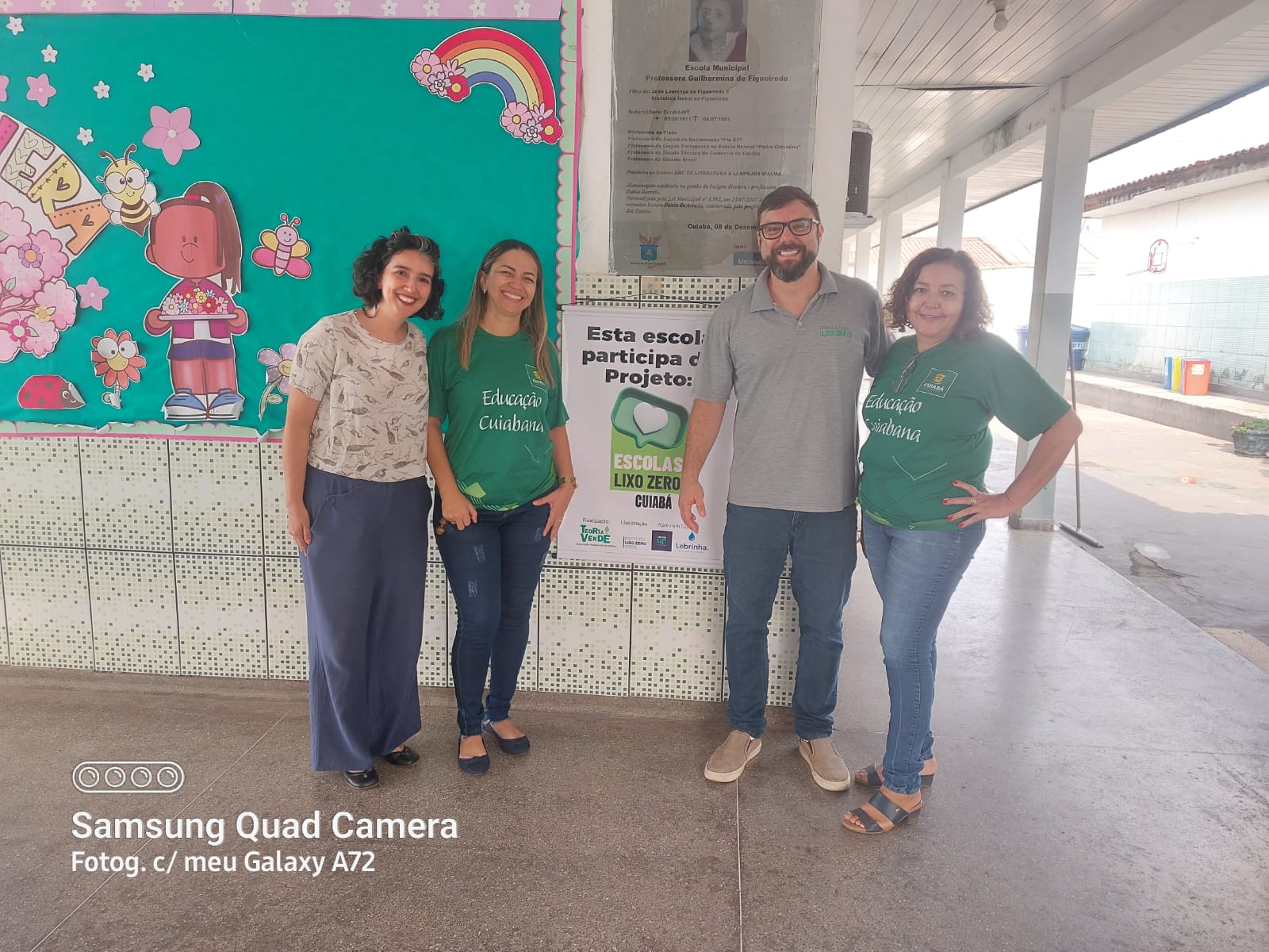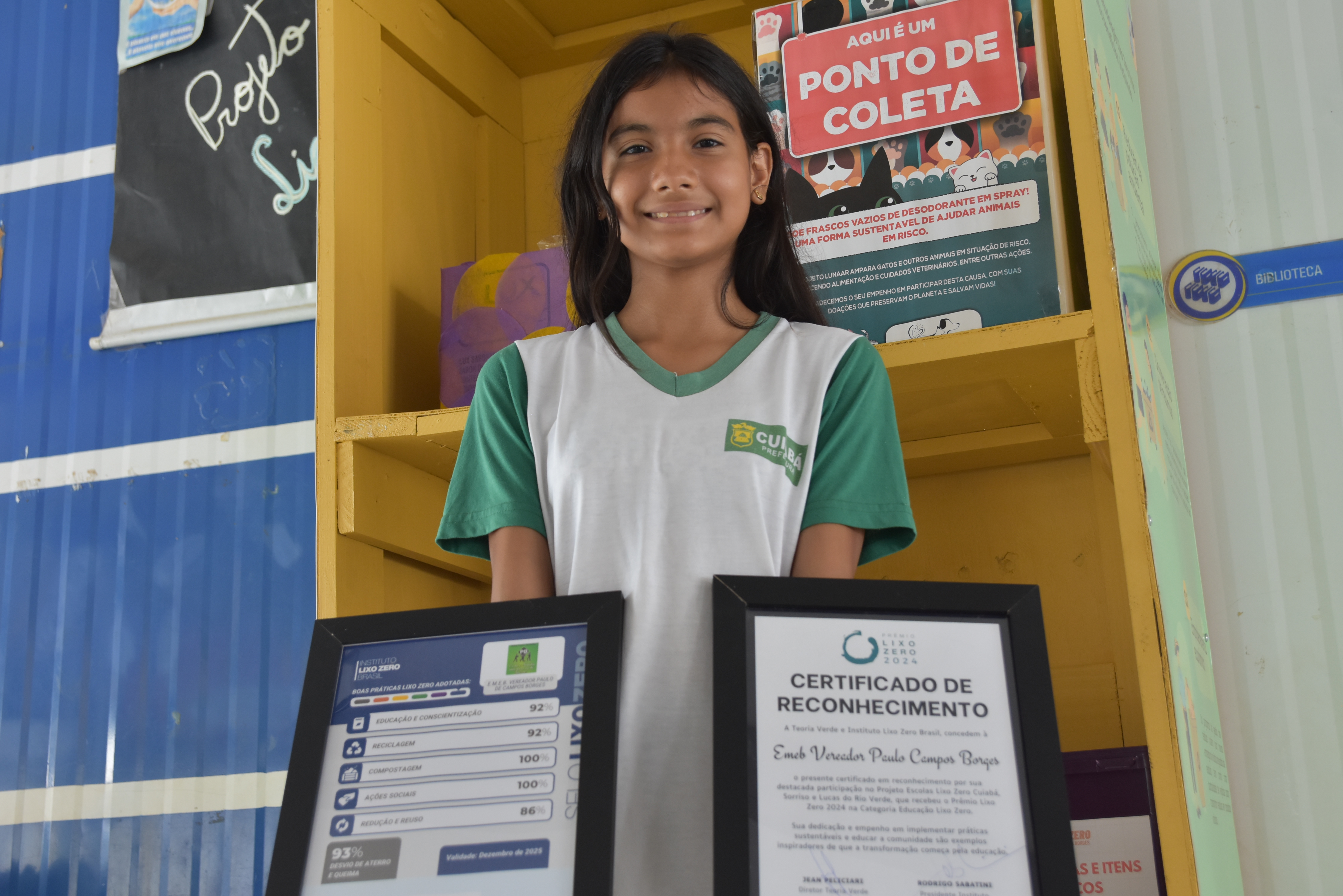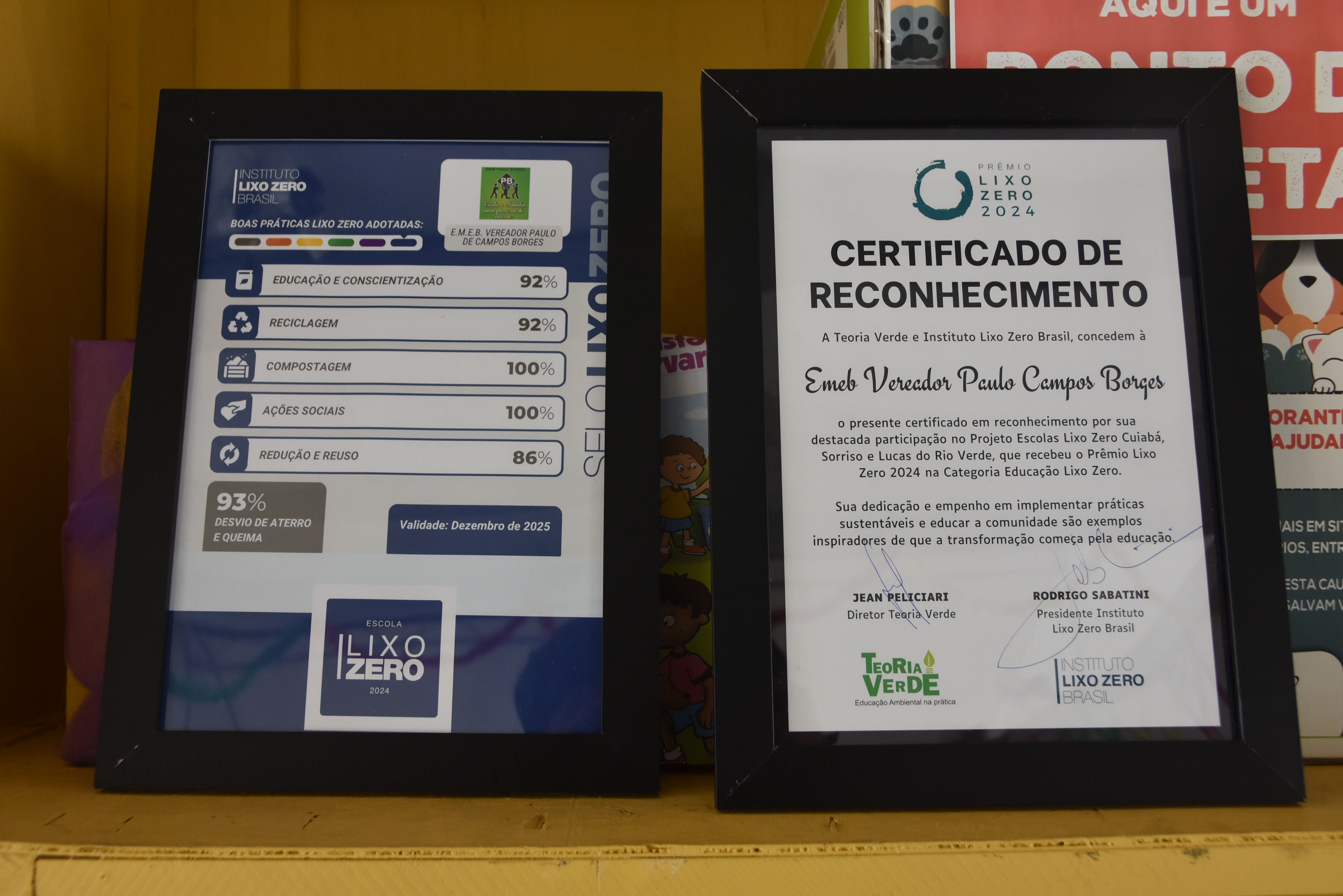 Duas unidades educacionais da rede pública municipal de Cuiabá receberam o Prêmio Lixo Zero, na categoria educação, a Escola Municipal de Educação Básica (EMEB) Vereador Paulo Borges de Campos, localizada no Jardim Industriário I, na grande Coxipó, primeira colocada em Mato Grosso, e a EMEB Professora Guilhermina de Figueiredo, localizada no bairro Carumbé. Os selo e certificado foram entregues na semana passada pelo diretor da Teoria Verde e consultor Lixo Zero em Cuiabá, Jean Peliciari, com a presença da secretária-adjunta de Educação, Débora Marques Vilar, equipe gestora, professores, profissionais da educação e estudantes.