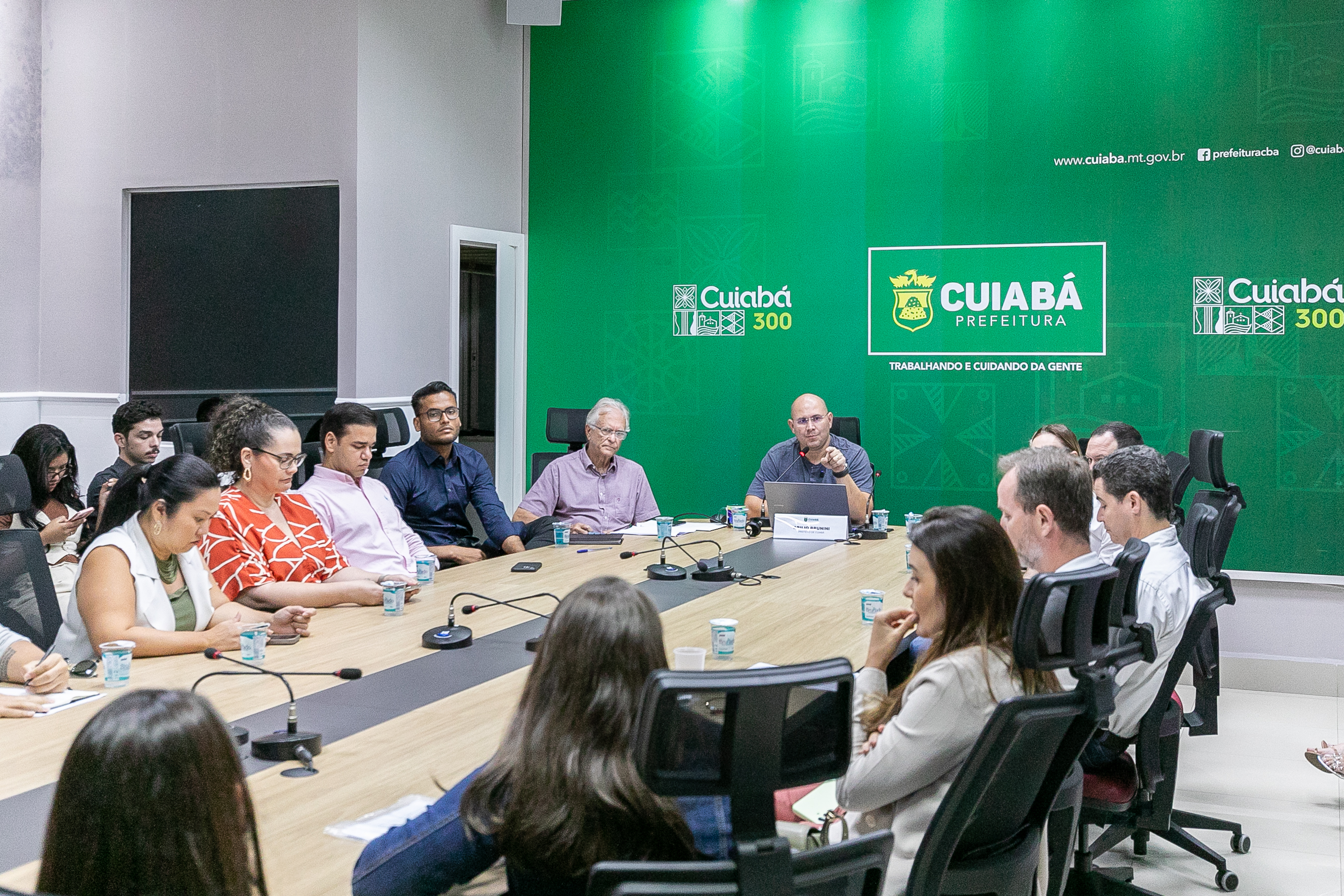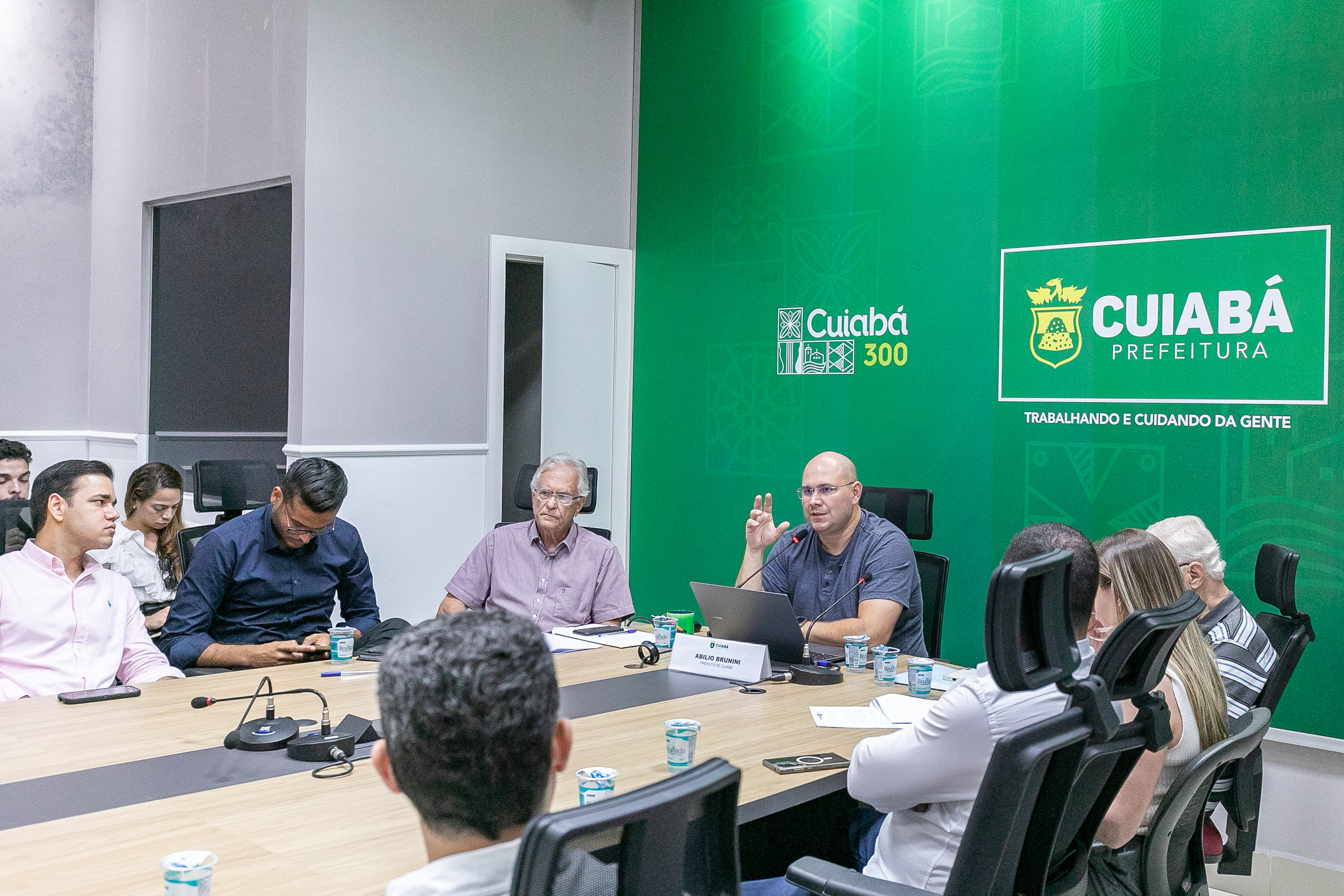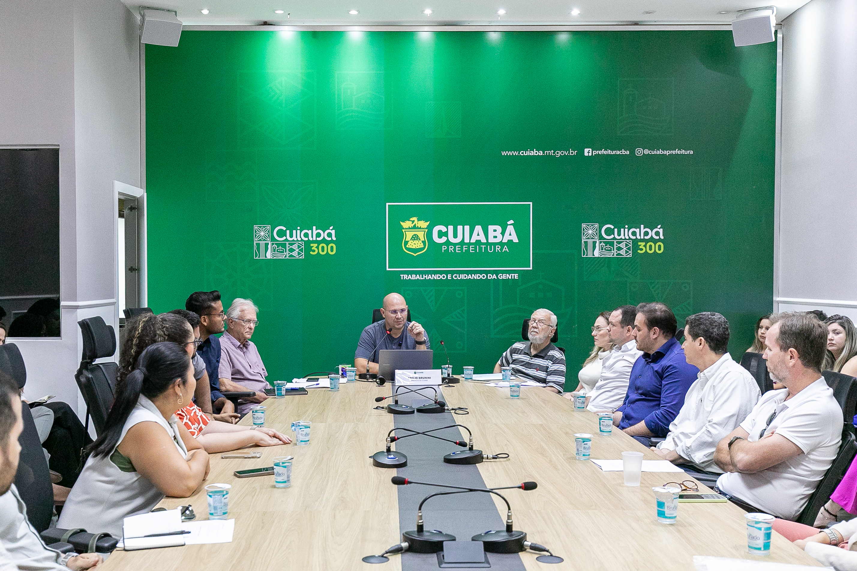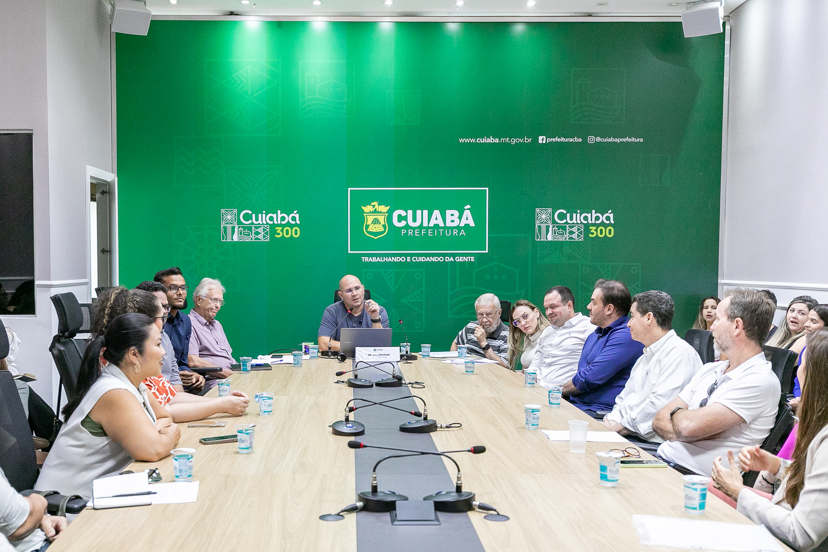 O prefeito Abilio está no centro de uma mesa em formato oval debatendo ideias sobre a nova fase do 'Destrava Cuiabá. Ao seu lado está o secretário José Portocarrero e vários representantes de entidades do setor de construção ão civil, arquitetura e planejamento.