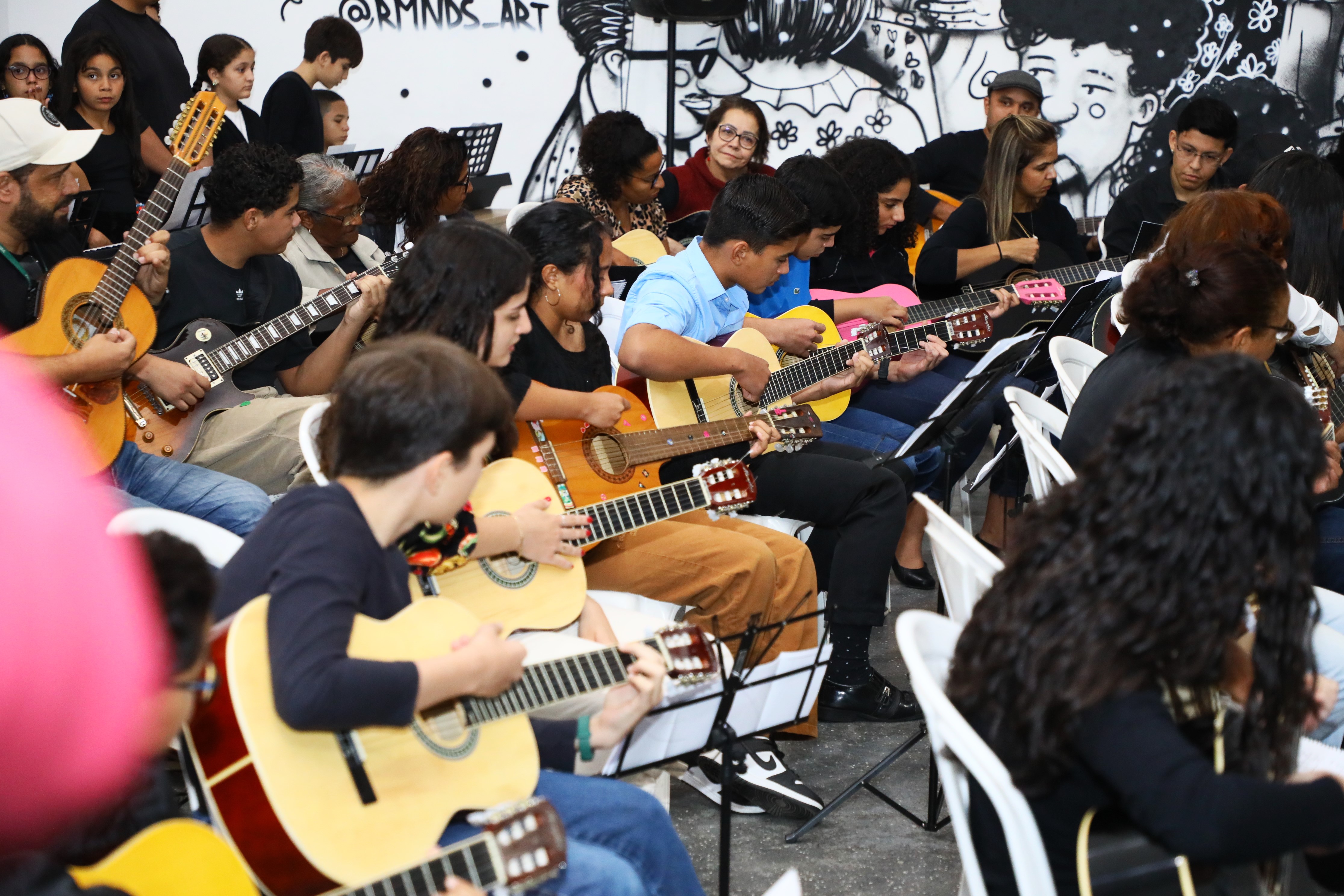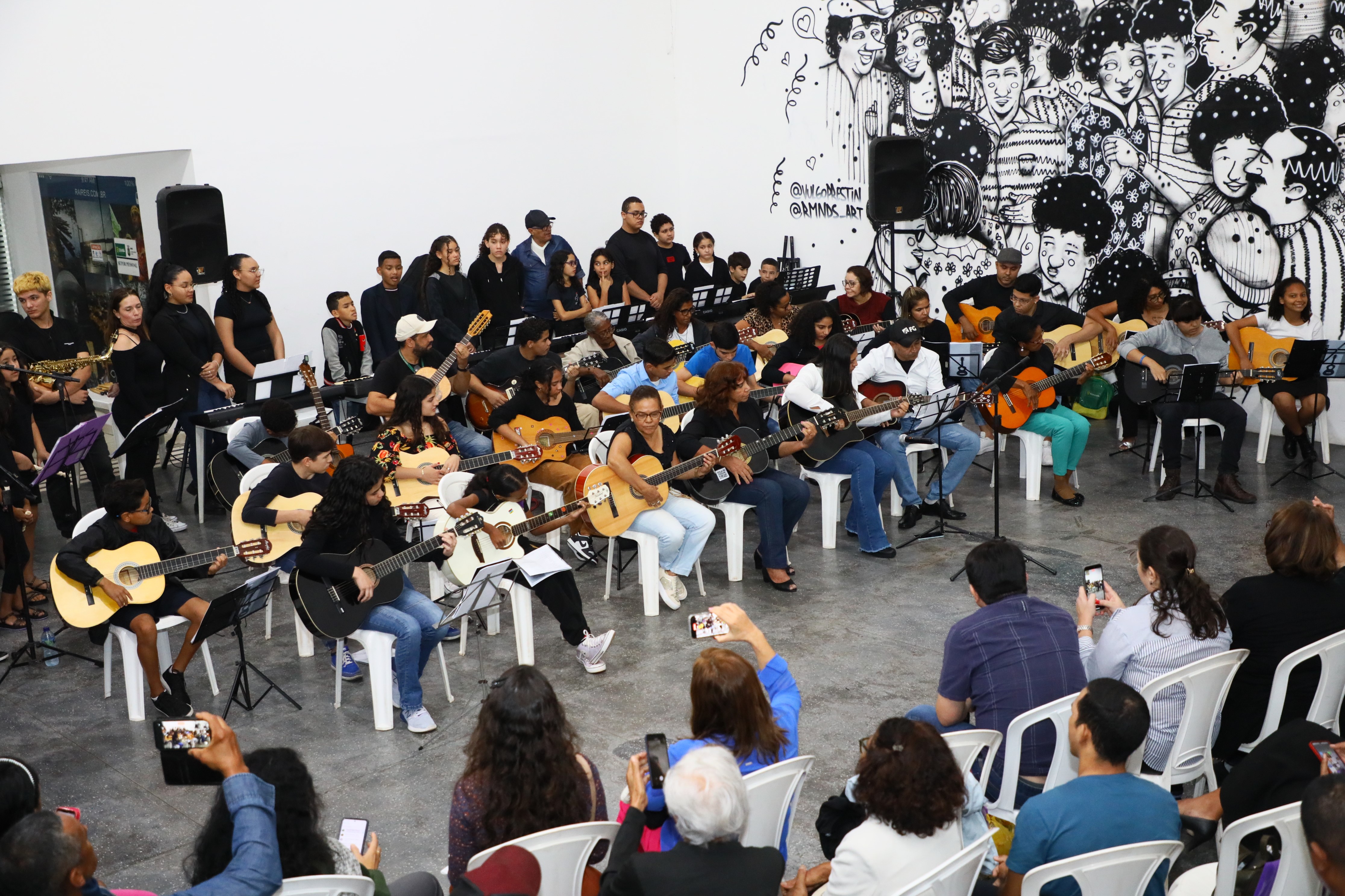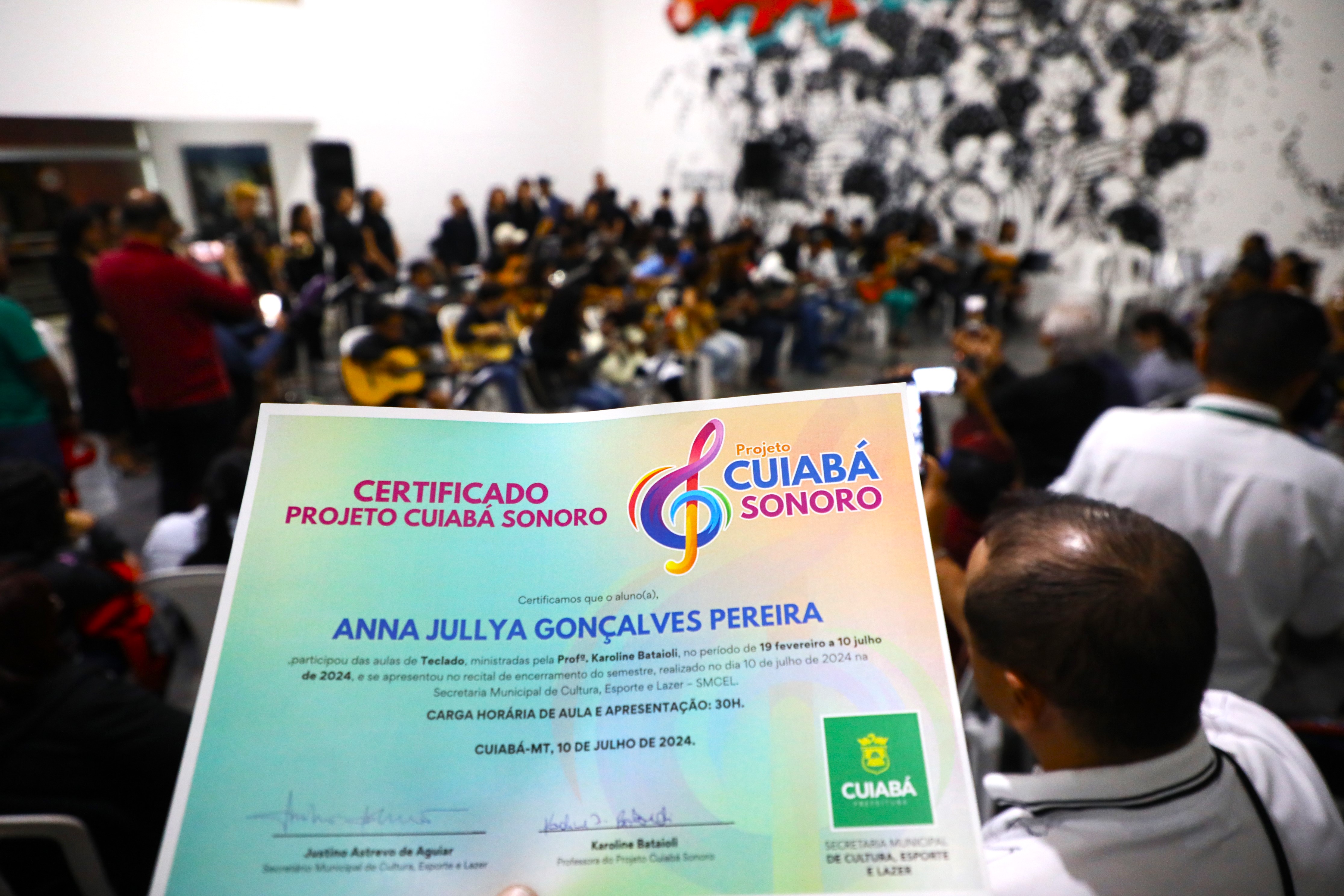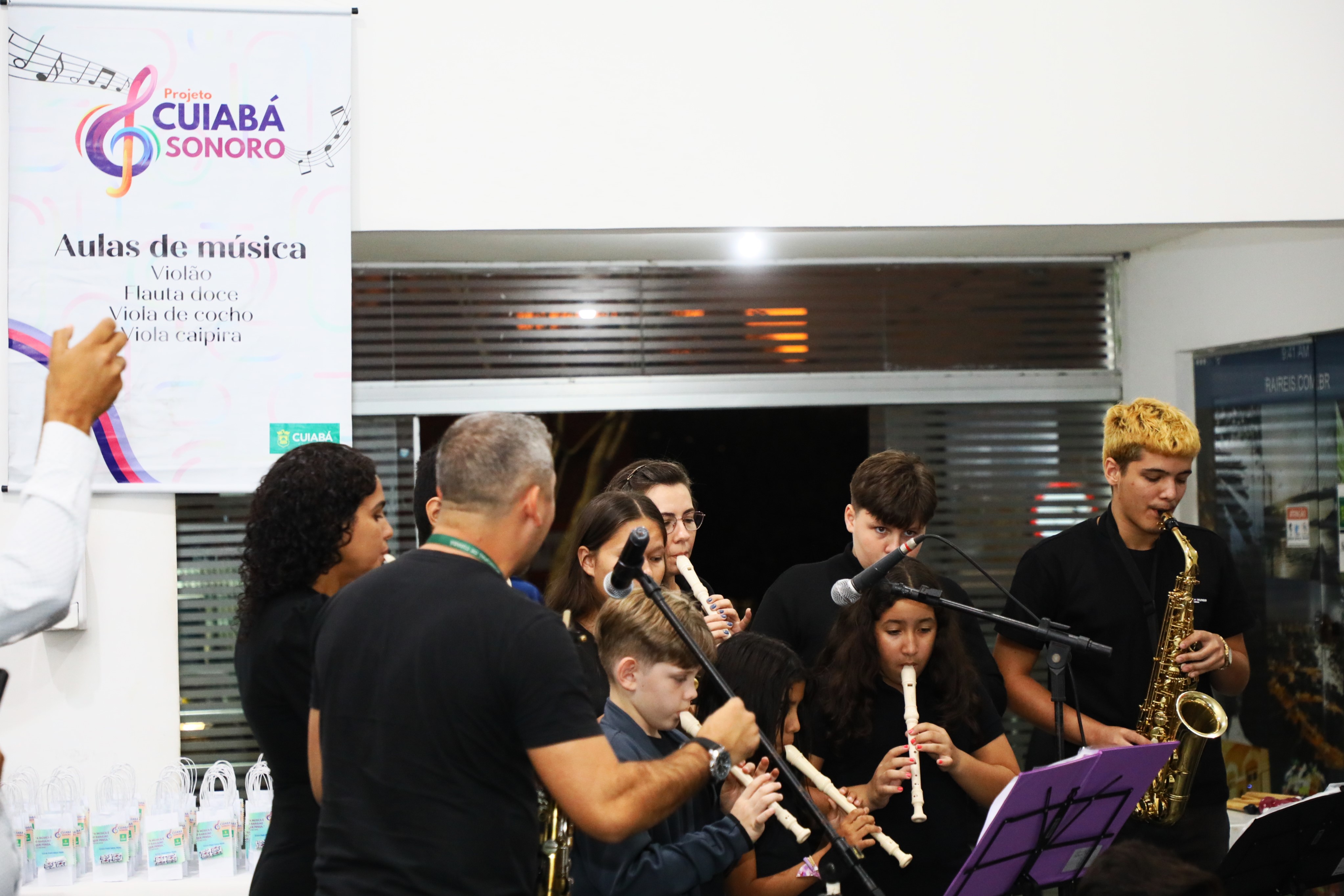Pais, professores dos alunos que integram o Projeto Cuiabá Sonoro e demais amigos prestigiaram uma belíssima apresentação musical na noite de quarta-feira (10), na sede da Secretaria Municipal de Cultura, Esporte e Lazer, no encerramento das atividades do primeiro semestre de 2024. Com mais de 80 integrantes de idades variadas, os aprendizes demonstraram o que aprenderam nesse período nos cursos de violão, violoncelo, flauta doce, guitarra e teclado. As aulas são disponibilizadas gratuitamente pela Prefeitura de Cuiabá, por meio da Secretaria Municipal de Cultura, em três polos da cidade: Museu da Imagem e do Som Lázaro Papazian (Misc), Espaço Cultural Silva Freire e na própria Secretaria de Cultura. Além do certificado, os alunos receberam uma lembrancinha do projeto.
