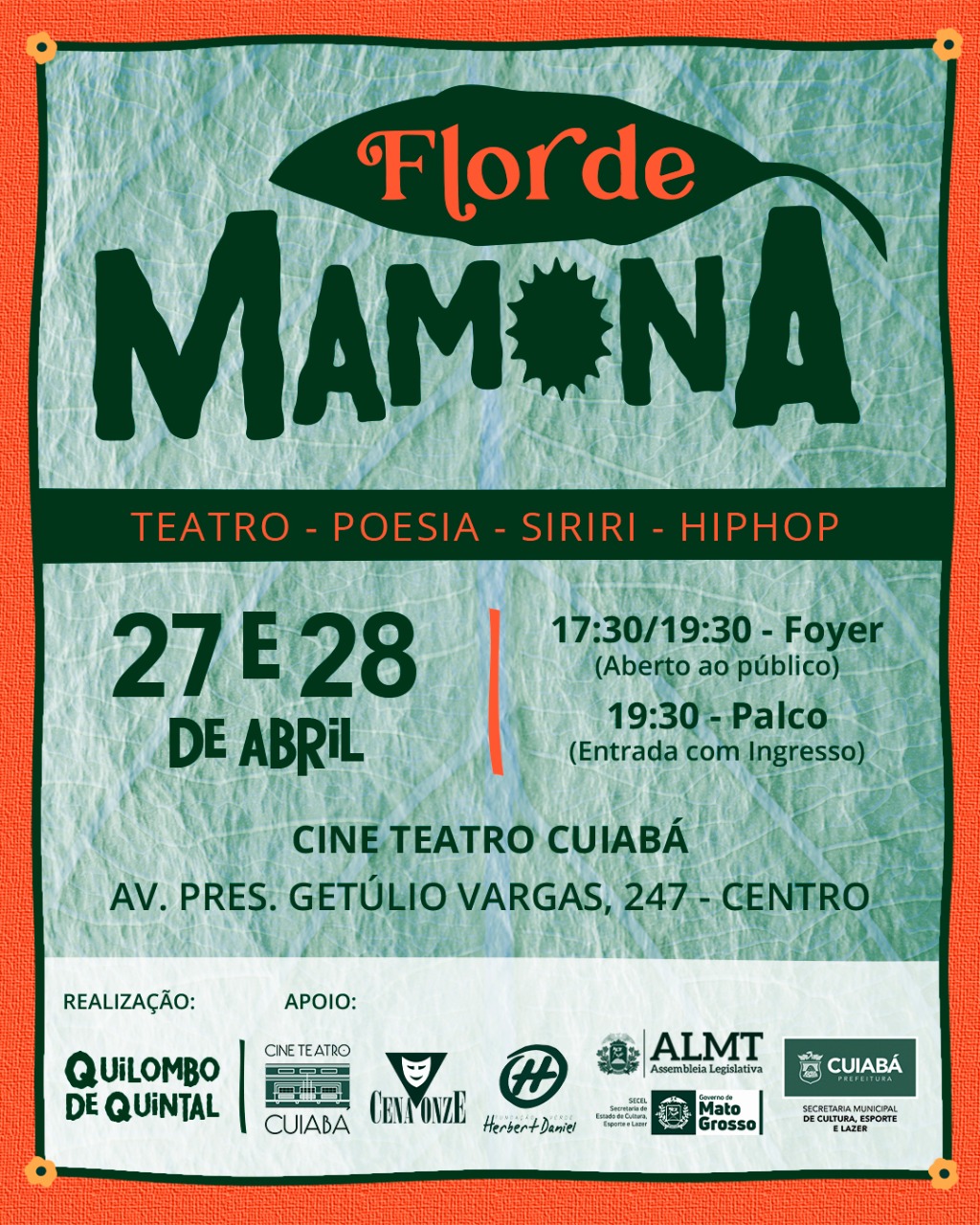 O Coletivo Quilombo de Quintal apresenta nos dias 27 e 28 de abril, no Cine Teatro Cuiabá, o espetáculo Flor de Mamona. As apresentações marcam as comemorações do aniversário de Cuiabá, que completou 303 anos no dia 8 de abril. O grupo é formado por artistas da Baixada Cuiabana e propõe um encontro cênico inédito entre a poesia, o teatro, o hip hop e o siriri.