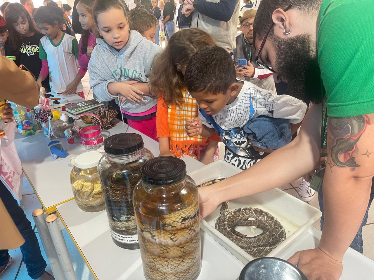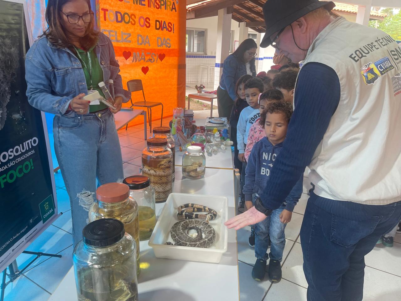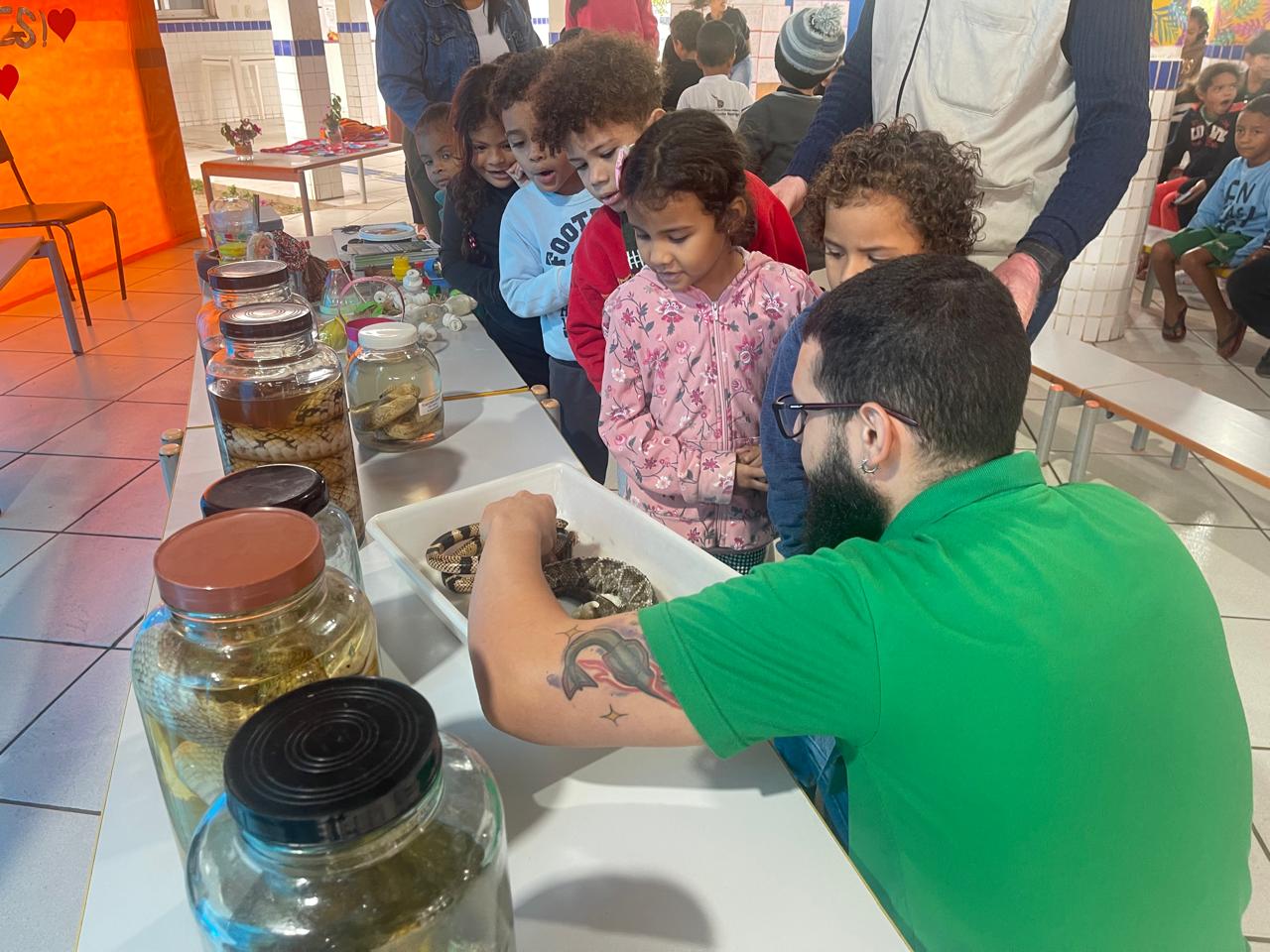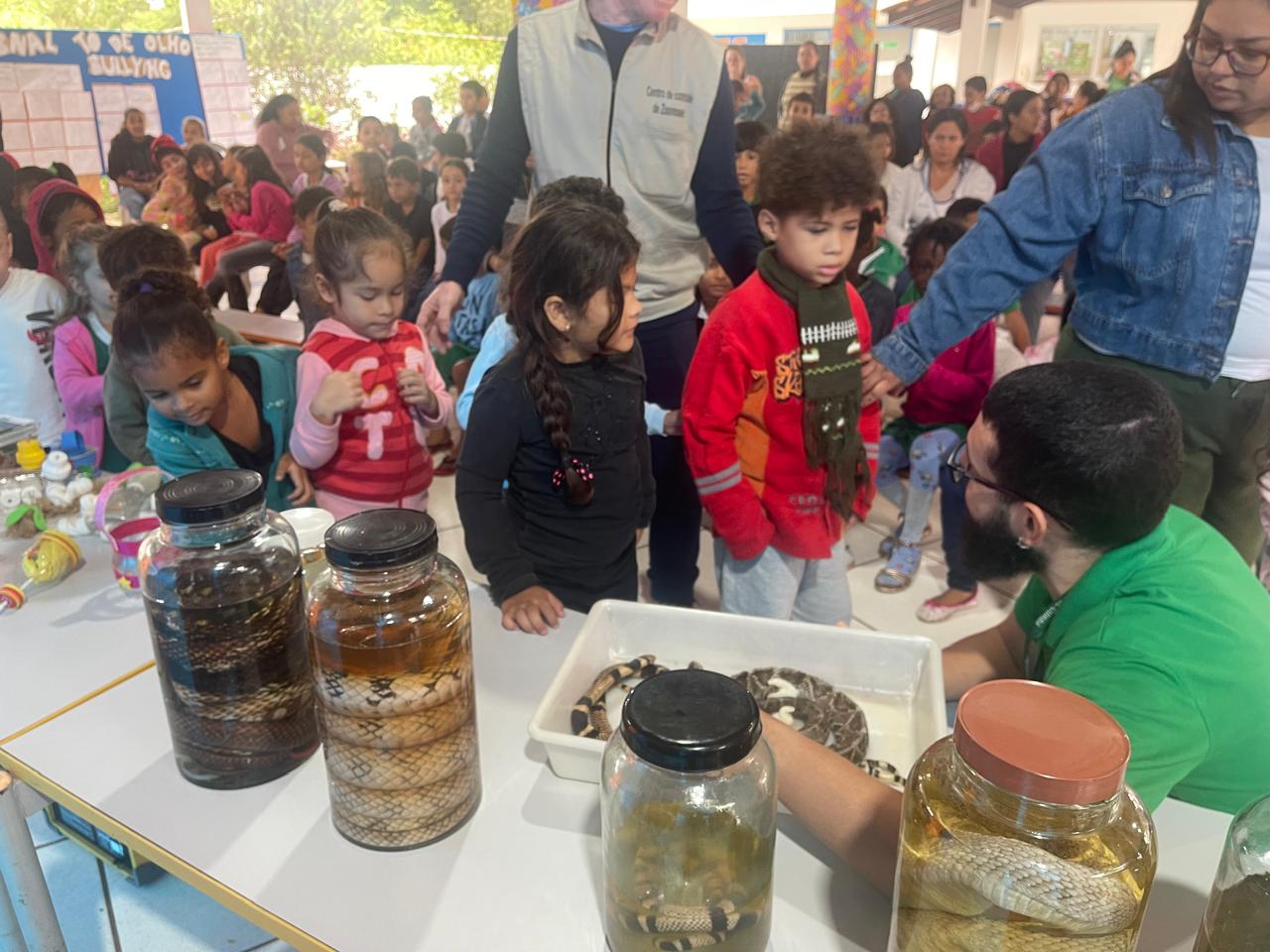 Cerca de 119 estudantes da Pré-Escola e dos 1º, 2º, 3º e 4º anos, além de 20 profissionais que atuam na unidade educacional, participaram da atividade, que também incluiu orientações sobre cuidados com animais peçonhentos. “Os animais peçonhentos, como serpentes e escorpiões, são de interesse médico porque podem causar acidentes graves. A primeira recomendação é nunca manejar esses animais. Ao verificar a presença deles, deve-se chamar um especialista ou o Corpo de Bombeiros para fazer a remoção do animal de forma segura. Estamos aqui para ensinar as crianças como proceder e explicar que matar animais silvestres é crime ambiental”, disse o biólogo Paulo Pazóti.
