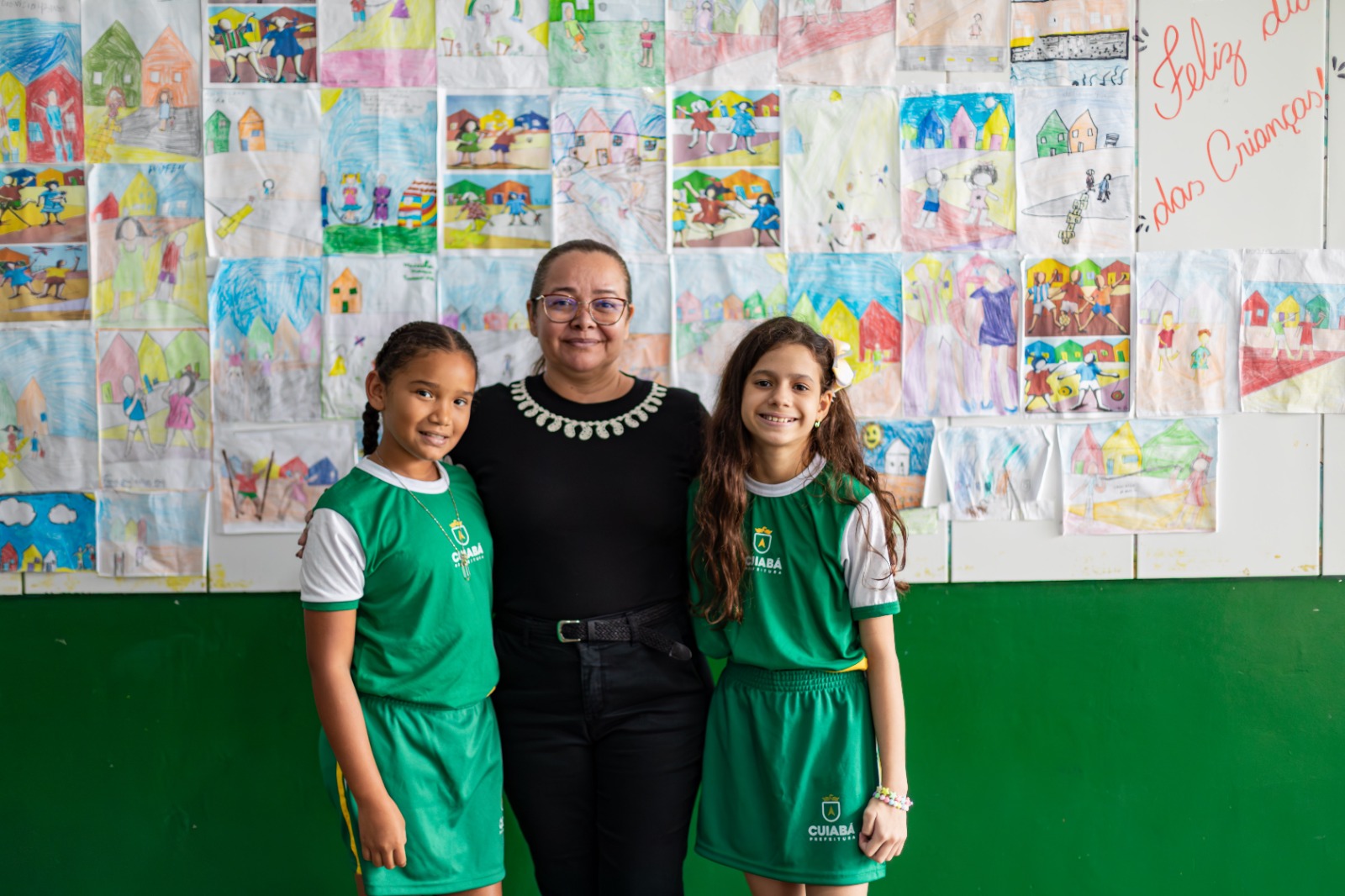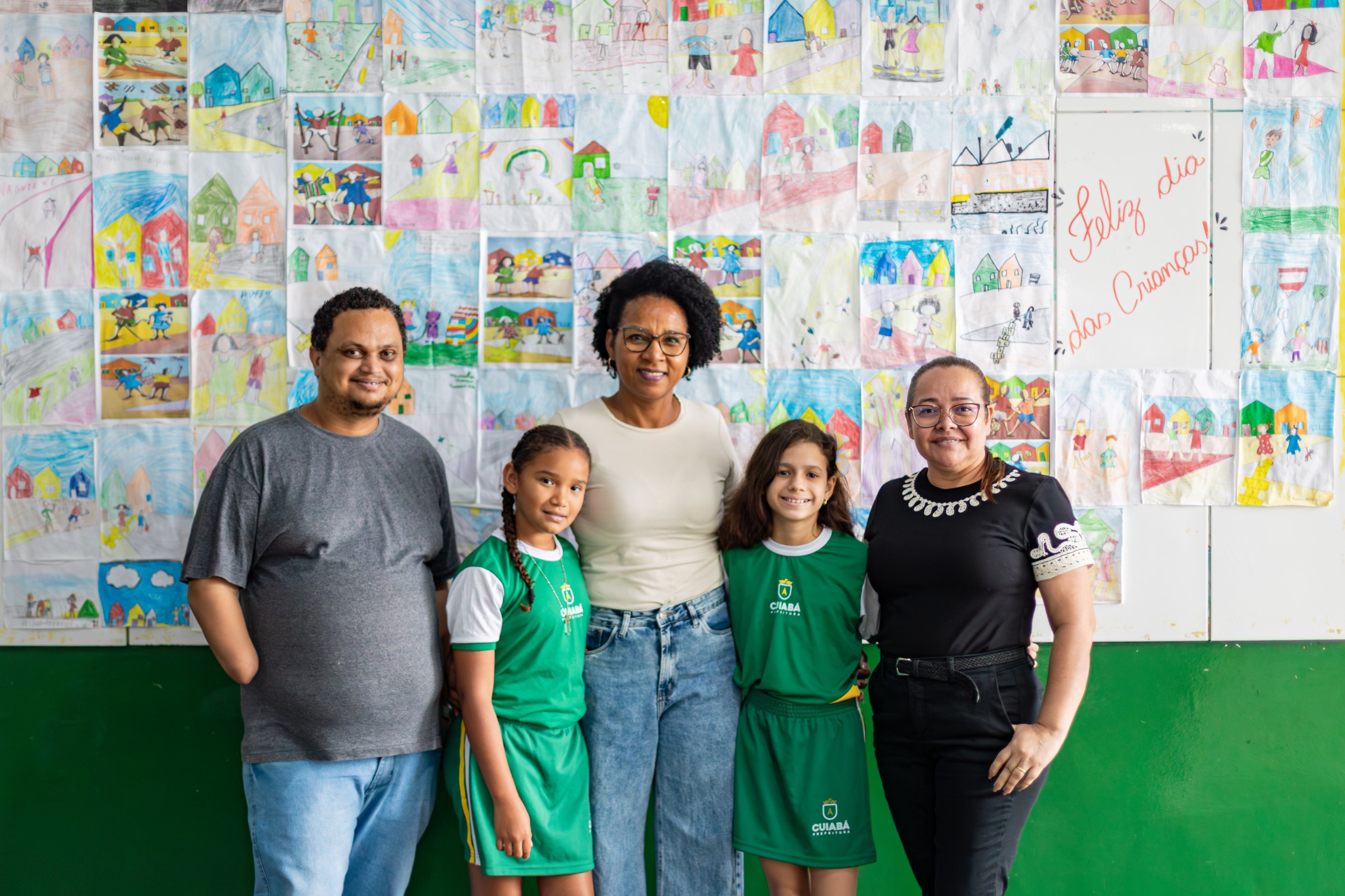 A foto ilustra duas crianças vestidas com uniforme oficial da Prefeitura de Cuiabá. Elas estão acompanhadas das mães e servidores. No fundo, é possível visualizar uma parede com diversos desenhos escolares.