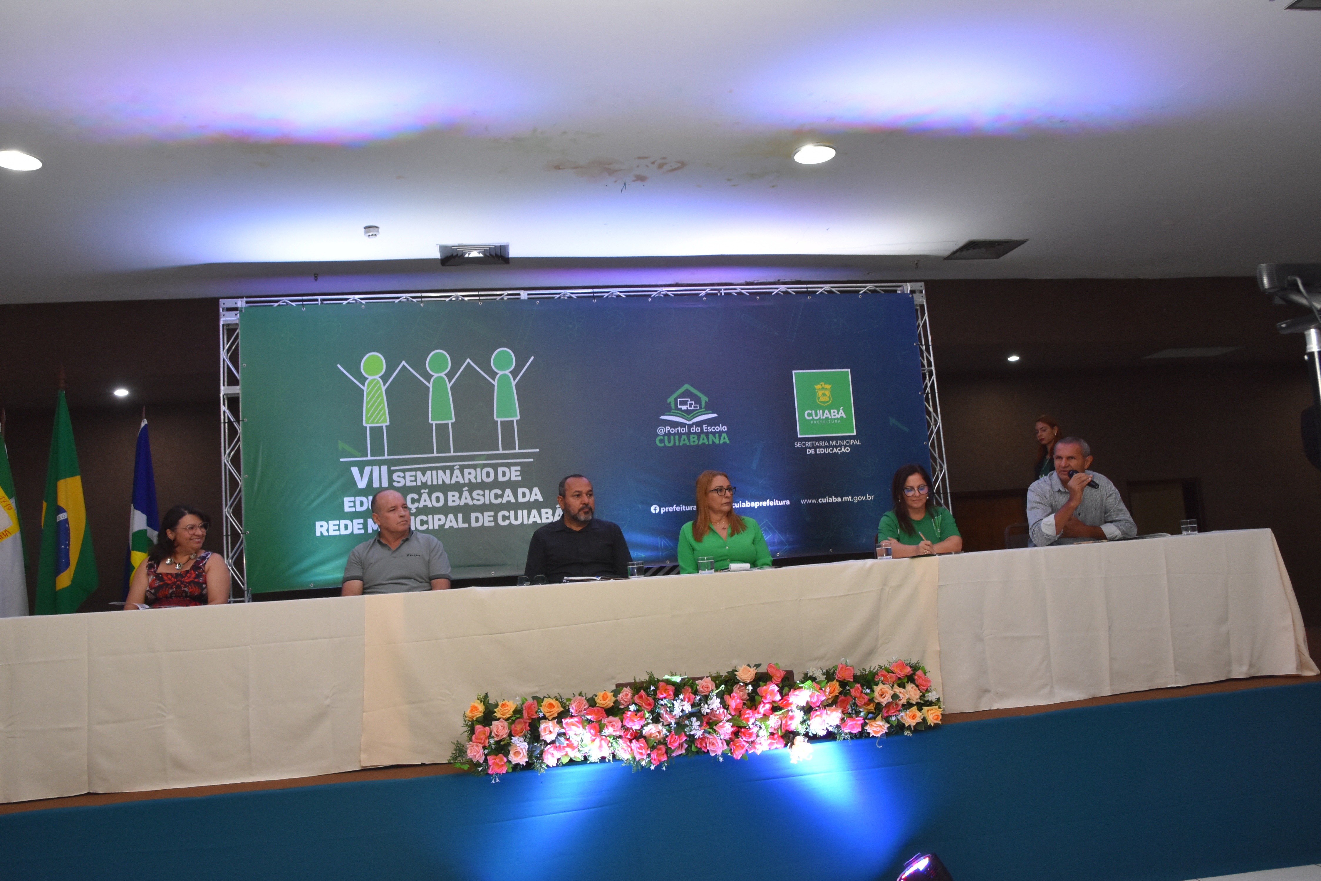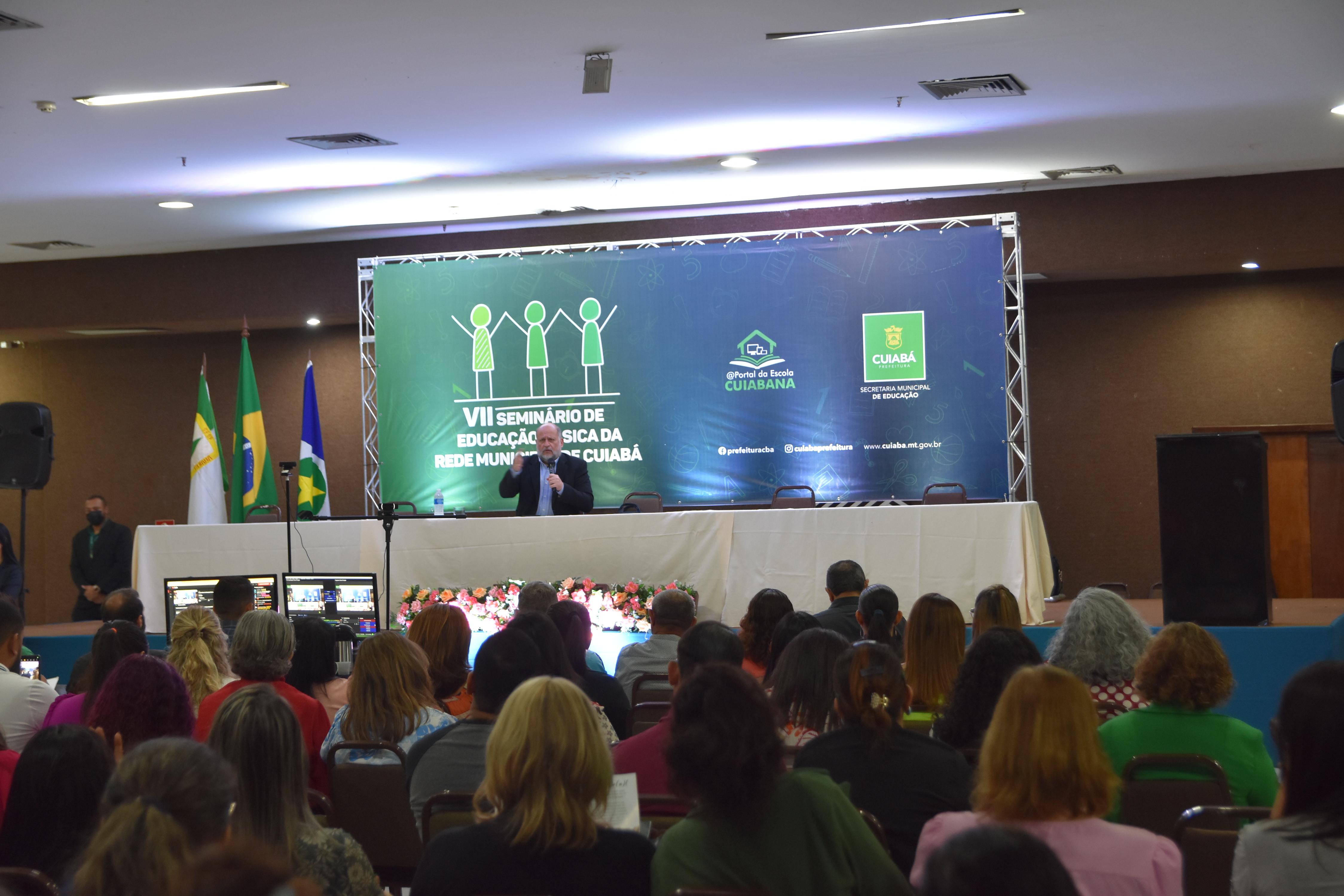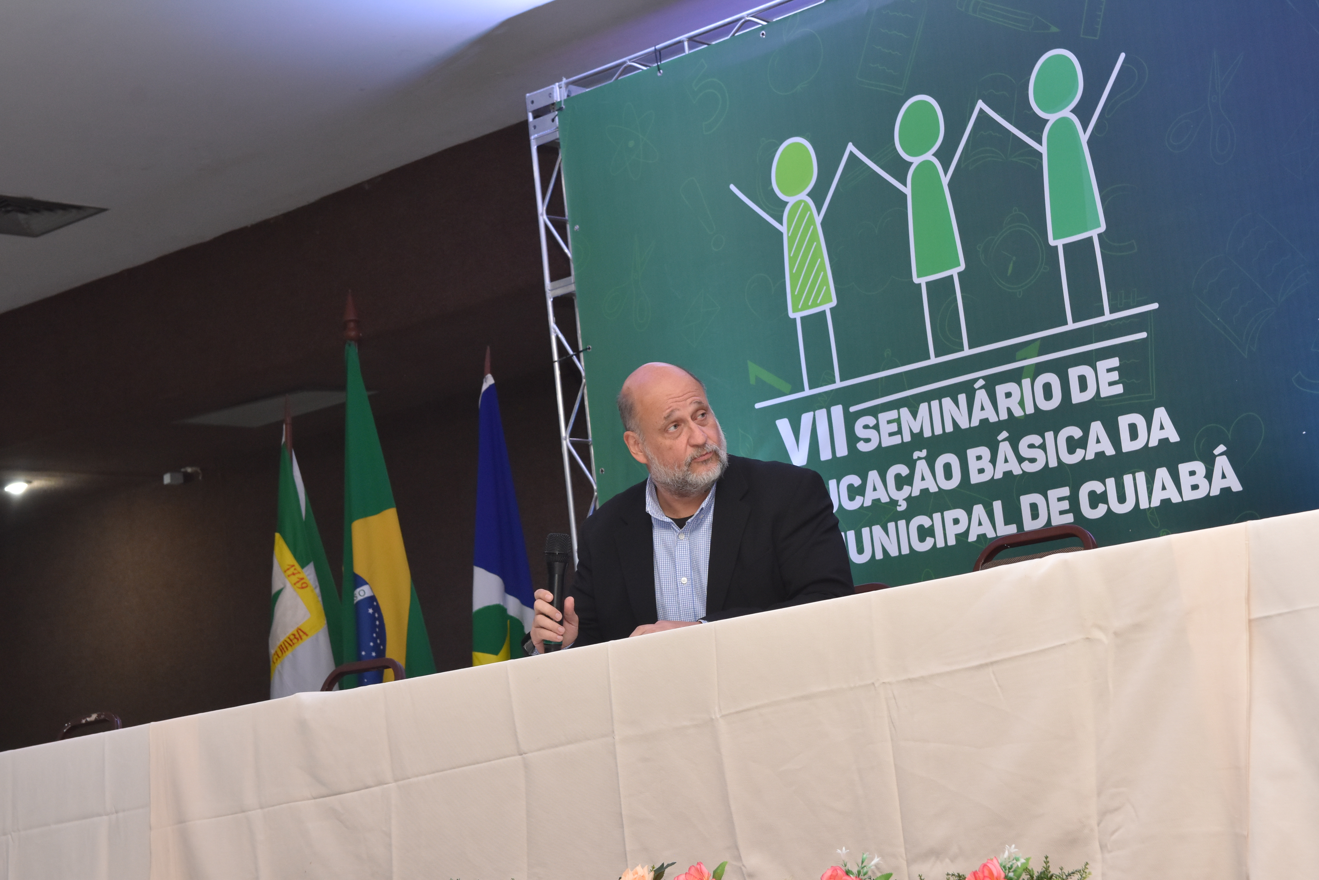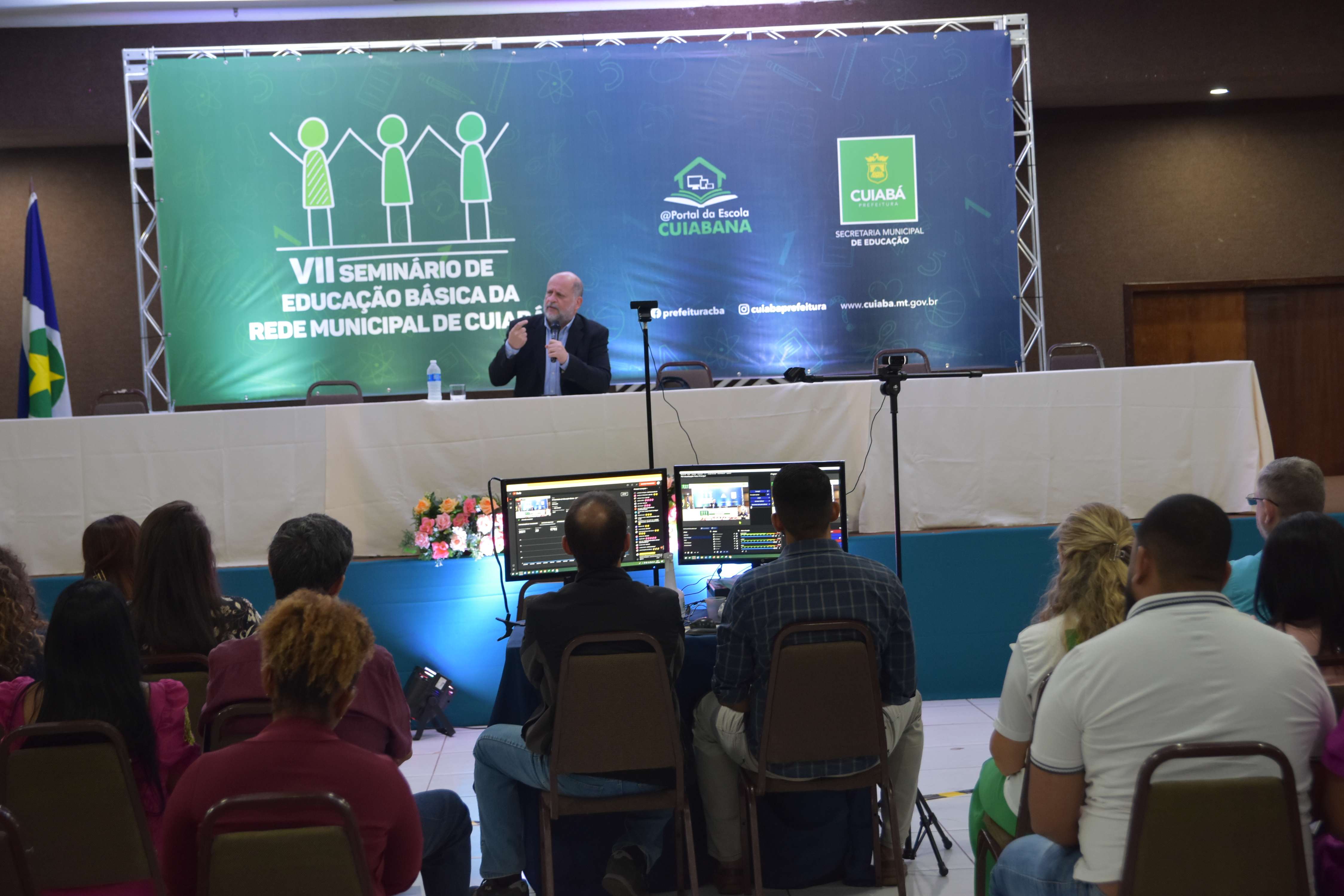 Profissionais da rede pública municipal de Educação participaram, na segunda-feira (17), do 7º Seminário de Educação Básica. O evento, no formato híbrido, com palestra presencial para 420 gestores, e transmissão da programação pelo canal da Escola Cuiabana no YouTube, abriu o calendário escolar do segundo semestre com palestra do Prof. Clóvis de Barros Filho.