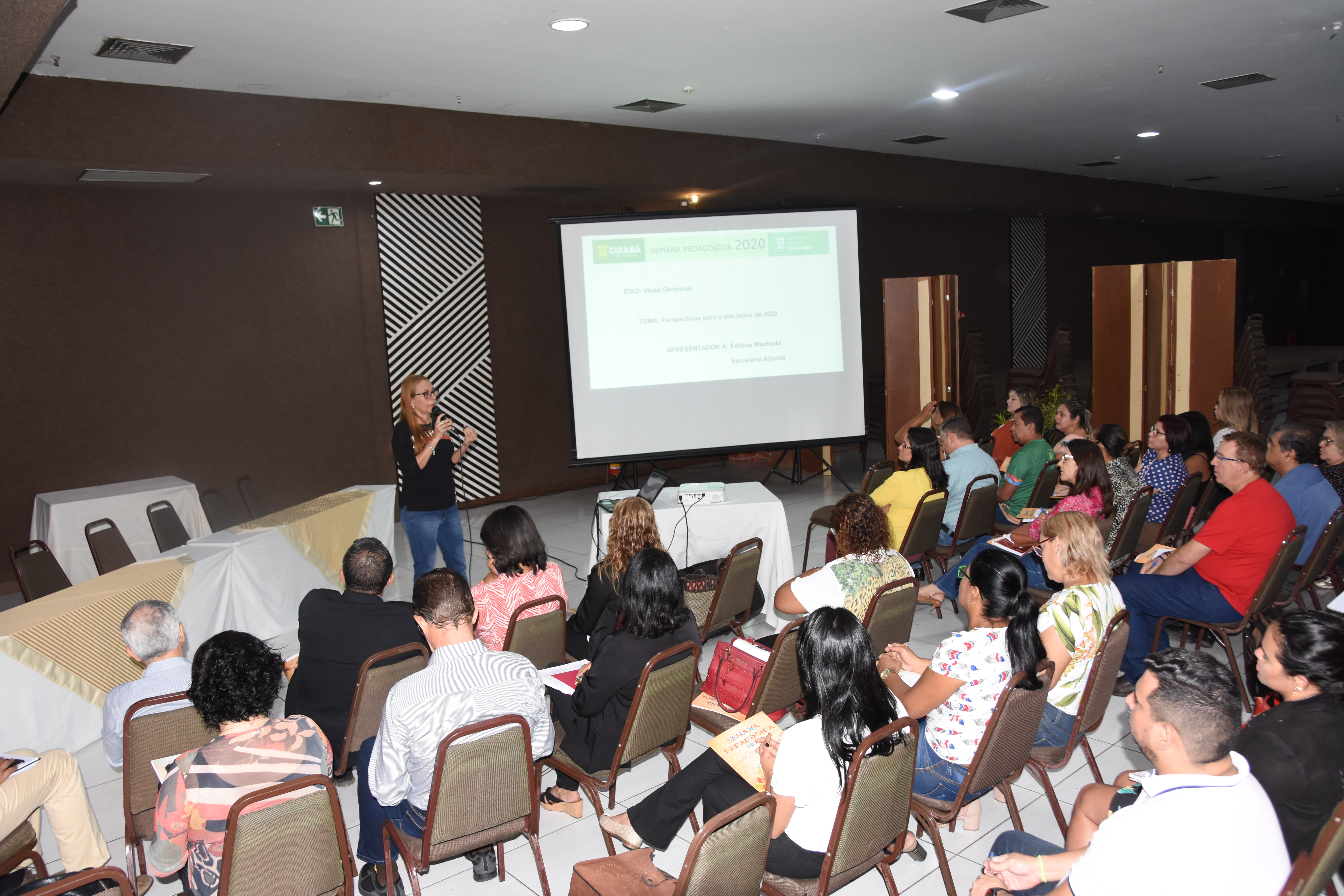A Semana Pedagógica da Escola Cuiabana 2020 foi aberta na terça-feira (21) pela secretária adjunta de Educação, Edilene de Souza Machado que falou sobre os desafios e metas da Educação neste ano. “Ao longo desses 10 dias de formação vamos trabalhar temas importantes para a Educação de Cuiabá como a Escola da Inteligência, o Programa de Alfabetização (ProAC), o Programa de Melhoria da Proficiência entre outros. Esta é uma forma de melhorar o trabalho na escola”, destacou.