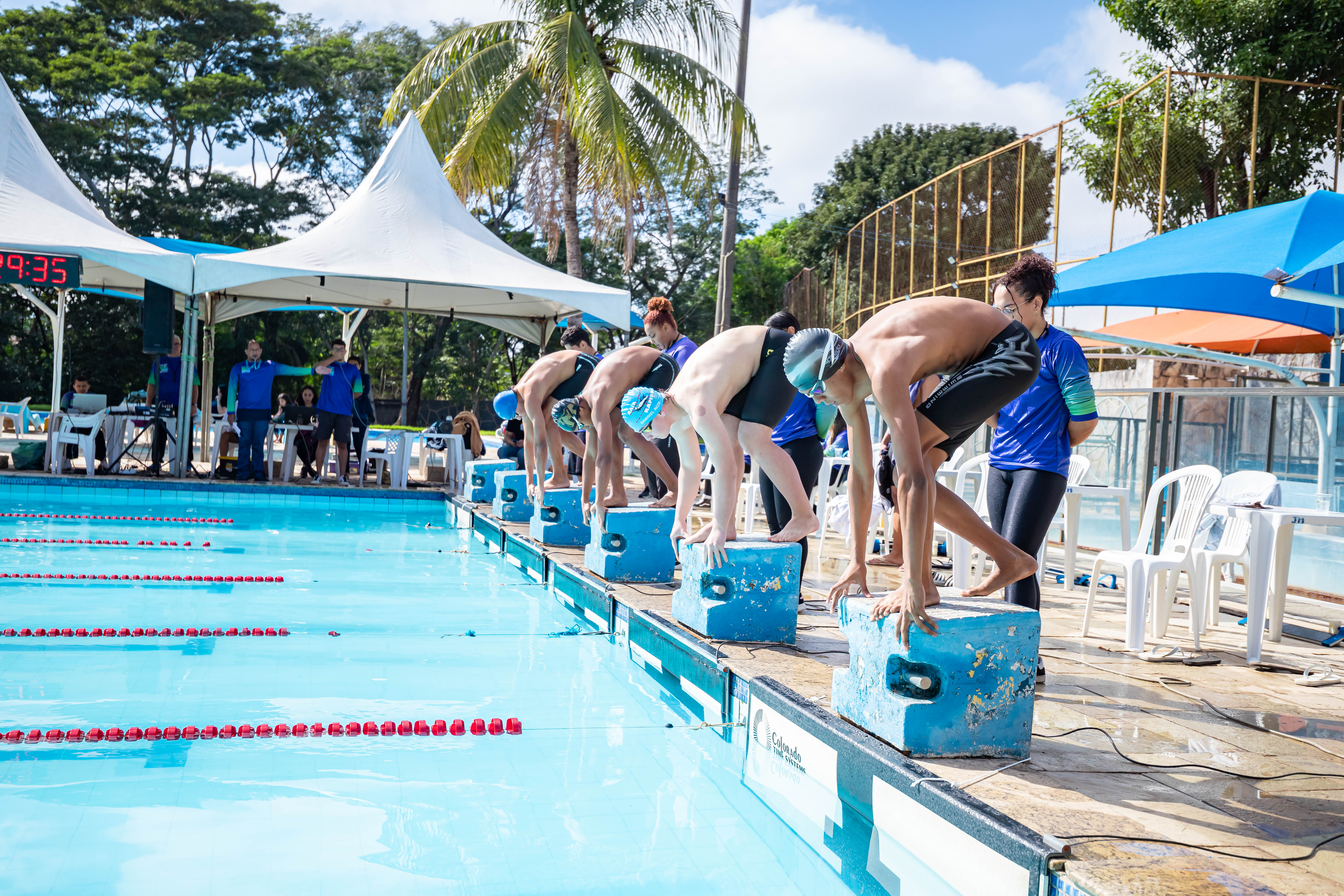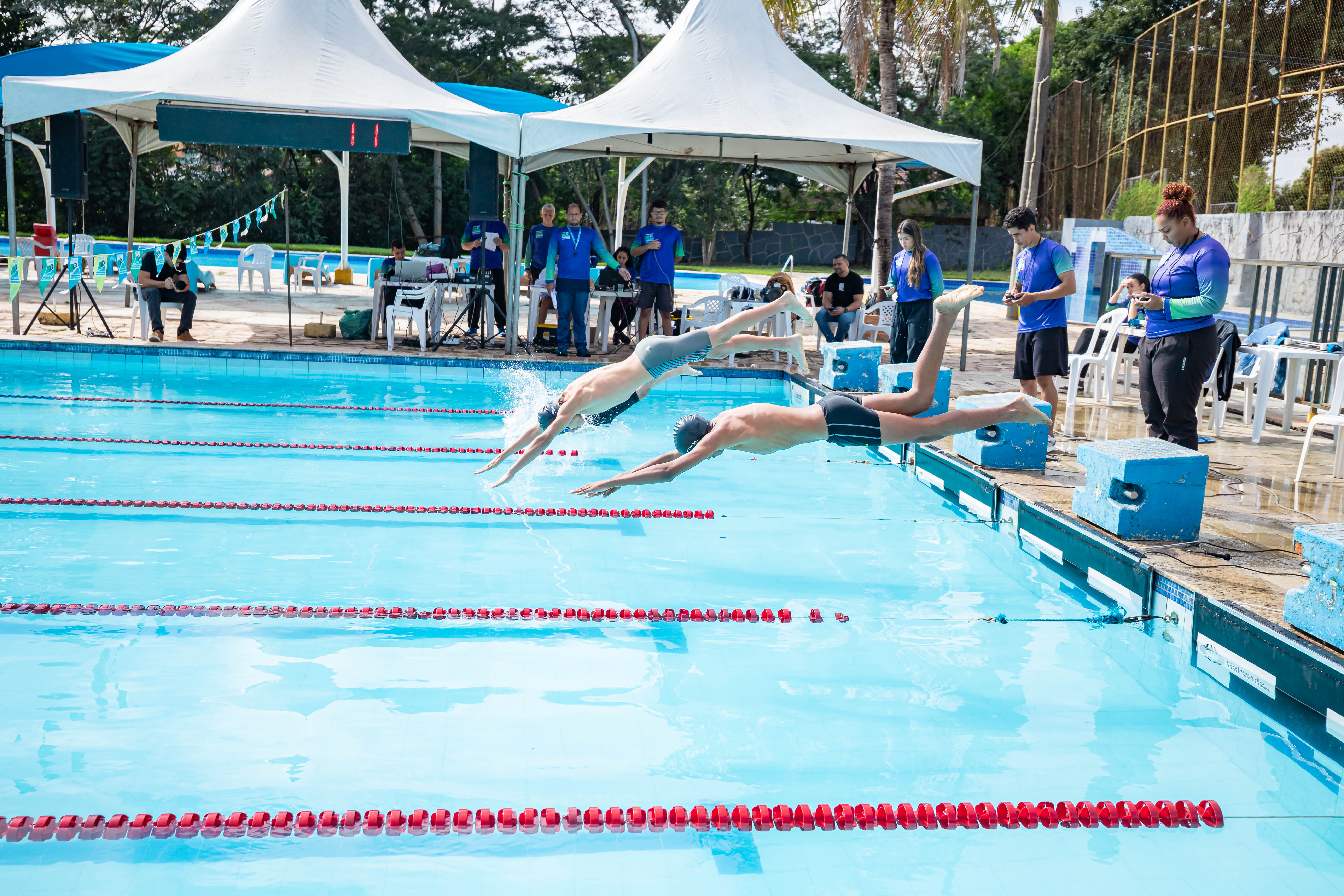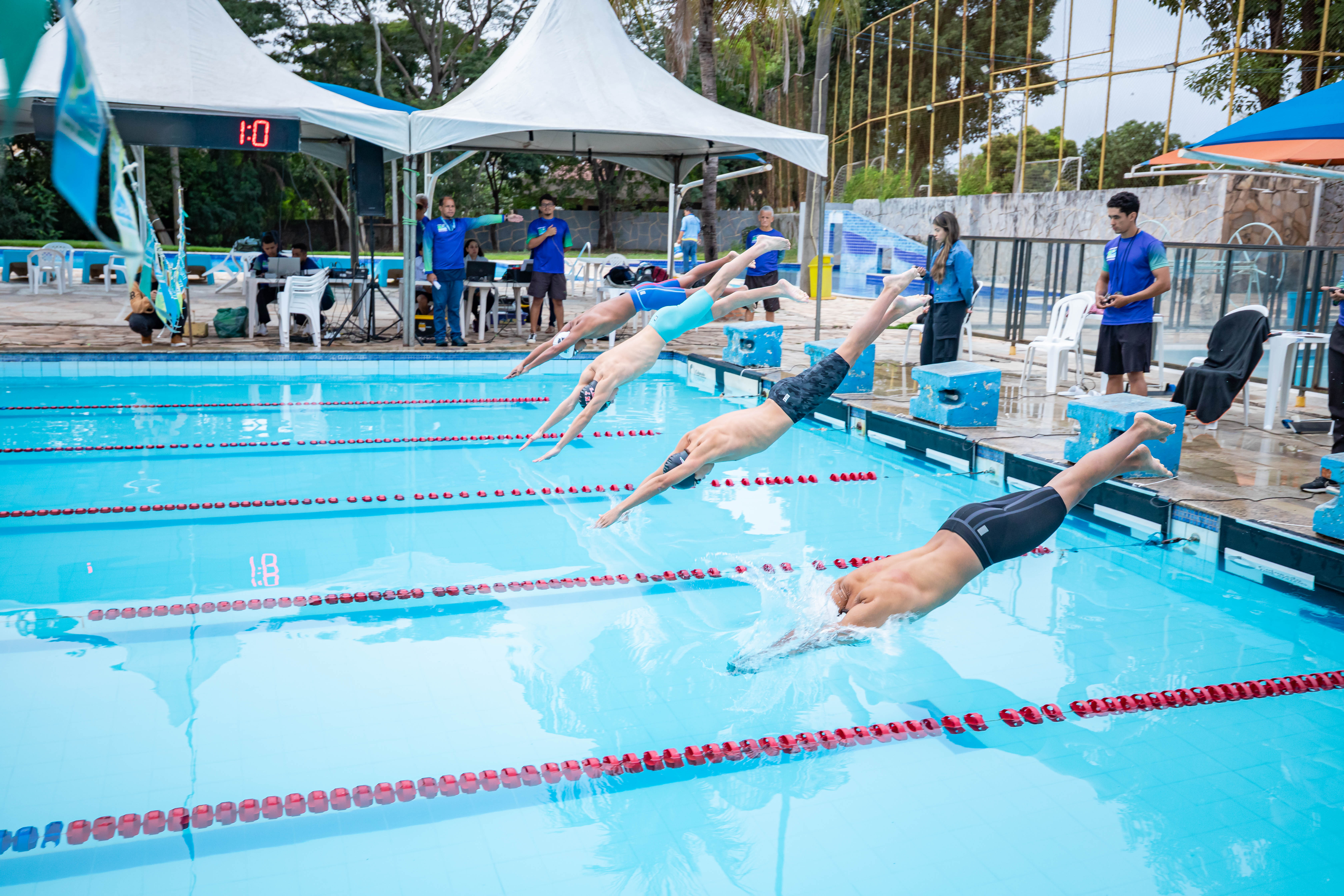 Imagem o momento da prova da categoria A – Masculino - durante os Jogos Estudantis Cuiabanos na piscina olímpicas da Associação Atlética Banco do Brasil (AABB)