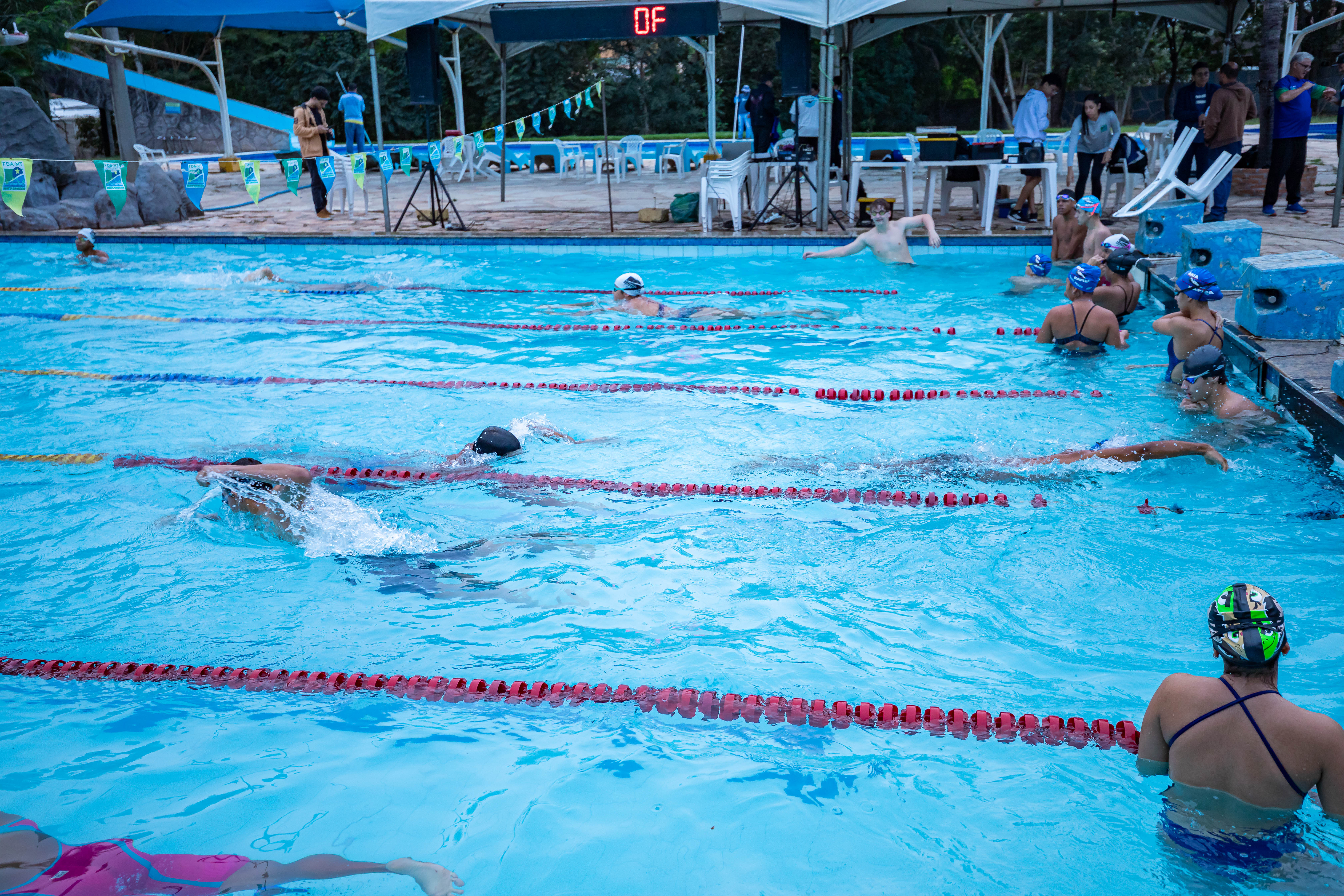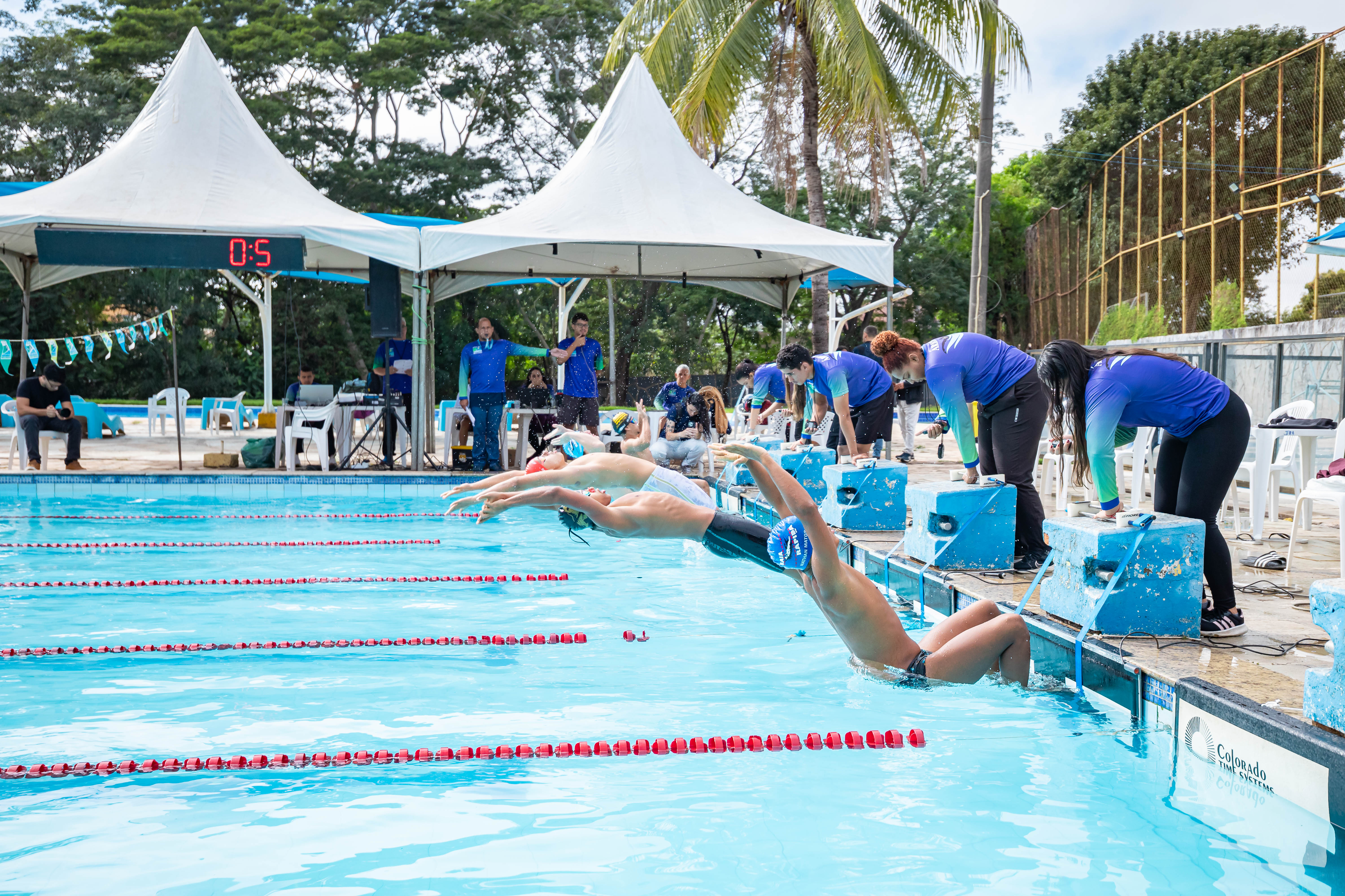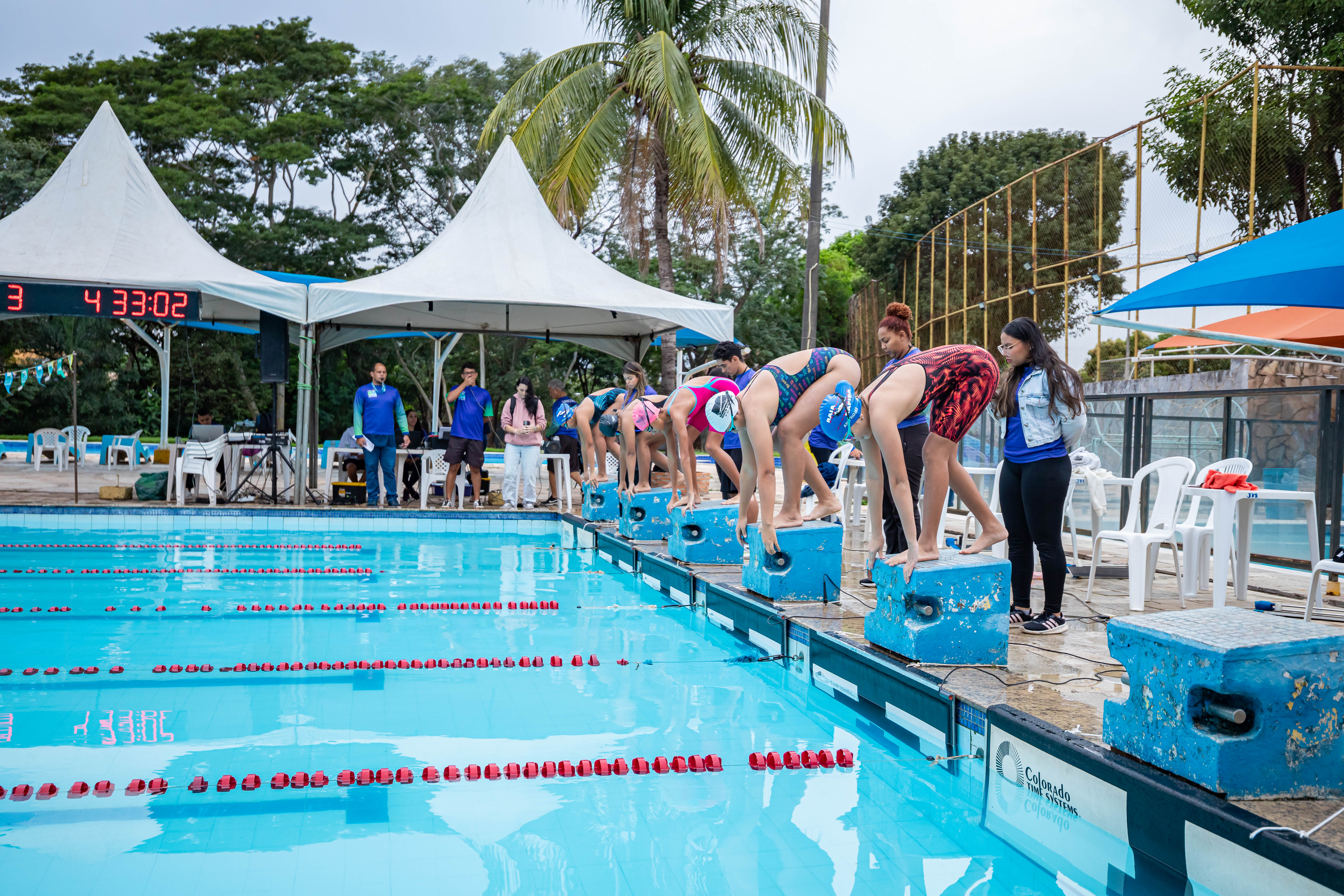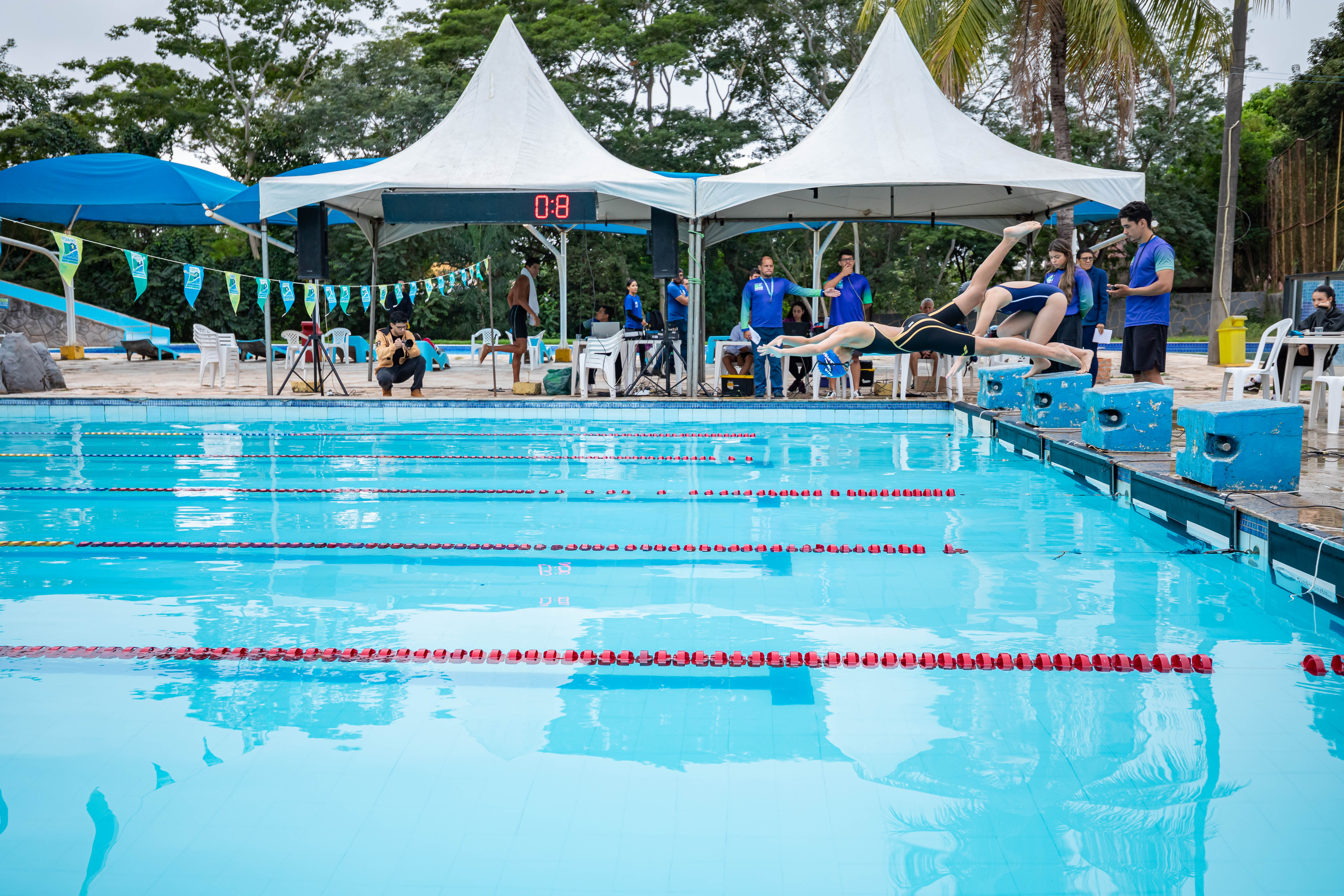 Imagem o momento da prova da categoria A – Masculino - durante os Jogos Estudantis Cuiabanos na piscina olímpicas da Associação Atlética Banco do Brasil (AABB)