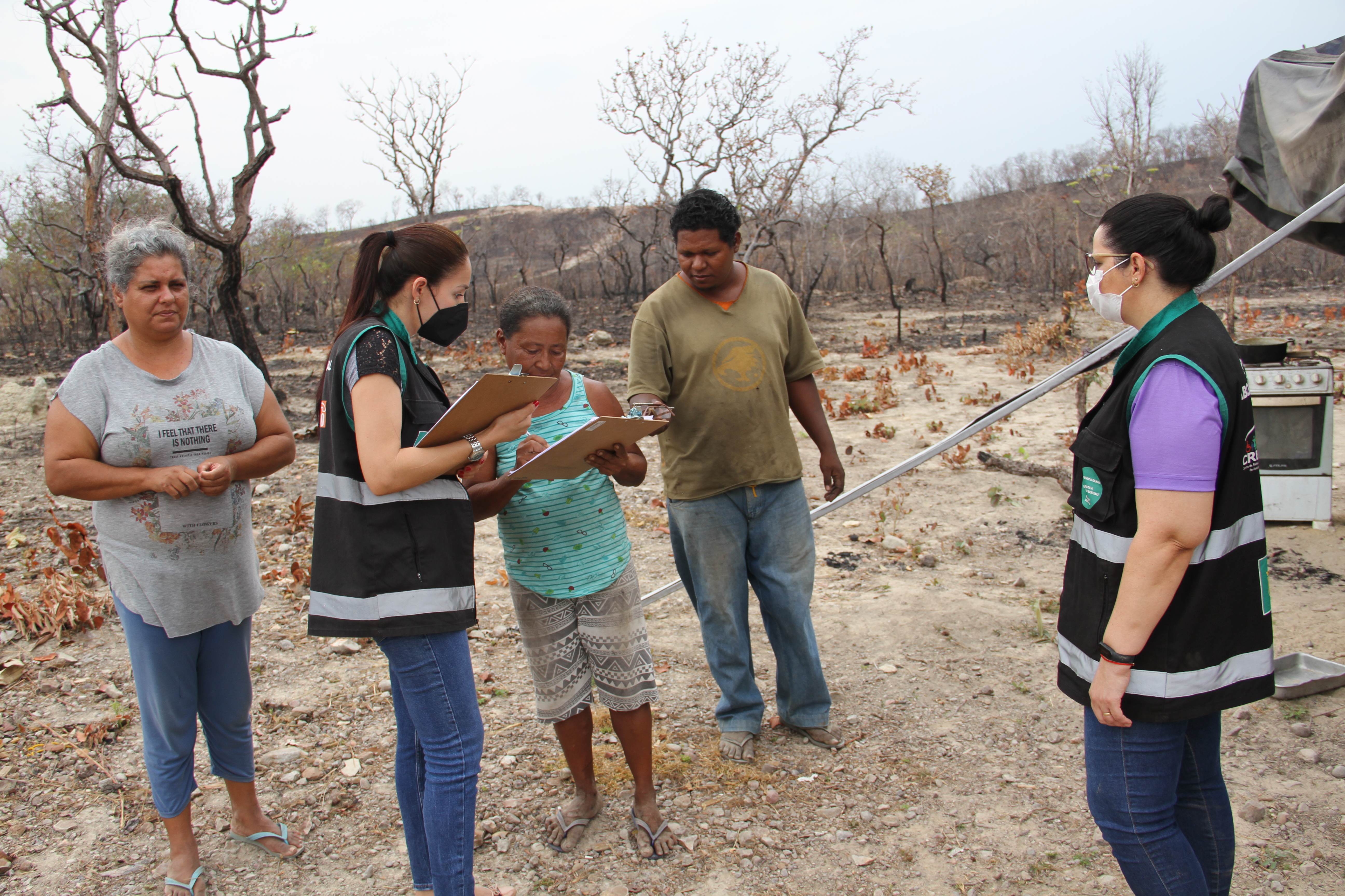 foram assistidas 17 (dezessete famílias). Os profissionais coletaram informações sobre as demandas, bem como presenciaram os tristes relatos quanto a perda de animais, plantações e sistema de água pelo fogo. “A minha tenda e cavalete pegaram fogo. Não sobrou nada”, desabafou a moradora Daniella Marques de Almeida.