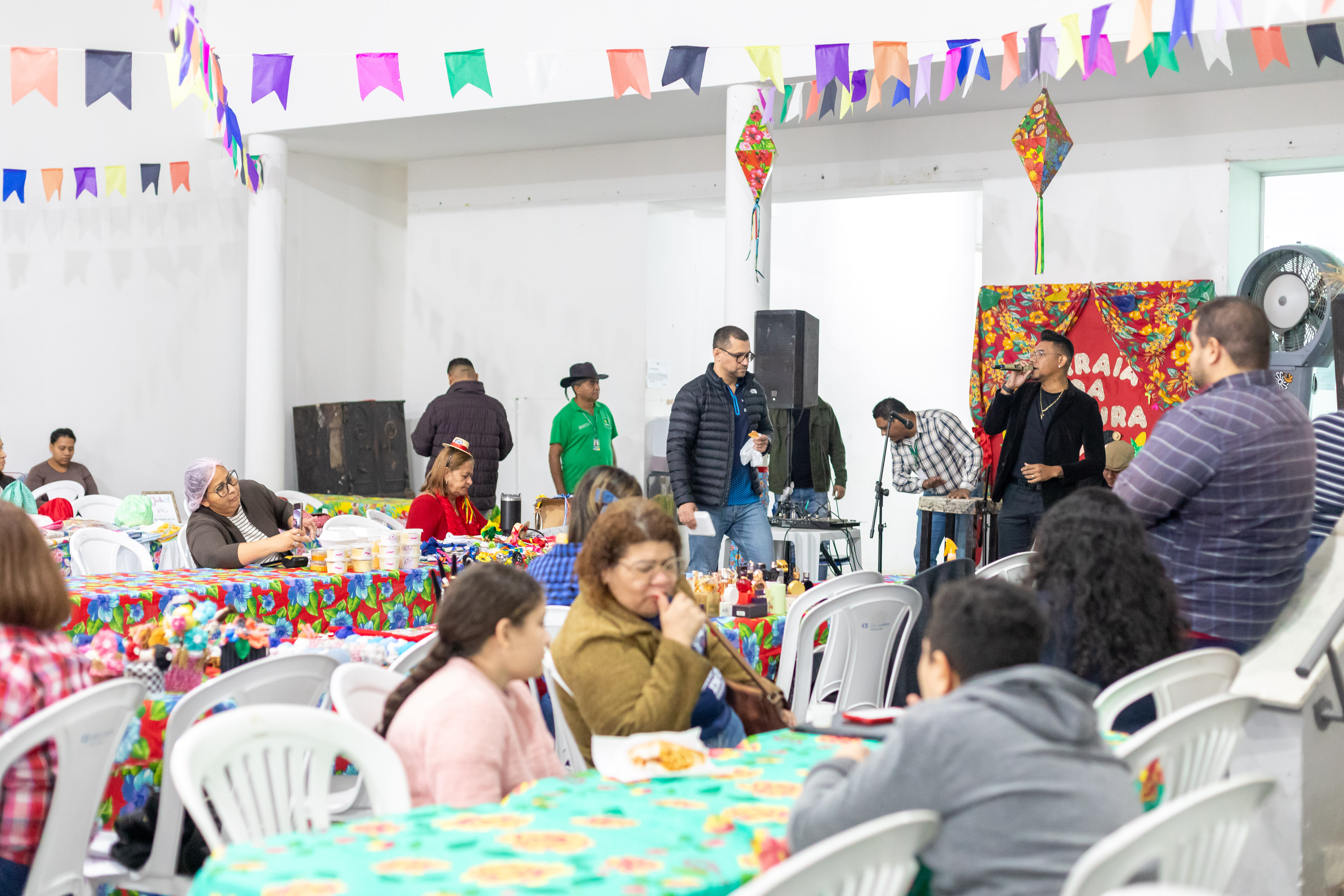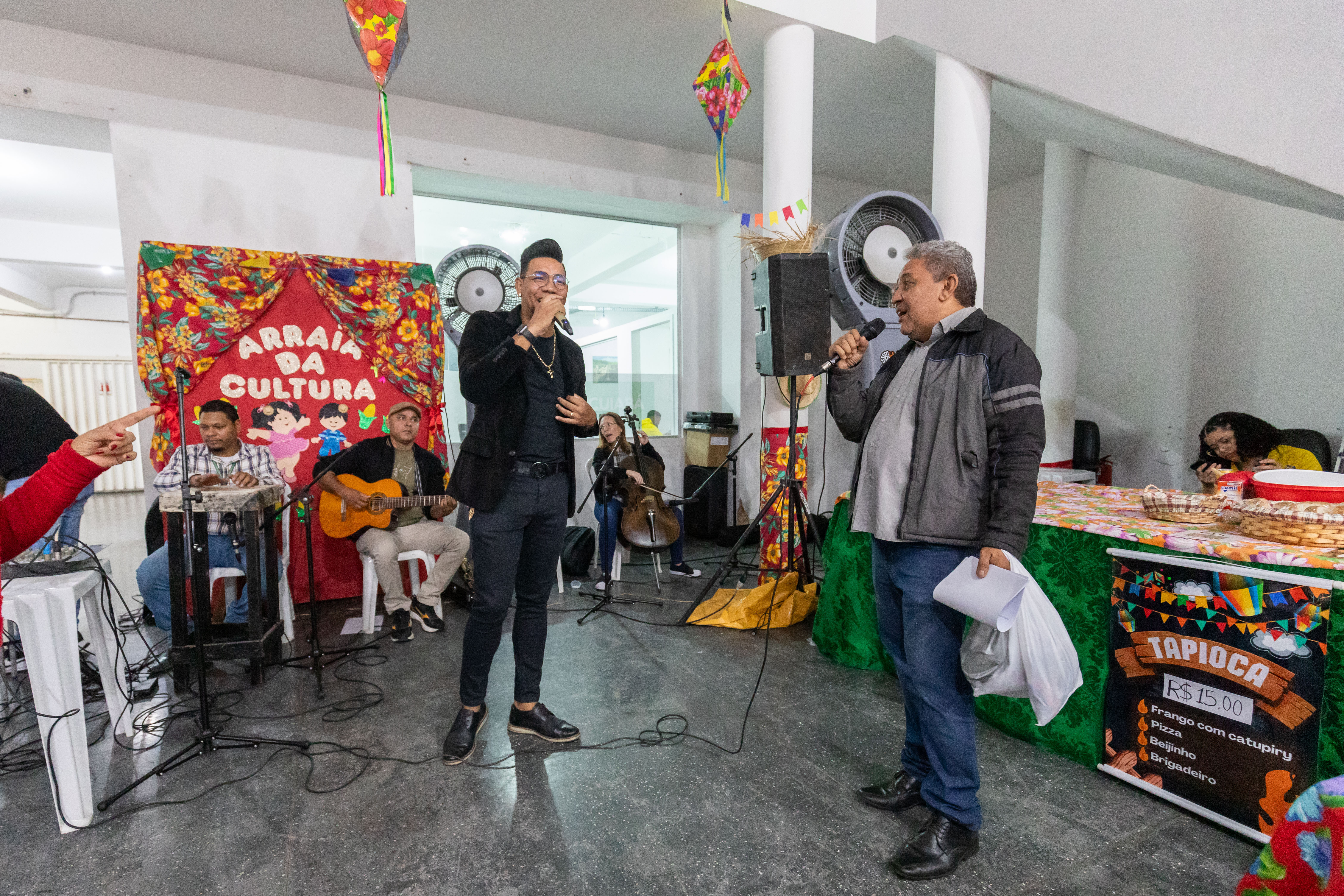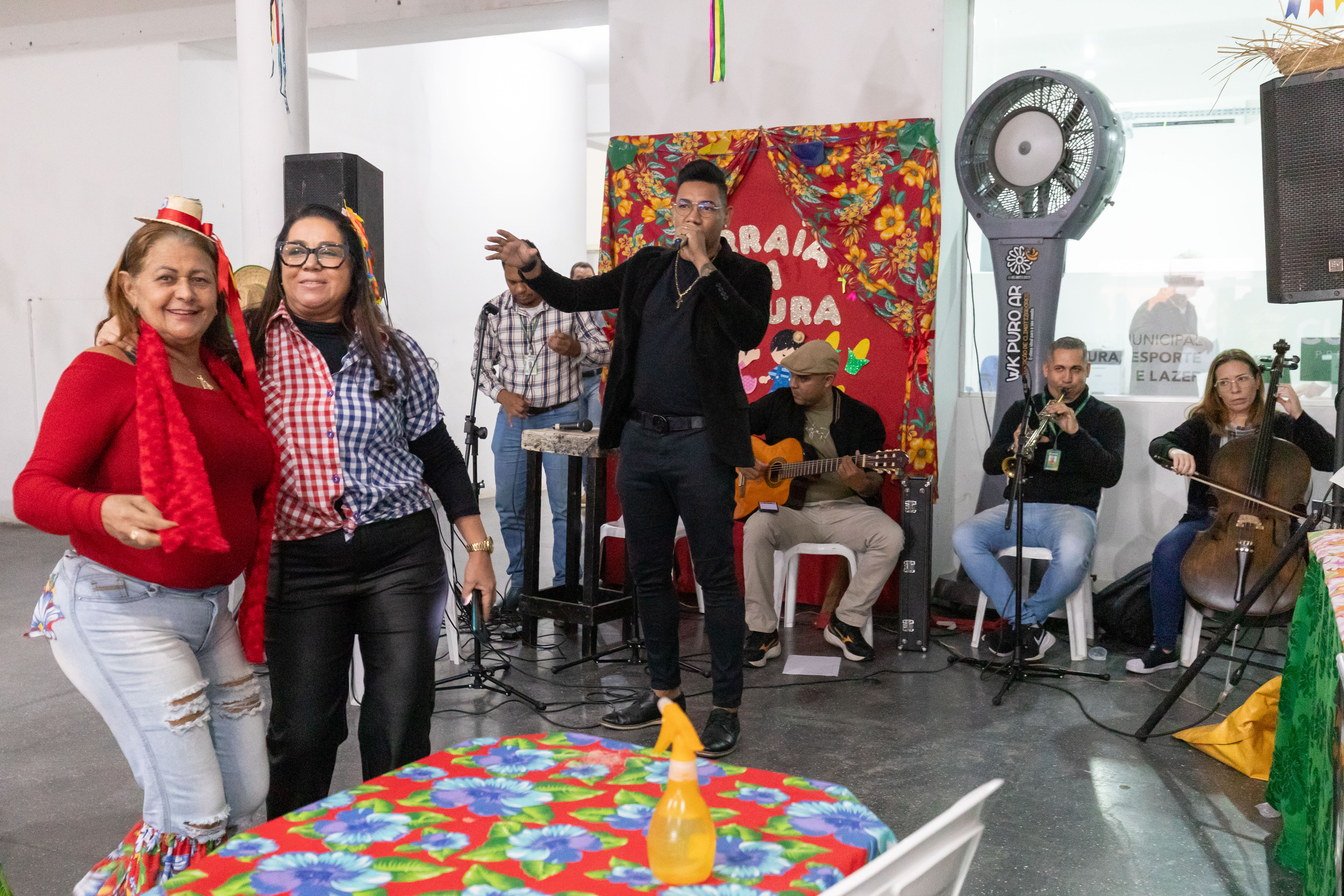Três pessoas se apresentam em um espaço fechado decorado com temática junina.