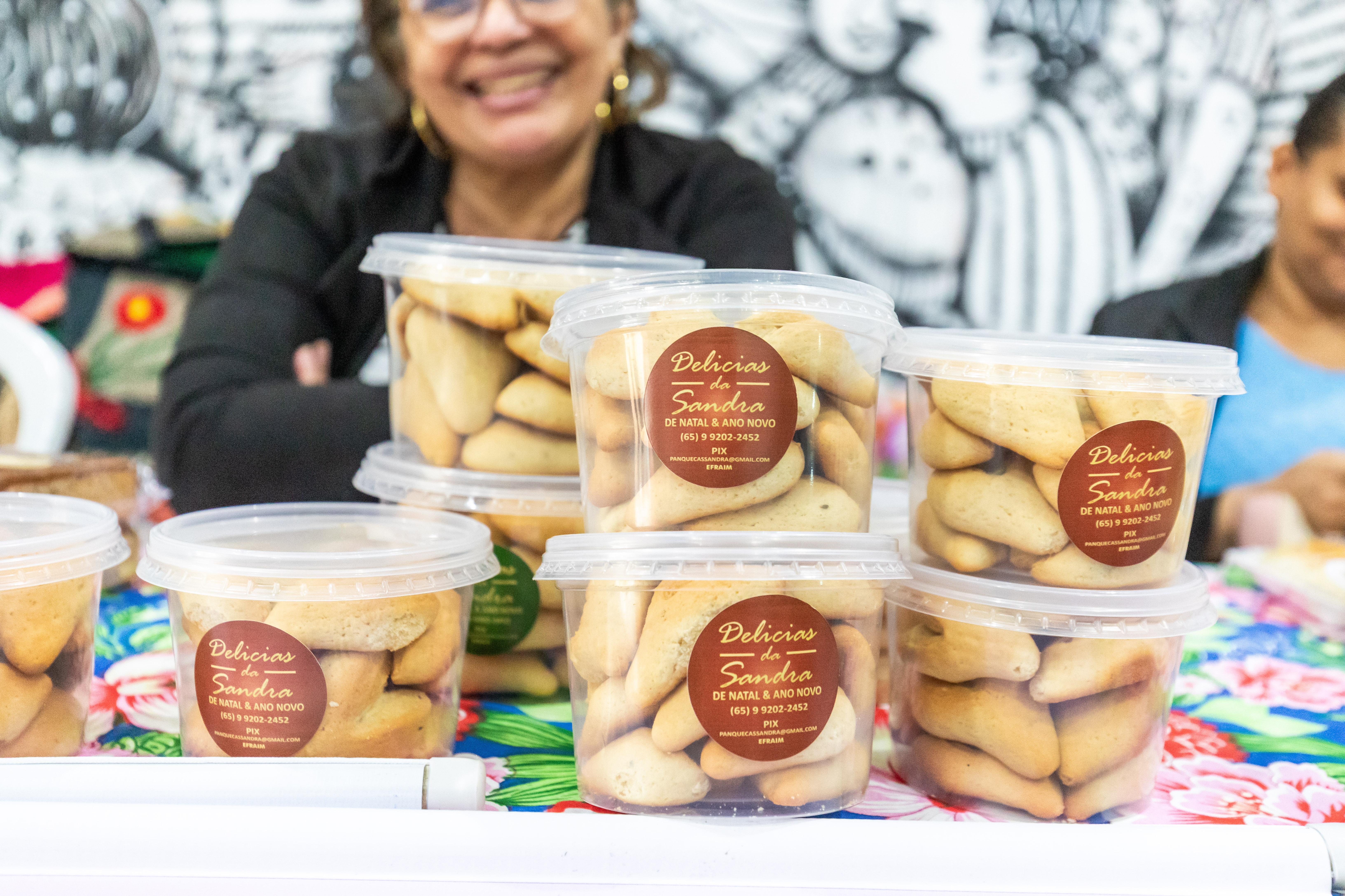 Lucy Helena Monteiro Salgado, moradora do CPA 3, produz vários itens também: chinelos bordados, tiaras para cabelo, canetas decorativas e artesanato em cabaças. “Para mim, é primordial essa oportunidade. Trabalho há mais de 25 anos e já passei por outras experiências com doces, bolos confeitados, e fui mudando. Hoje faço por necessidade de sobrevivência. Já fiz sete cirurgias no coração e os remédios são muito caros. O artesanato é uma terapia e, para mim, uma necessidade financeira”, revelou.