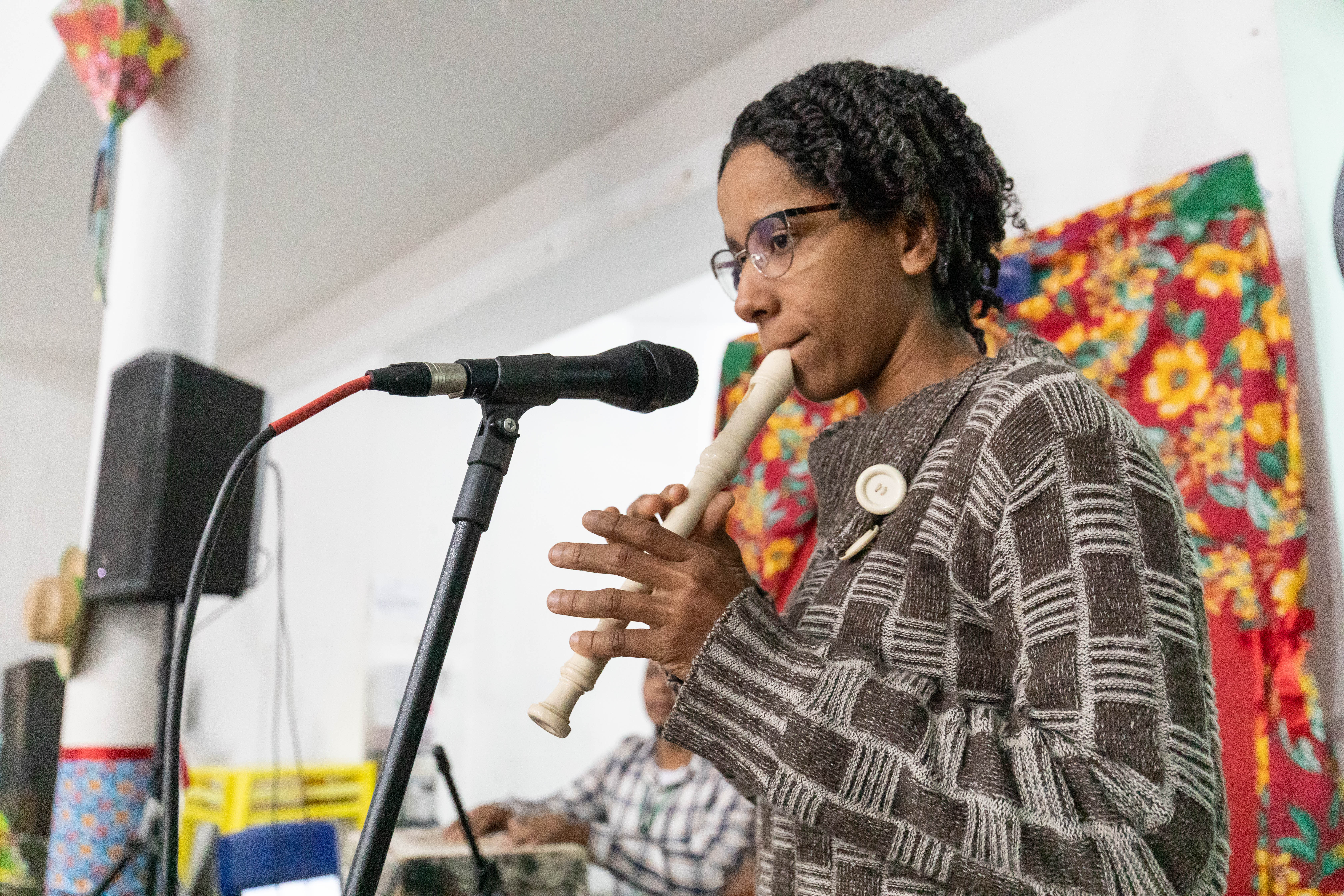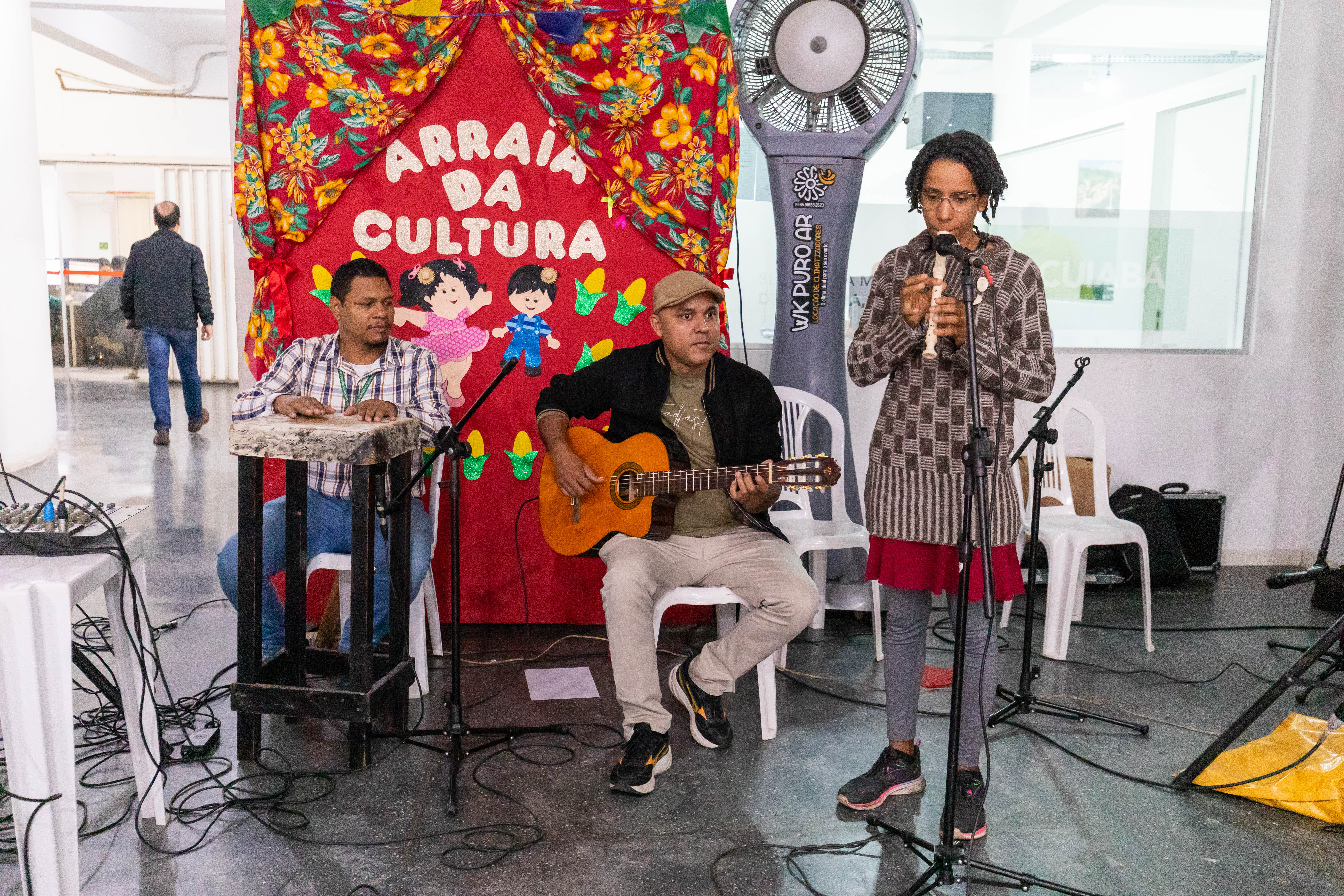 A foto mostra uma apresentação musical, tendo um homem no violão, outro no mocho e uma flautista. O cenário é composto por um painel colorido com os dizeres Arraiá da Cultura.
