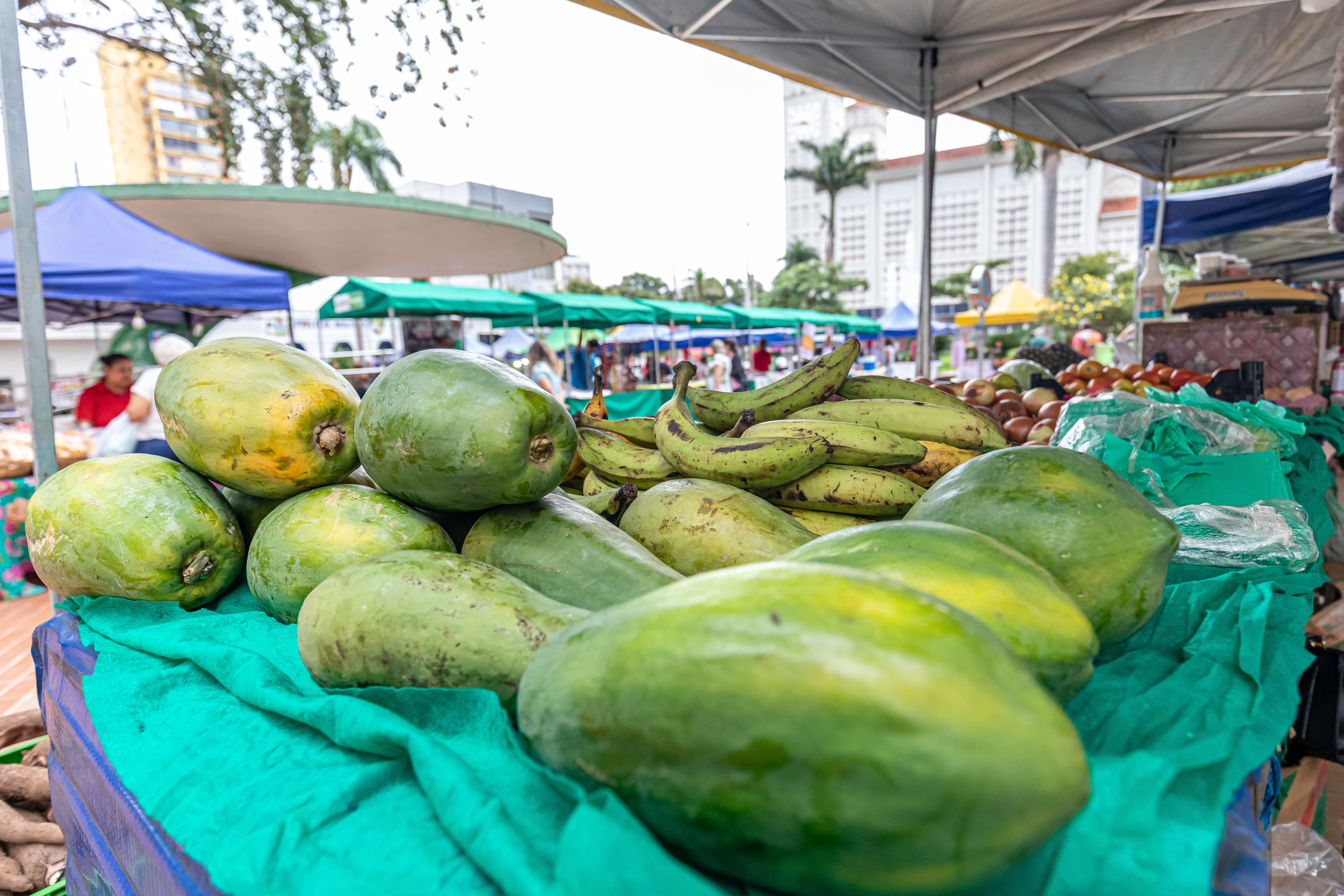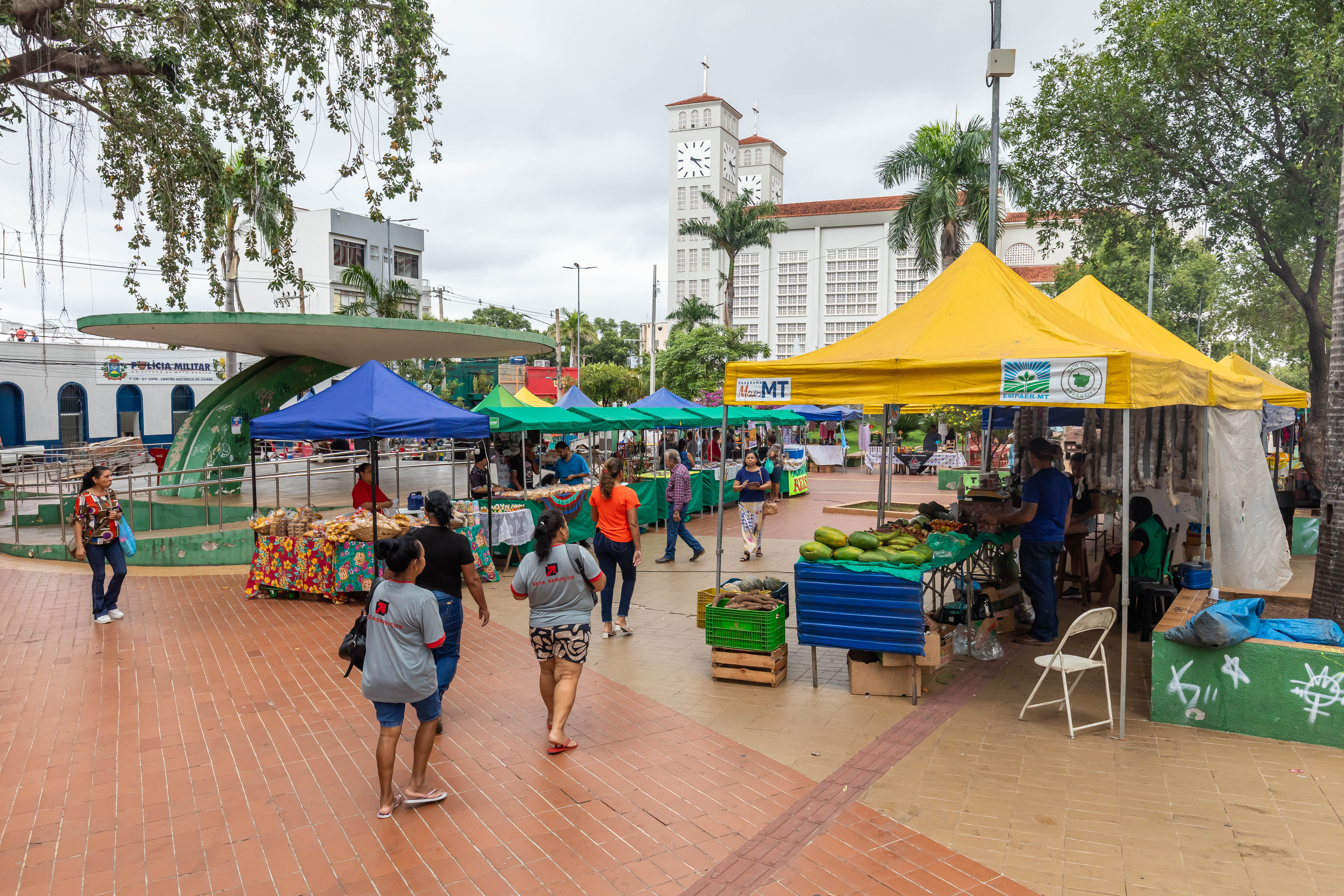 A foto mostra as bancas onde os produtos estão expostos e pessoas verificando os itens. Mamão, bananas, batatas doces estão em plano de frente da imagem. E ao fundo do cenário está a igreja Matriz de Cuiabá.